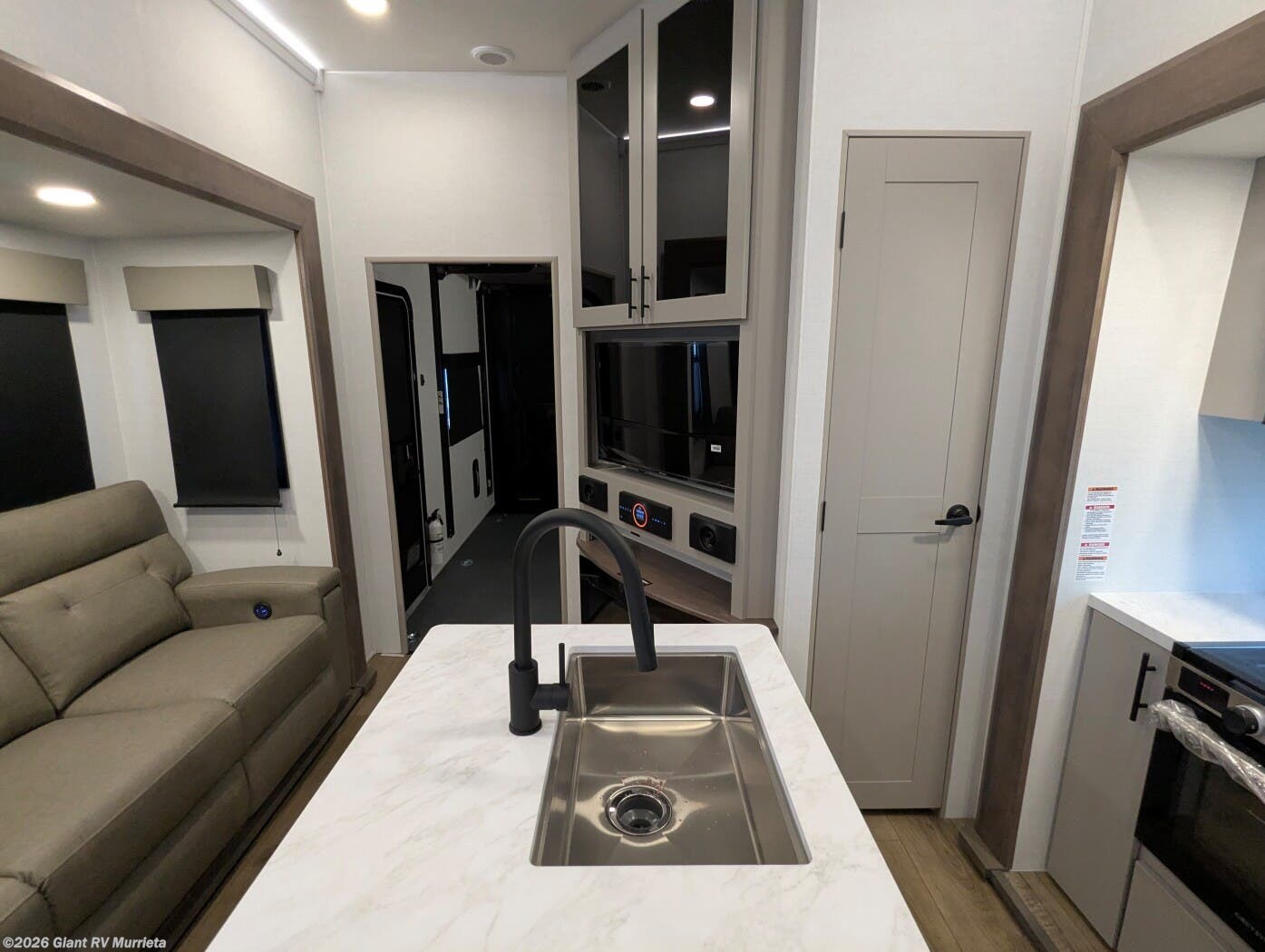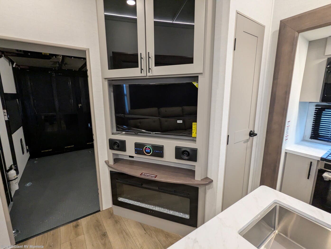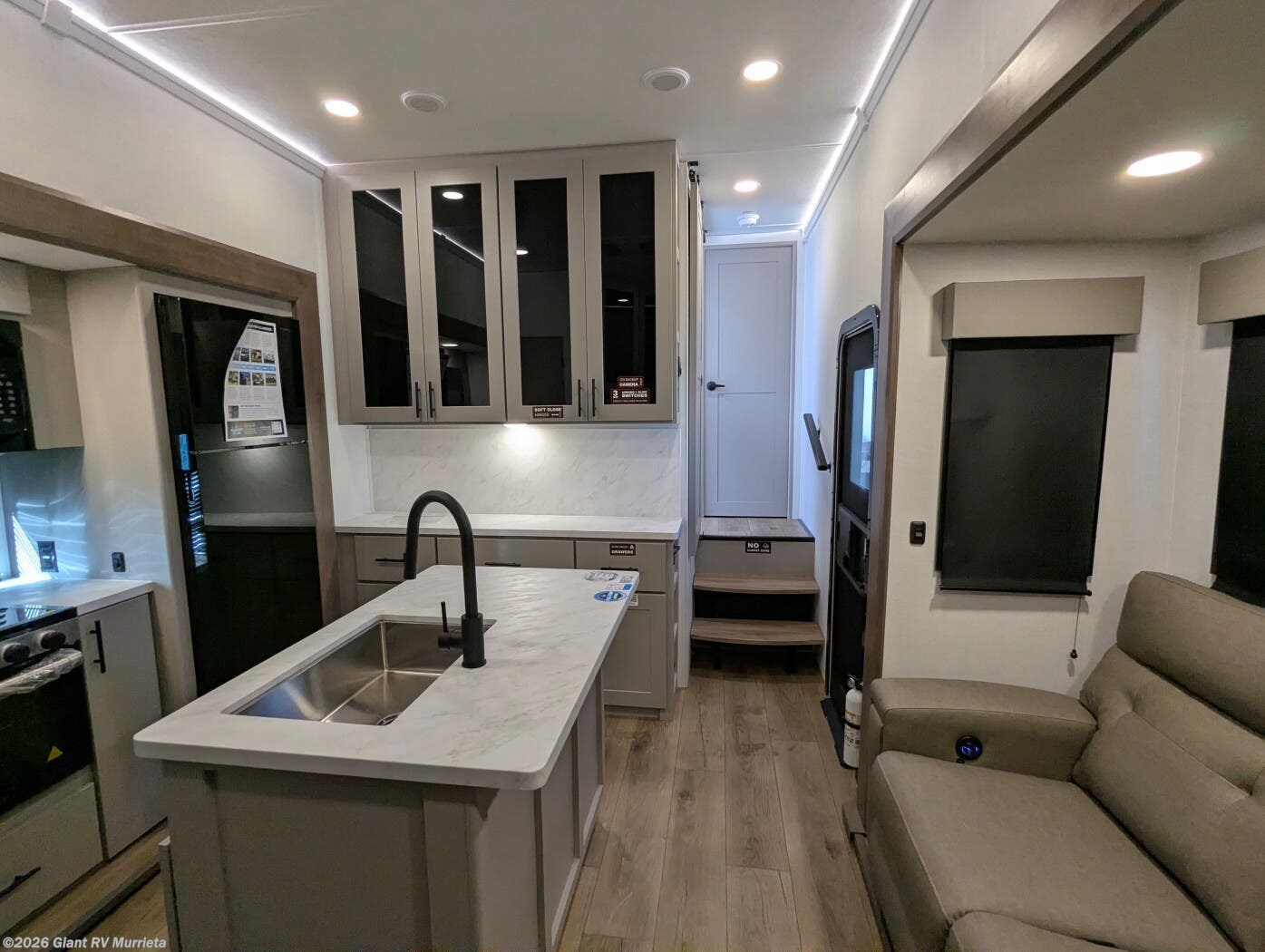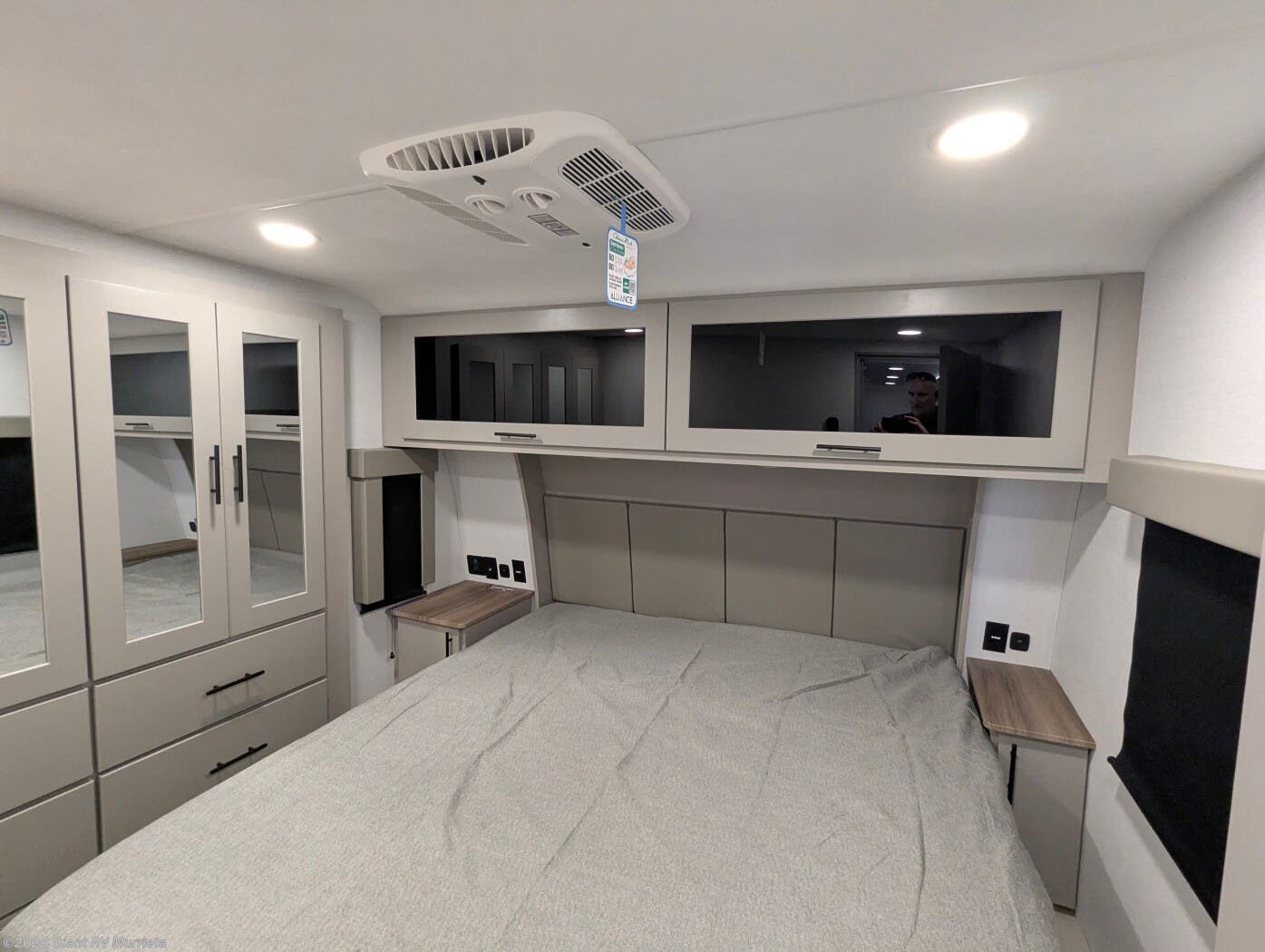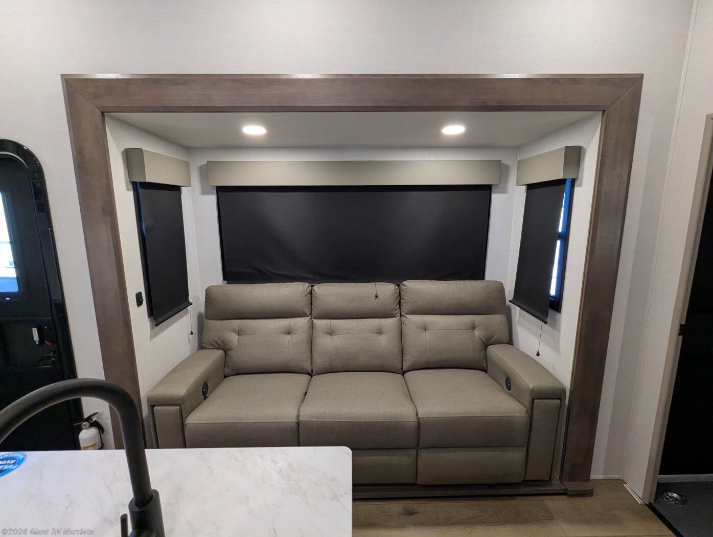 - King Bed Retreat: Includes a front private king bed, wardrobe storage, and theater seating with kitchen island for residential comfort and easy family gatherings.
