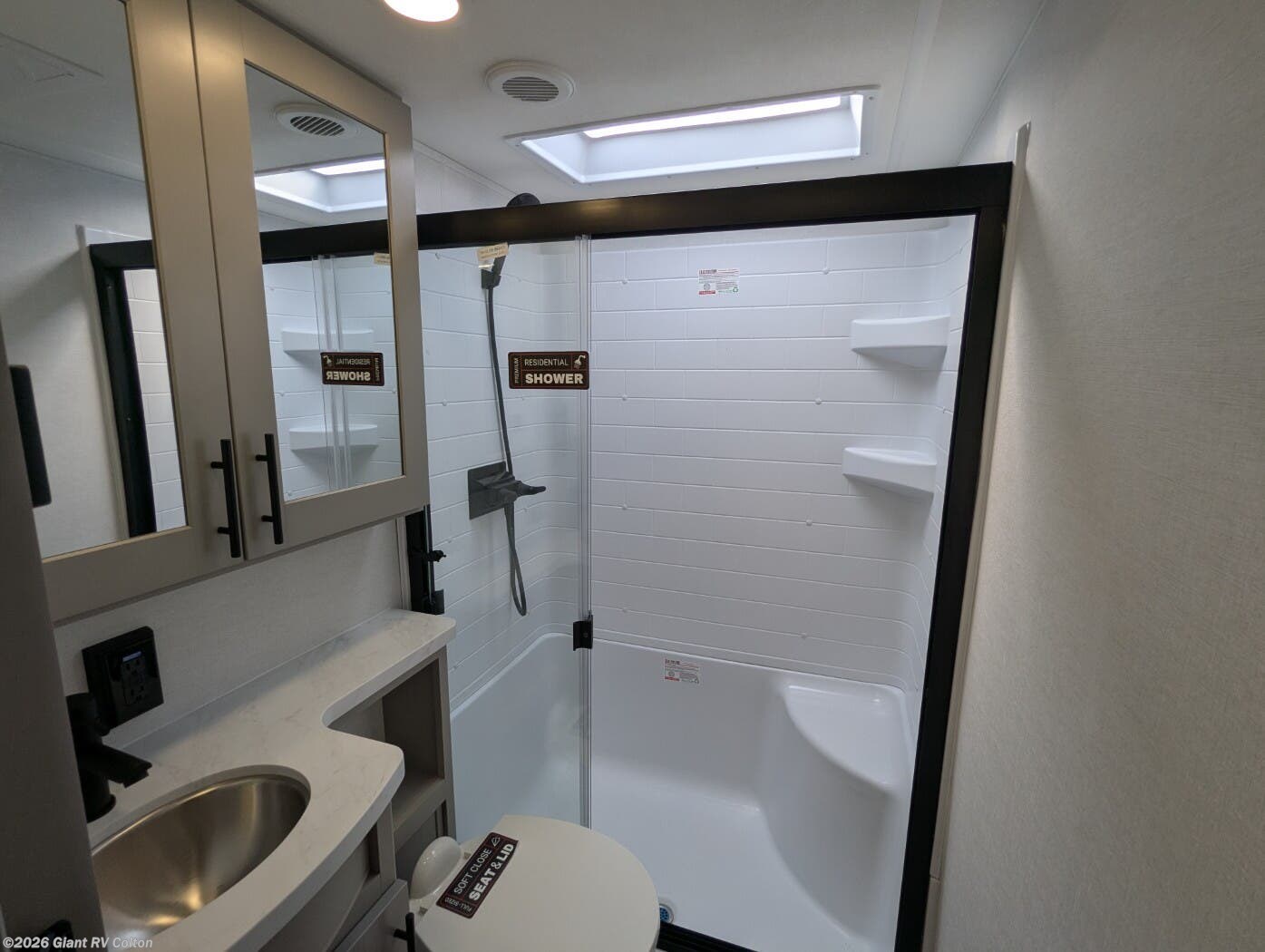 - Modern Amenities: Features a 12V refrigerator, washer/dryer, JBL sound system, and half bath in garage for convenient living.