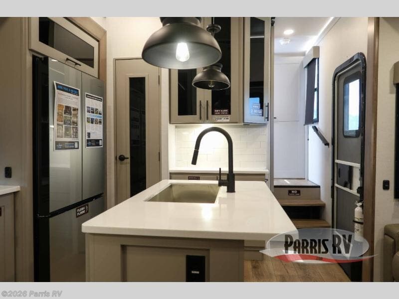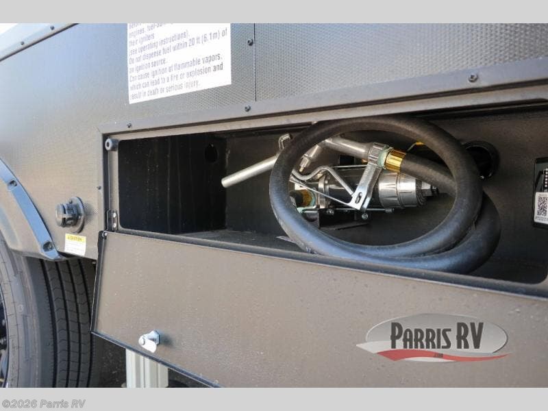 The whole family will have a fun time camping in this toy hauler! You can easily load up your toys into the 11' garage area with the 8' weather resistant ramp door and keep them filled with the dual 30 gallon fuel tanks. Once you unload your toys from the garage area, you can set up the opposing HappiJac sofas with a queen mattress above them, the loft that opens to the living room, and the half bathroom. The kitchen has everything you need to prepare your best meals including two hutches, three pantries, and a kitchen island with two bar stools to enjoy your morning coffee and eggs. The dual entry bathroom has a 48" x 30" shower and leads directly into the front private bedroom. Inside the bedroom is a king bed slide for more floor space, a flip top dresser, and a front wardrobe with washer and dryer prep!