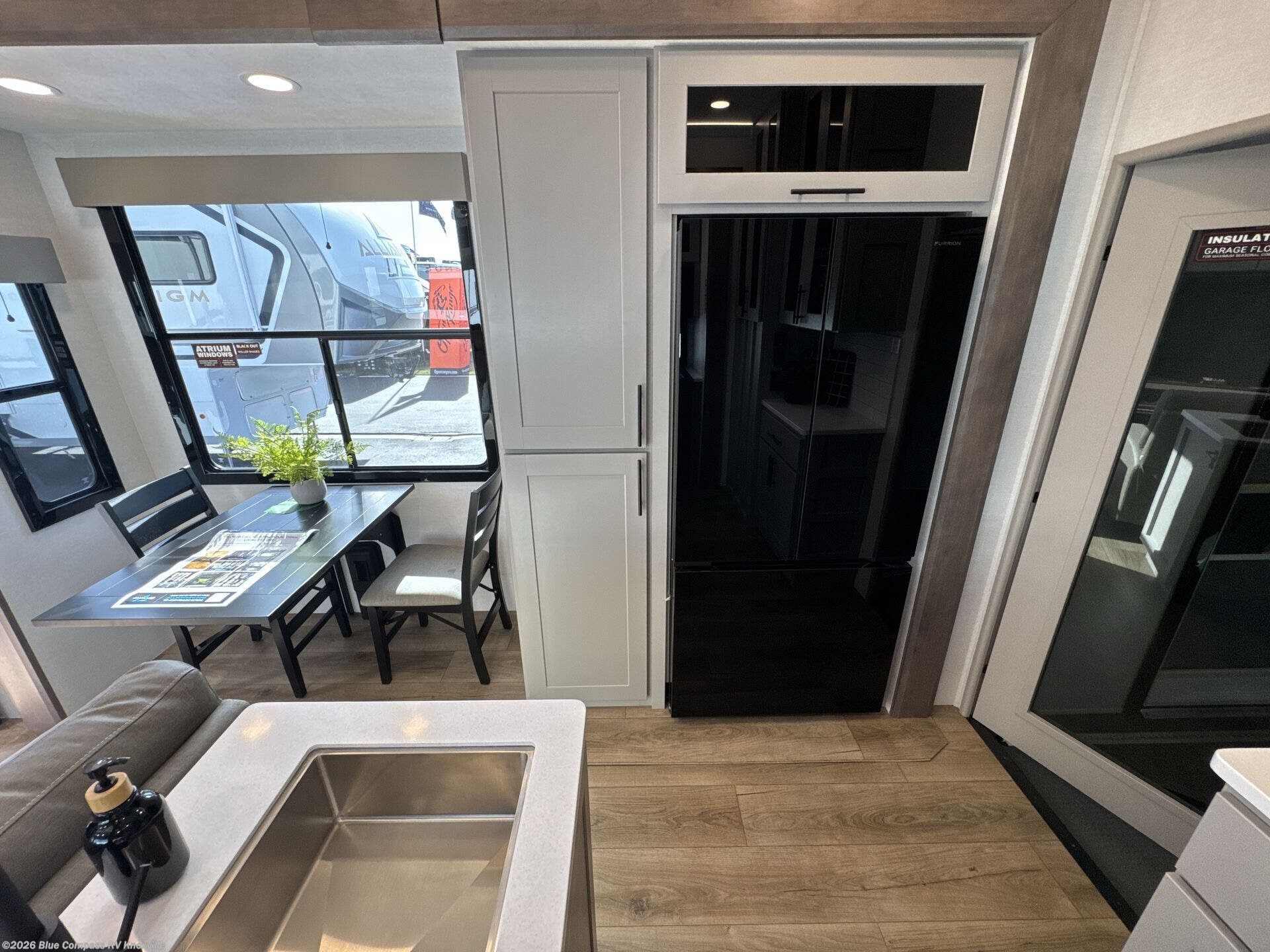 This spacious toy hauler will be perfect for weekend trips to the lake or woods! Once you've unloaded your toys from the 11' separate garage, you can relax on the 60" dual opposing sofas or set up the HappiJac bed for guests if it's getting late. There is also a 30" x 72" bunk/loft bed above the garage, a 40" garage TV, and a half bath for added convenience. As you head into the kitchen area, you'll find ample counter space to prep meals, along with a buffet, a spacious pantry and a 12V refrigerator for perishables. You can dine together at the dinette with chairs, then head to the L-shaped sofa across from the fireplace and 65" TV for movie night. The full bath includes an entrance from the hallway and into the front master bedroom. Here, you'll enjoy a king bed slide out, a flip-up dresser with a 32" TV, plus a front wardrobe with washer and dryer prep if you plan to go full-time!