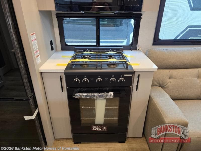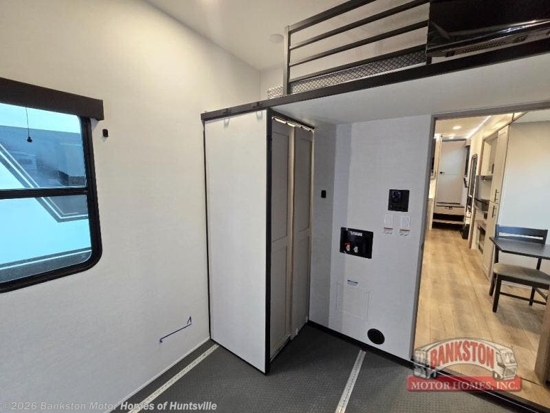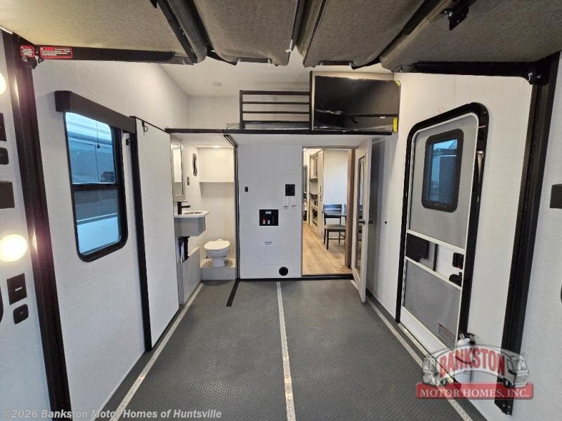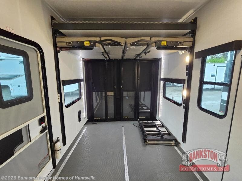 There is room for your off-road toys and the whole family in this toy hauler! The bath and a half makes life more convenient and the dual entry doors create a smooth flow of traffic in and out of the unit. Aside from 13' of garage space and an entrance/exit door, there are also opposing 60" sofas with a HappiJac queen bed above them, a loft that opens to the garage, and a half bathroom. The chef can prepare their best meals with the four-burner cooktop while your crew plays a game at the free-standing dinette with chairs. After a fun day on the trails, wash up in the full bathroom with the 48" x 30" shower, grab your pajamas from the front wardrobe or flip top dresser in the front private bedroom, and sleep soundly on the king bed slide out!