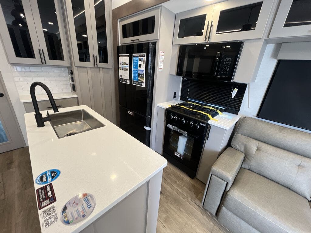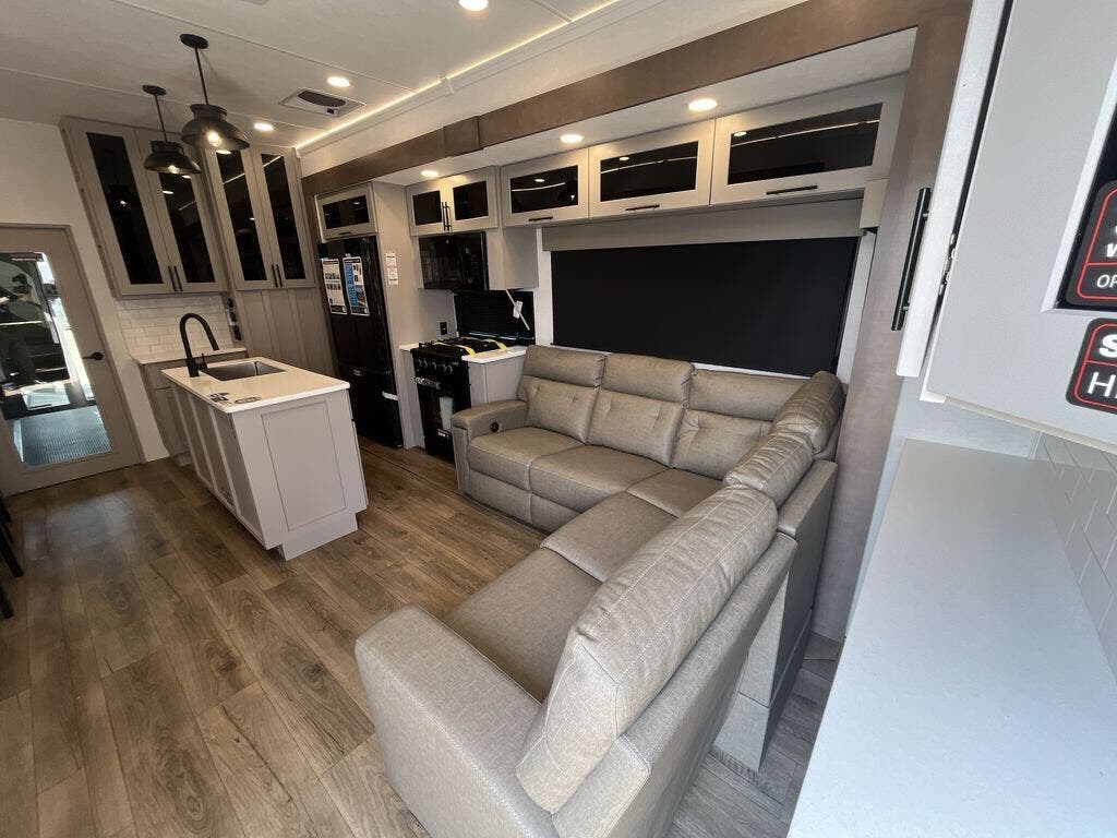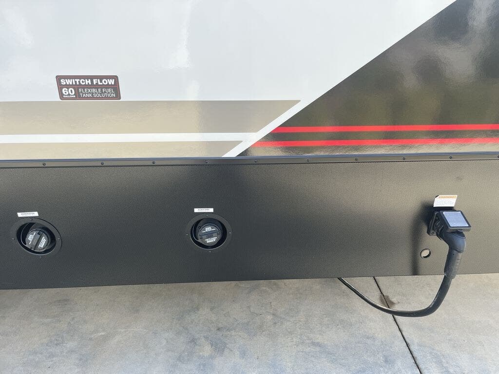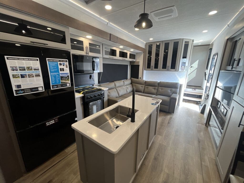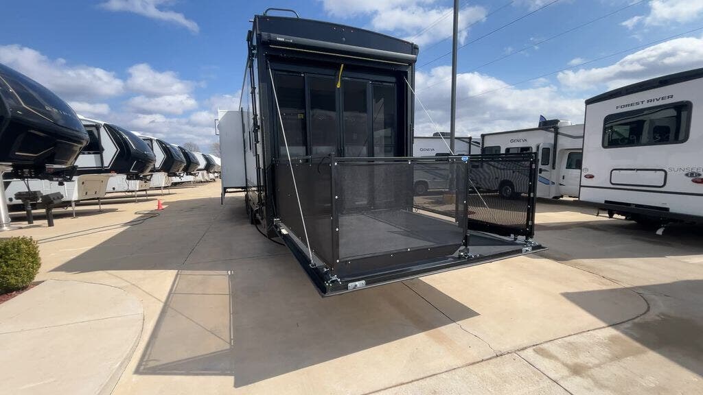 You can bring your toys with you wherever you go with any one of these Alliance RV Valor toy hauler fifth wheels! They are adventure-ready with a quality build from the walk on roof with seamless PVC roof covering to the commercial grade vinyl flooring and MorRyde CRE3000 suspension system. The Performance Running Gear package comes with a 101" wide-body benchmark chassis platform, 7,000 lb. Dexter axles, and a space enhancing drop frame storage compartment to pack in all your riding gear. You can even go off-gridding thanks to the Off the Grid Pack that has two 400-watt solar panels, generator prep, a 60-amp charge controller, and a 100-amp hour lithium iron phosphate battery. Some of the interior comforts you will enjoy are the hardwood cabinet doors and drawers, solid surface kitchen countertops, and commercial grade vinyl flooring with no carpet to make clean up a breeze. The Valor toy haulers are also the Masters of 12 Volt with USB charging station throughout, a 12V refrigerator, and more 12-volt features to make camping hassle-free!