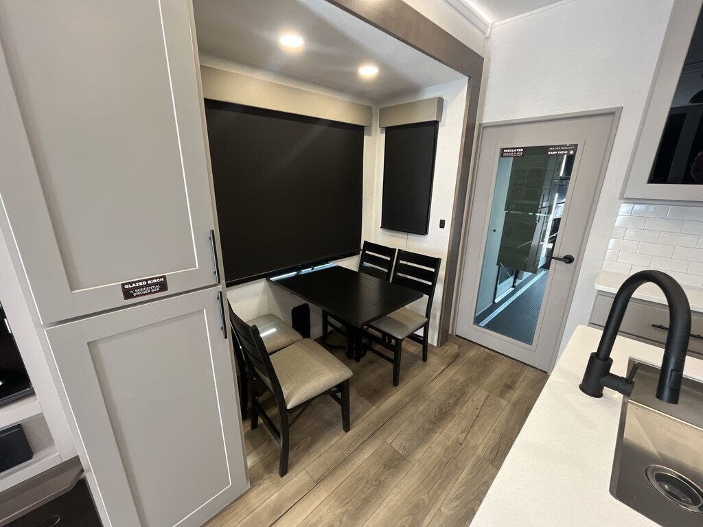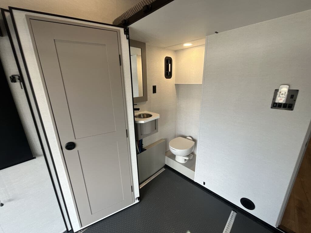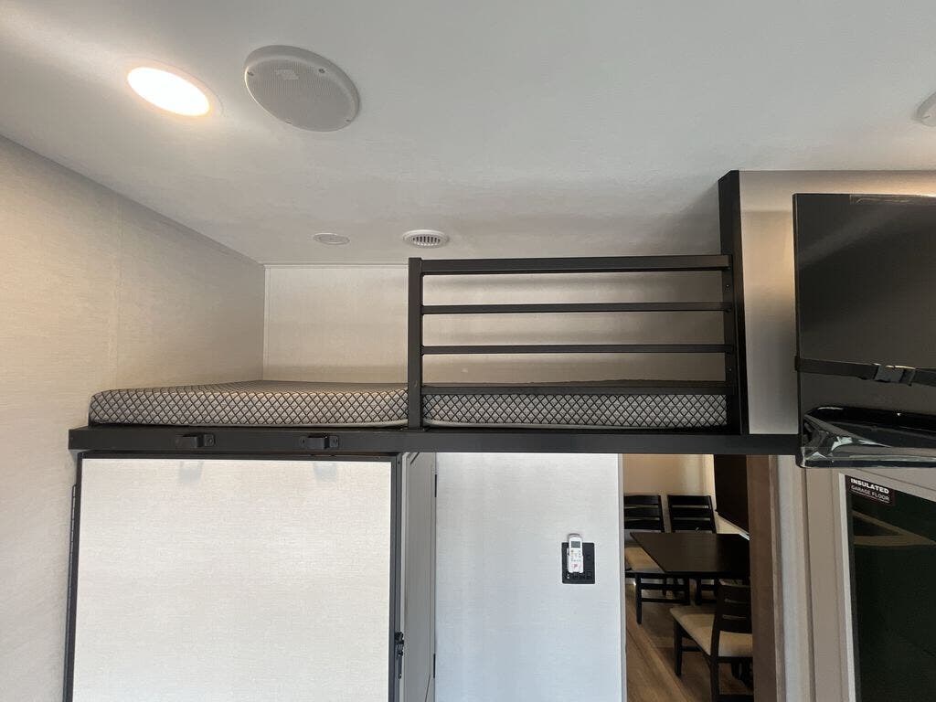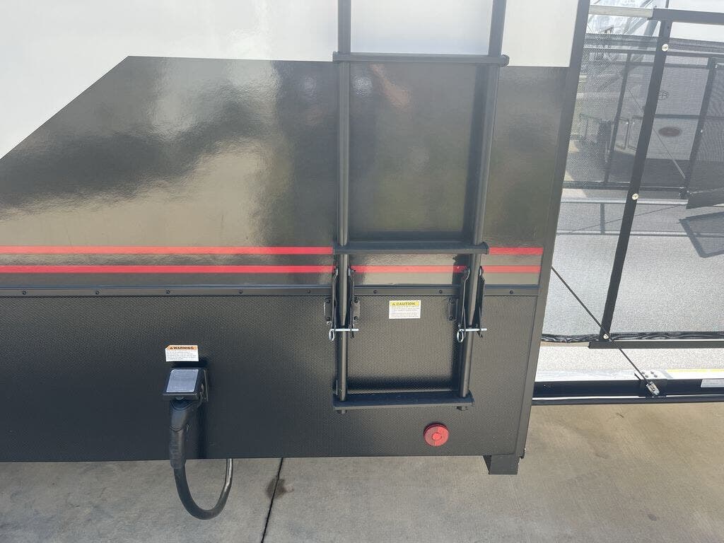 There is room for your off-road toys and the whole family in this toy hauler! The bath and a half makes life more convenient and the dual entry doors create a smooth flow of traffic in and out of the unit. Aside from 13' of garage space and an entrance/exit door, there are also opposing 60" sofas with a HappiJac queen bed above them, a loft that opens to the garage, and a half bathroom. The chef can prepare their best meals with the four-burner cooktop while your crew plays a game at the free-standing dinette with chairs. After a fun day on the trails, wash up in the full bathroom with the 48" x 30" shower, grab your pajamas from the front wardrobe or flip top dresser in the front private bedroom, and sleep soundly on the king bed slide out!