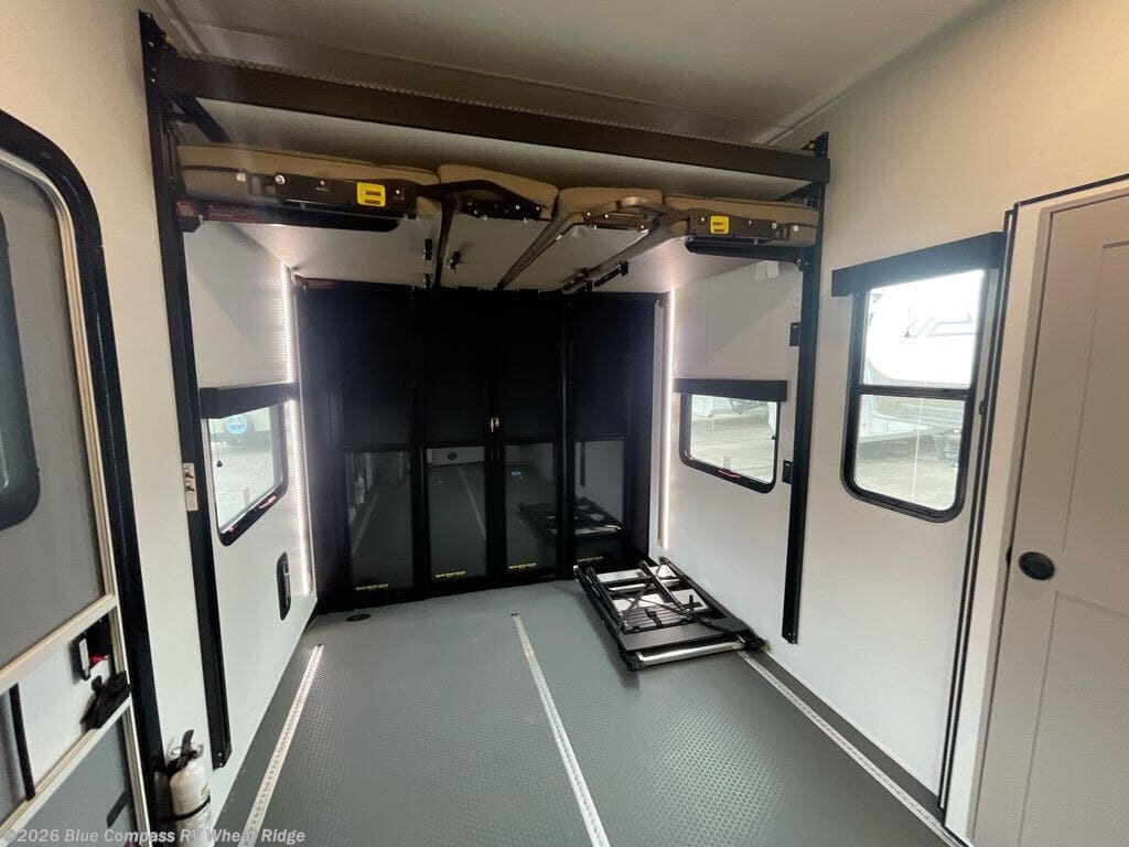 You can bring your toys with you wherever you go with any one of these Alliance RV Valor toy hauler fifth wheels! They are adventure-ready with a quality build from the walk on roof with seamless PVC roof covering to the commercial grade vinyl flooring and MorRyde CRE3000 suspension system. The Performance Running Gear package comes with a 101" wide-body benchmark chassis platform, 7,000 lb. Dexter axles, and a space enhancing drop frame storage compartment to pack in all your riding gear. You can even go off-gridding thanks to the Off the Grid Pack that has two 400-watt solar panels, generator prep, a 60-amp charge controller, and a 100-amp hour lithium iron phosphate battery. Some of the interior comforts you will enjoy are the hardwood cabinet doors and drawers, solid surface kitchen countertops, and commercial grade vinyl flooring with no carpet to make clean up a breeze. The Valor toy haulers are also the Masters of 12 Volt with USB charging station throughout, a 12V refrigerator, and more 12-volt features to make camping hassle-free!