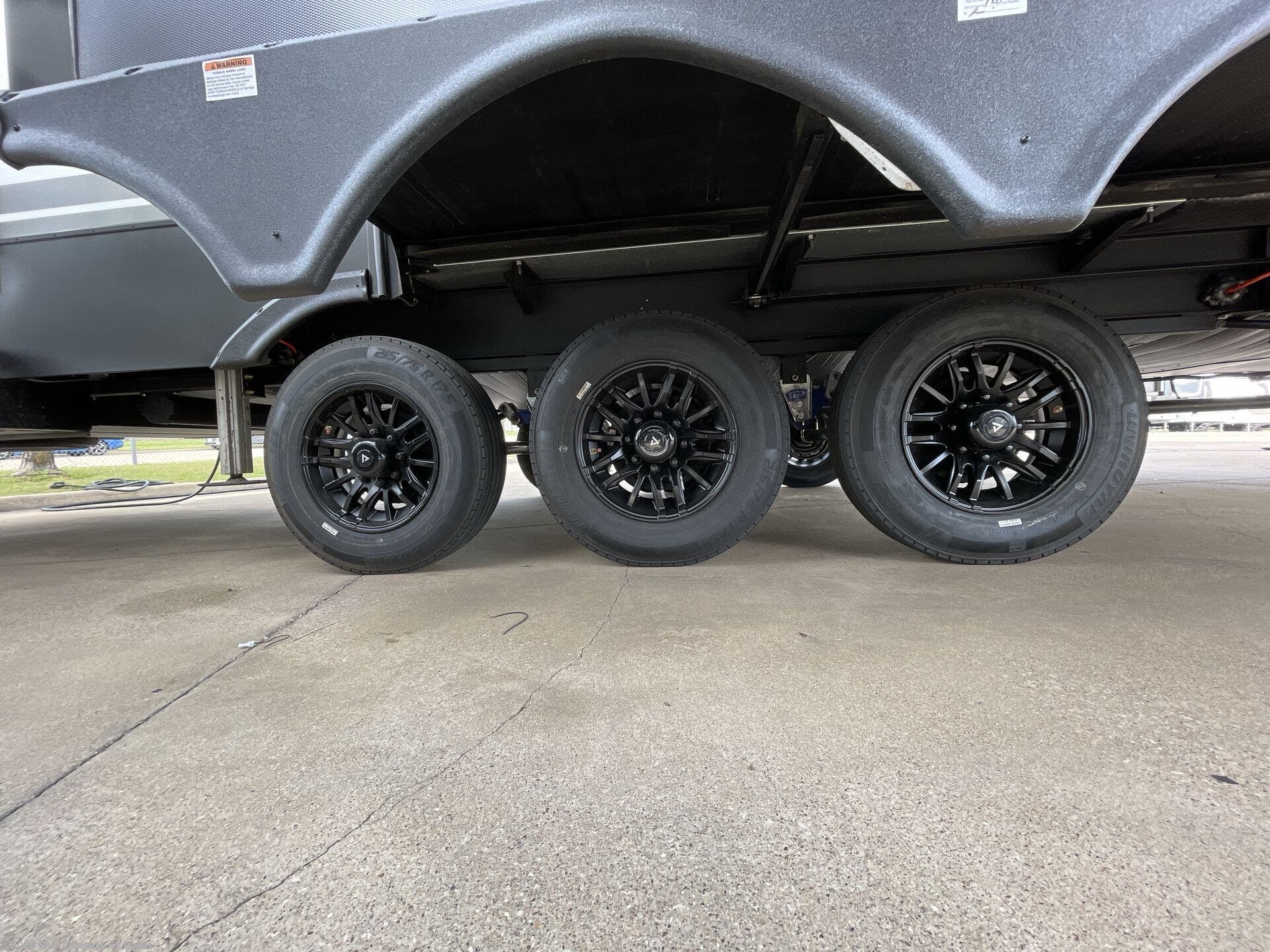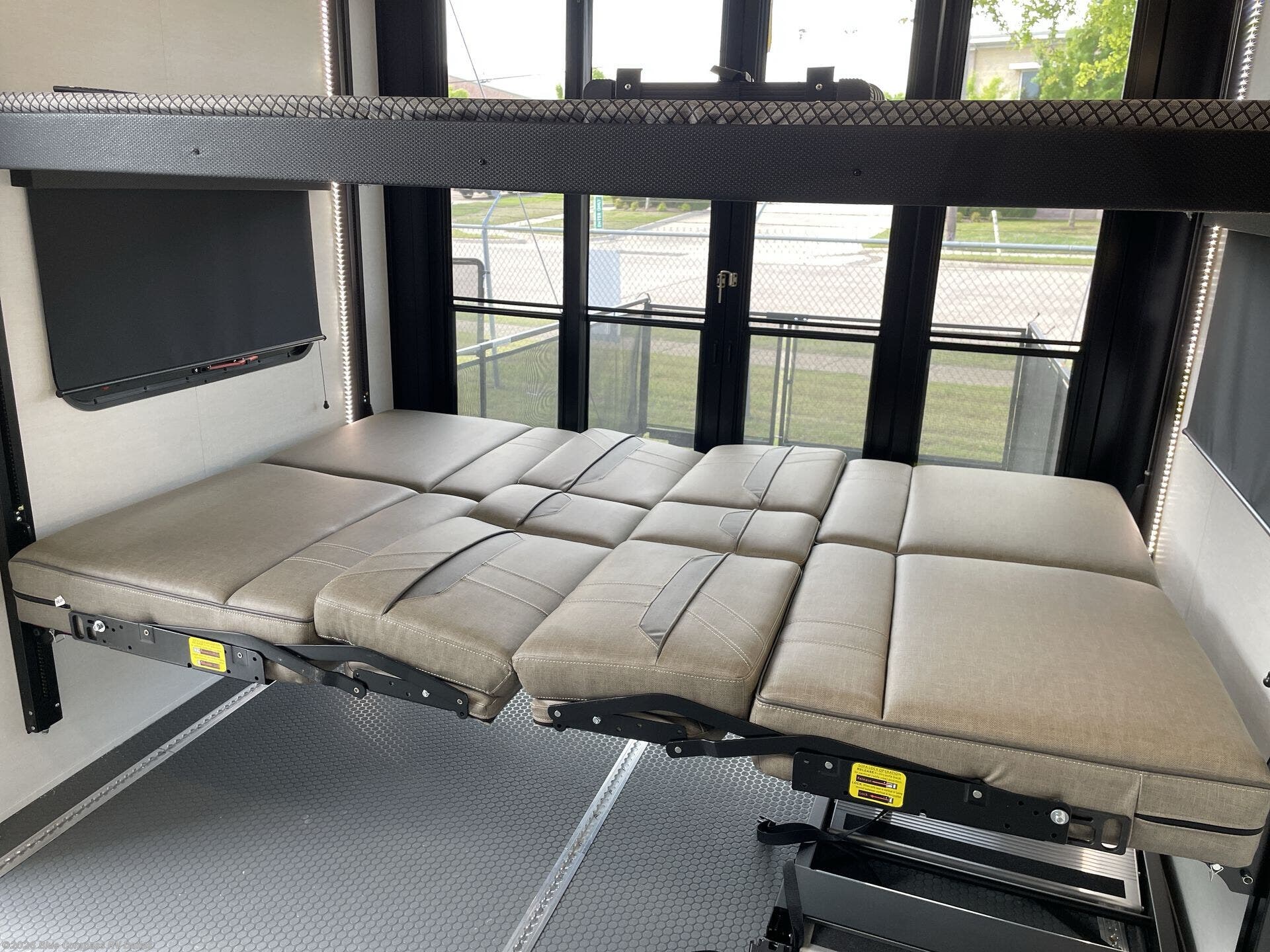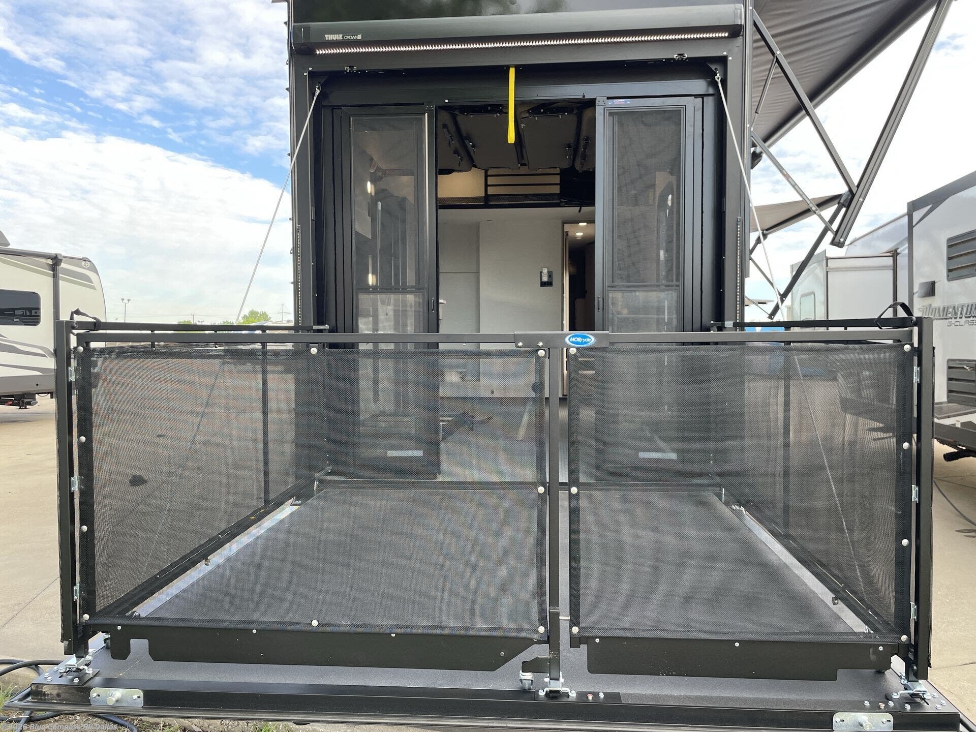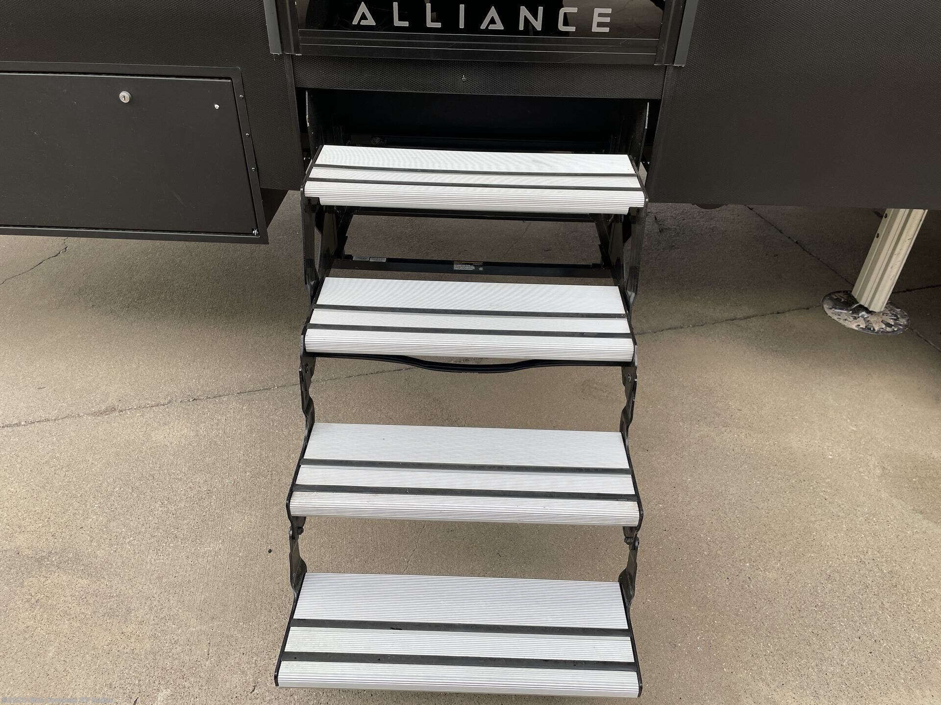 You can bring your toys with you wherever you go with any one of these Alliance RV Valor toy hauler fifth wheels! They are adventure-ready with a quality build from the walk on roof with seamless PVC roof covering to the commercial grade vinyl flooring and MorRyde CRE3000 suspension system. The Performance Running Gear package comes with a 101" wide-body benchmark chassis platform, 7,000 lb. Dexter axles, and a space enhancing drop frame storage compartment to pack in all your riding gear. You can even go off-gridding thanks to the Off the Grid Pack that has two 400-watt solar panels, generator prep, a 60-amp charge controller, and a 100-amp hour lithium iron phosphate battery. Some of the interior comforts you will enjoy are the hardwood cabinet doors and drawers, solid surface kitchen countertops, and commercial grade vinyl flooring with no carpet to make clean up a breeze. The Valor toy haulers are also the Masters of 12 Volt with USB charging station throughout, a 12V refrigerator, and more 12-volt features to make camping hassle-free!