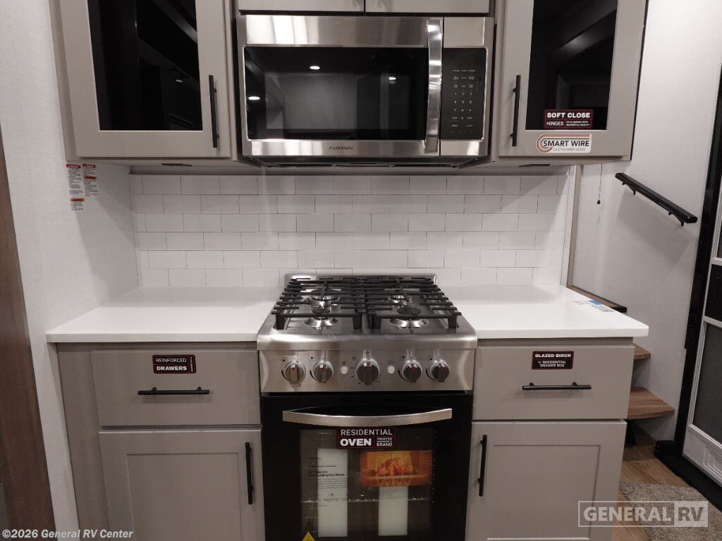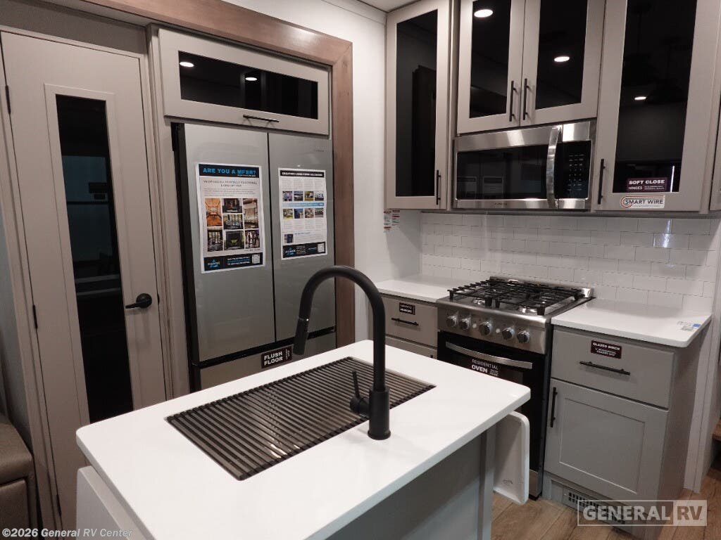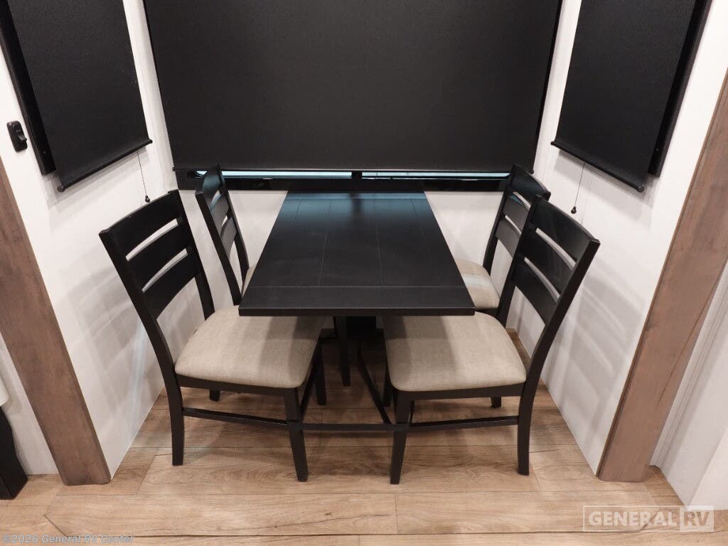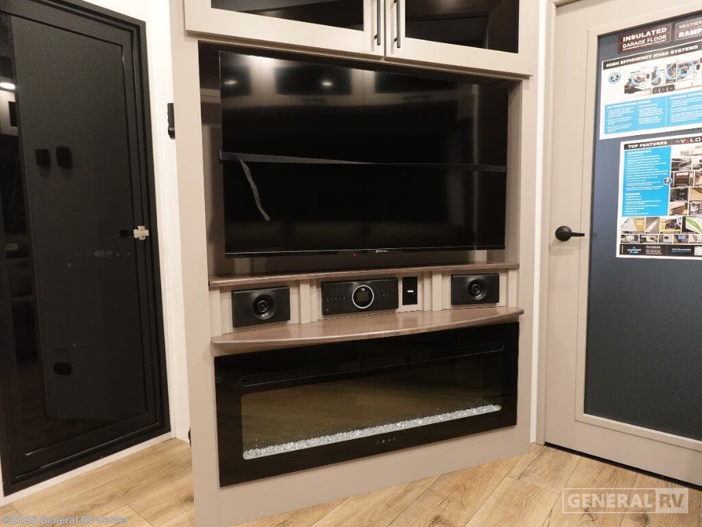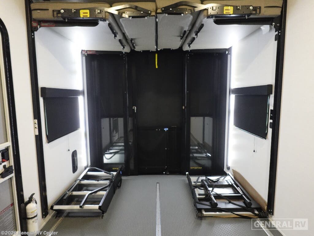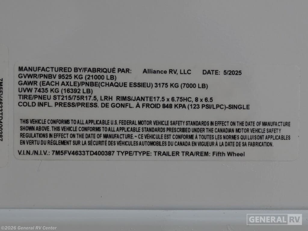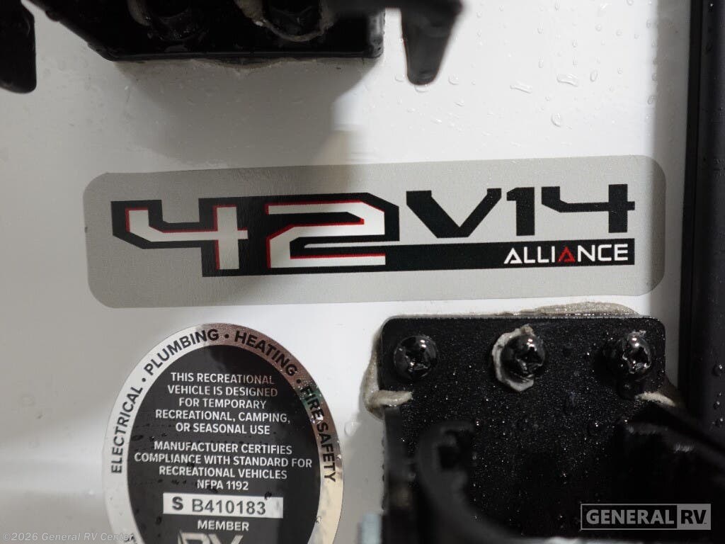 Embrace the ultimate in luxury and adventure with the 2025 Alliance RV Valor 42V14. This remarkable fifth wheel is designed to elevate your travel experience, whether you're embarking on a long-term journey or a weekend getaway. With its spacious 14-foot garage, this RV is not just a home on wheels but a versatile toy hauler, ready to accommodate your favorite outdoor gear. The fold-down side patio offers a unique space for entertaining or relaxing under the stars, seamlessly blending indoor comfort with outdoor excitement. Inside, you'll find a thoughtfully designed living space with a center kitchen and living area, providing a cozy yet spacious environment for family gatherings or quiet evenings. The full-size electric refrigerator and four-burner cooktop make meal preparation a breeze, while the convection cooking option adds an extra touch of gourmet flair. With sleeping accommodations for up to seven, including a king bed, queen bed, and convertible options, everyone can rest comfortably after a day of adventure. The Valor 42V14 is prepped for a washer and dryer, ensuring you have all the comforts of home wherever you roam. The Valor 42V14 is a testament to Alliance RV's commitment to quality and innovation. With its robust construction, including three slides and three axles, this RV offers both stability and space. The automatic heater and powered retractable awnings ensure comfort and convenience in any weather. Whether you're exploring the great outdoors or enjoying a quiet retreat, the Alliance RV Valor 42V14 is your perfect companion. For more information or to see this incredible RV in person, visit your nearest General RV dealership.