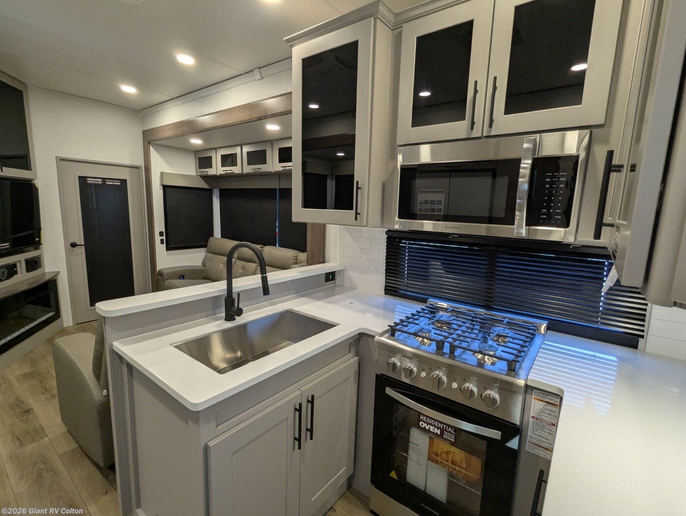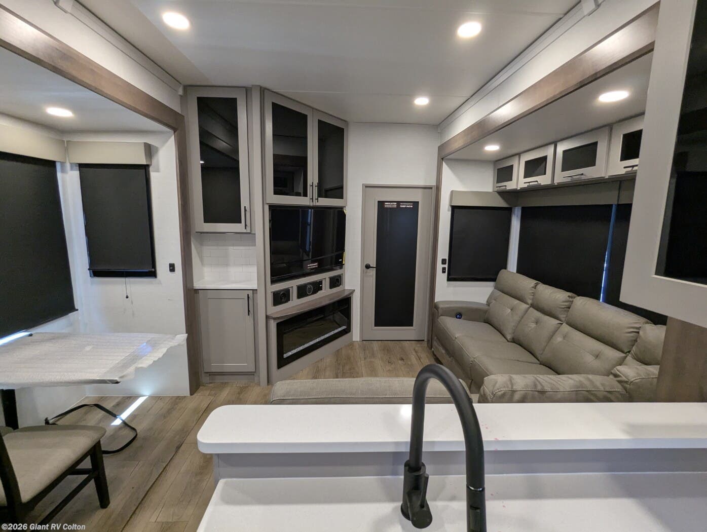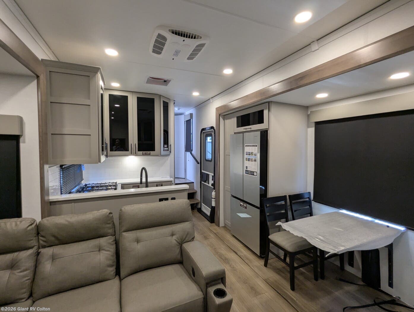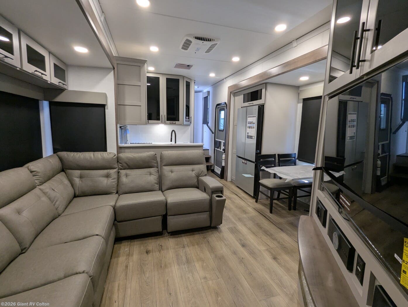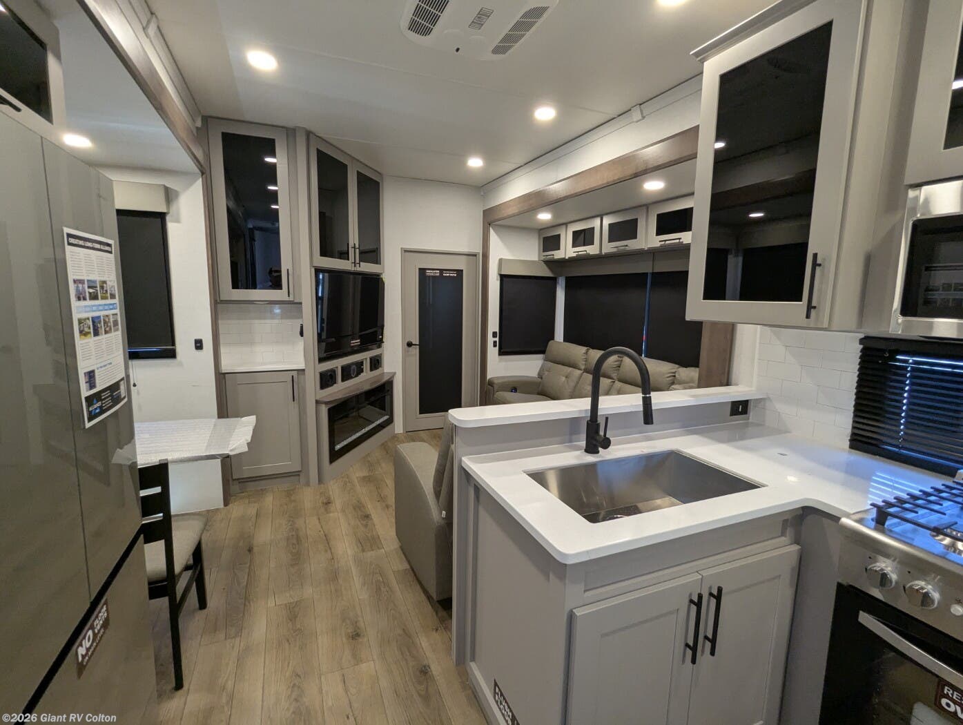- Luxurious Living Area: Features a large L-shaped sofa slide, 50" HDTV, fireplace, and a fully equipped kitchen with a 17 cu. ft. 12V refrigerator and solid surface countertops