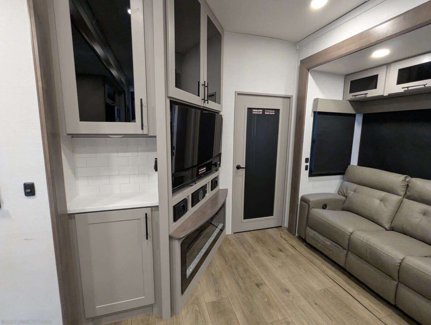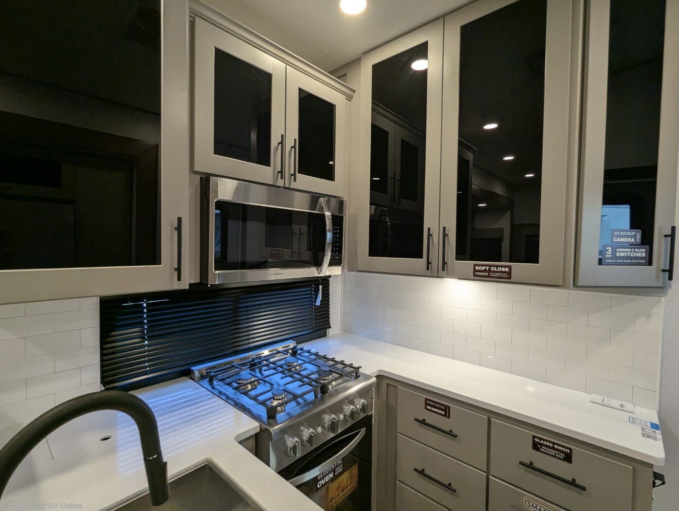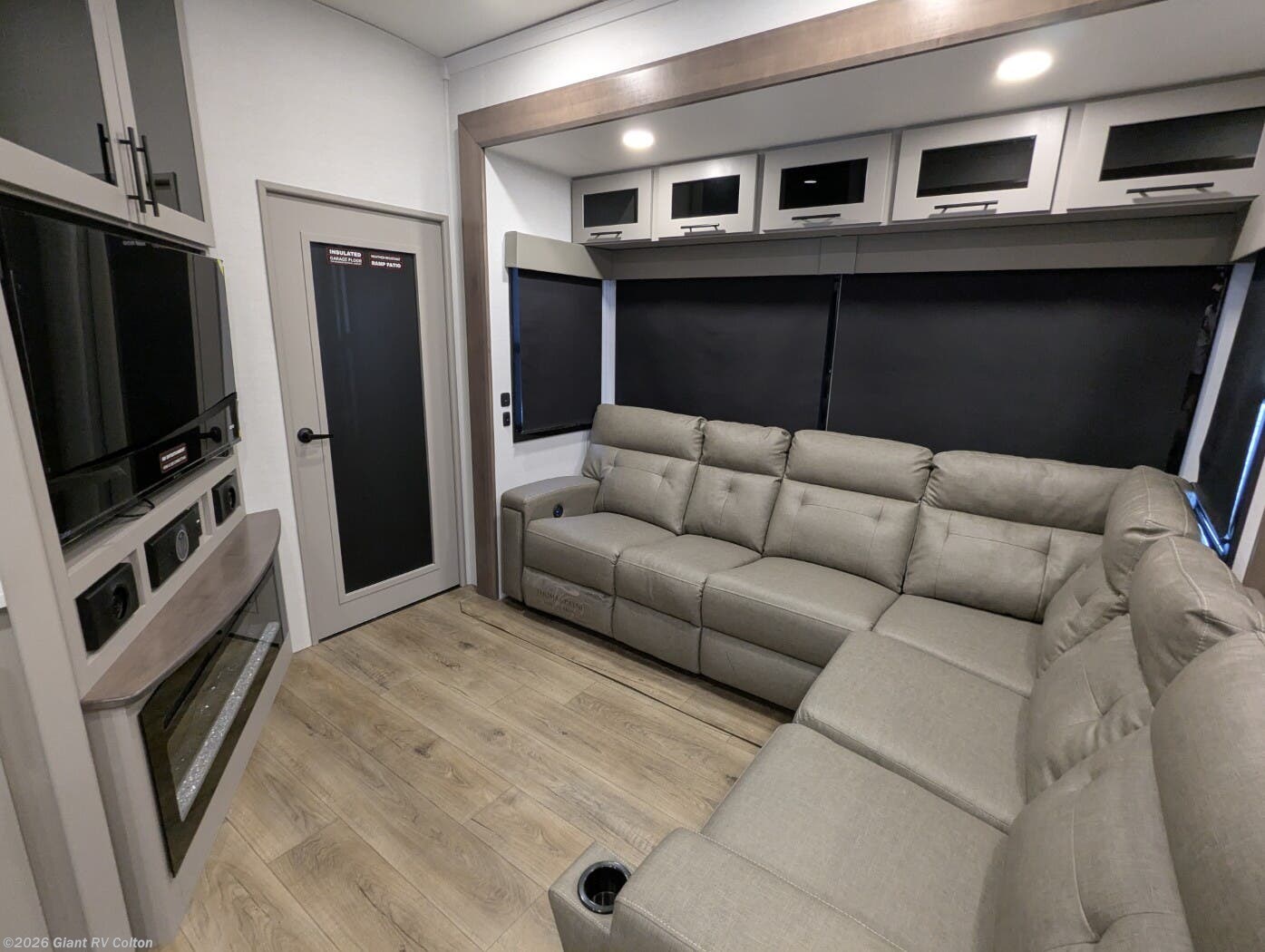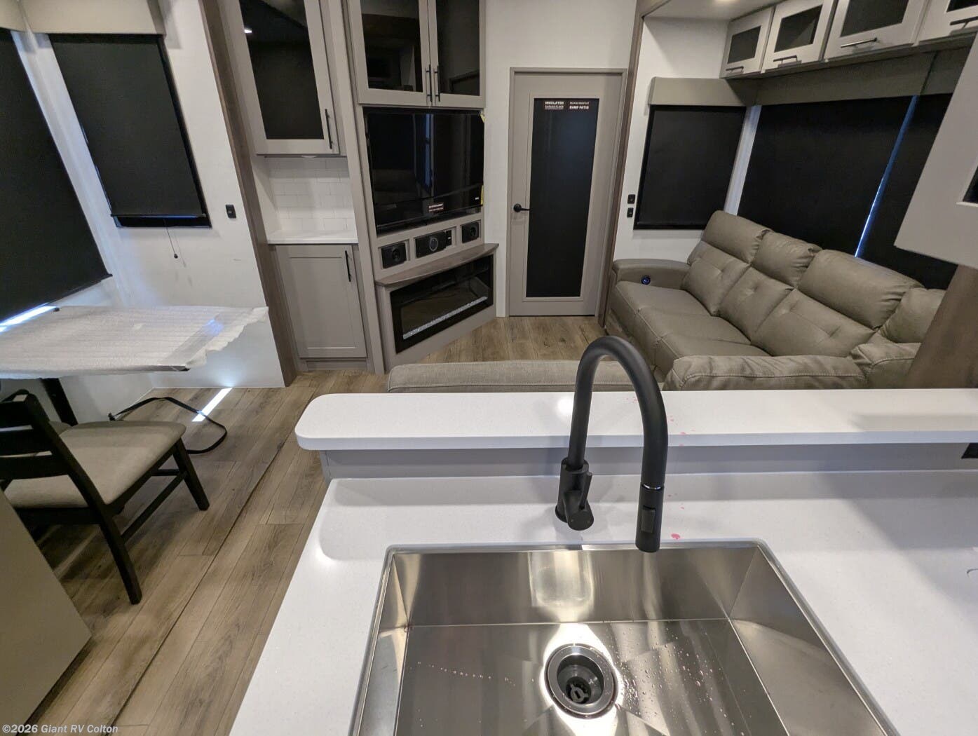 - Luxurious Living Area: Features a large L-shaped sofa slide, 50" HDTV, fireplace, and a fully equipped kitchen with a 17 cu. ft. 12V refrigerator and solid surface countertops