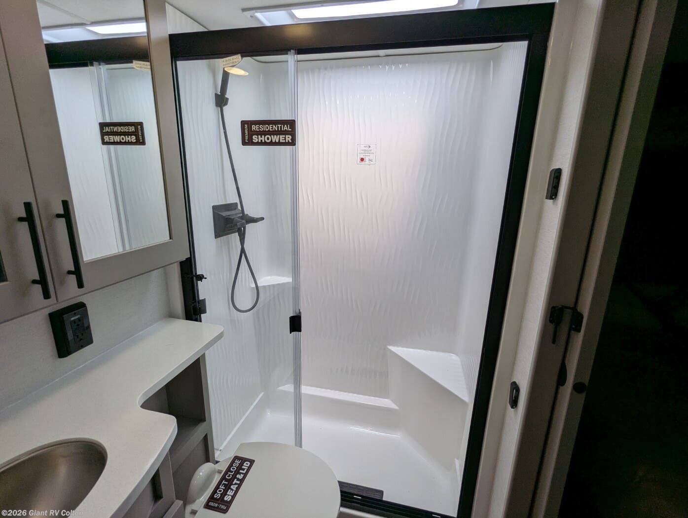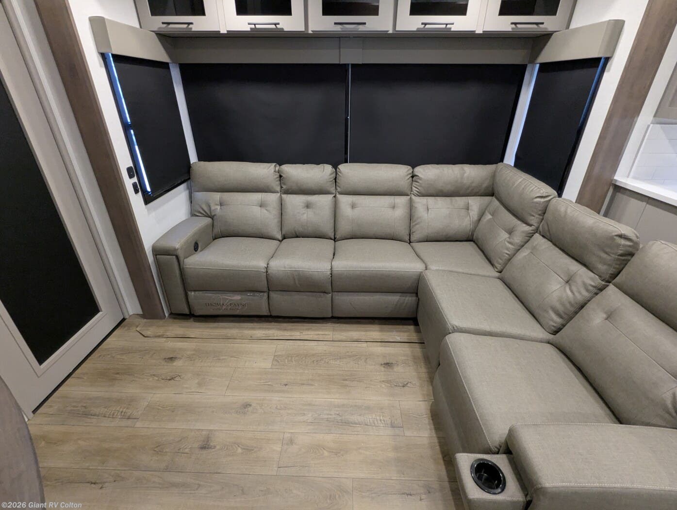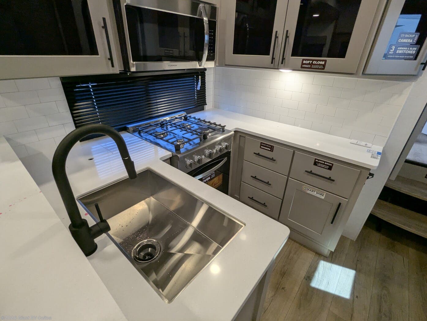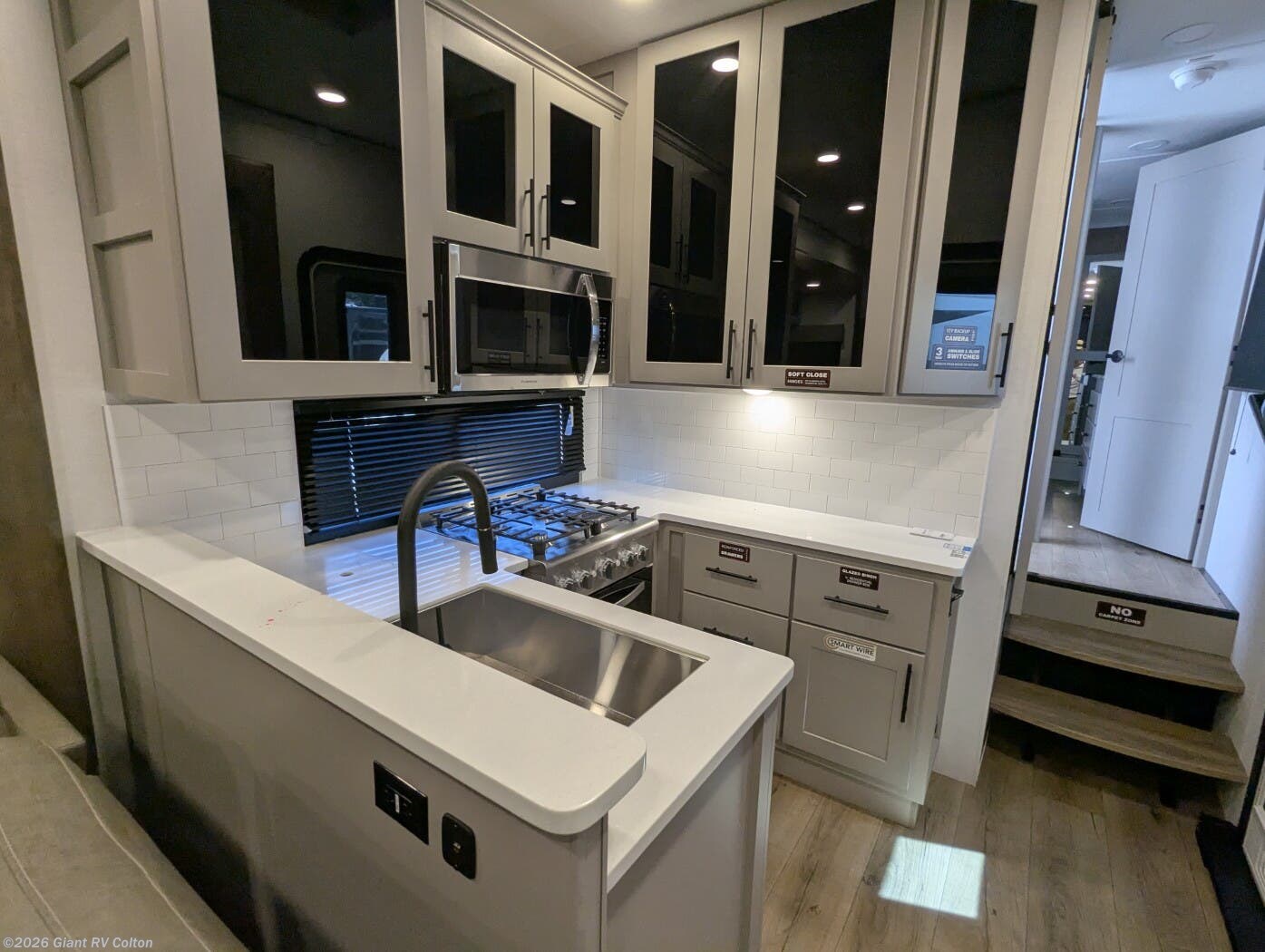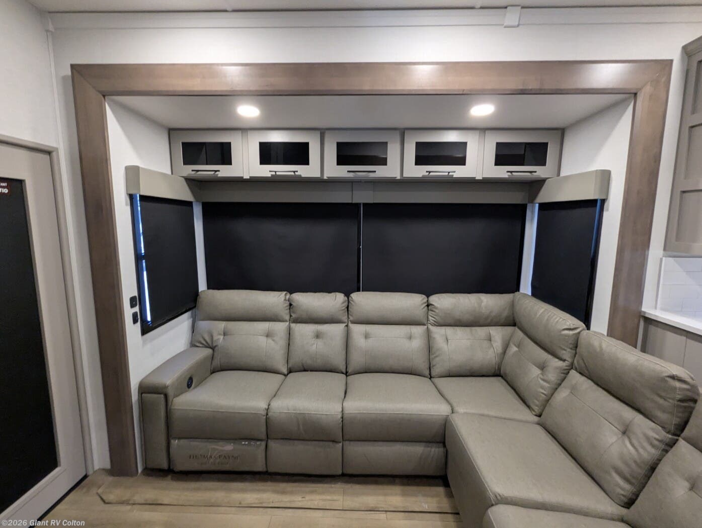 - Luxurious Living Area: Features a large L-shaped sofa slide, 50" HDTV, fireplace, and a fully equipped kitchen with a 17 cu. ft. 12V refrigerator and solid surface countertops