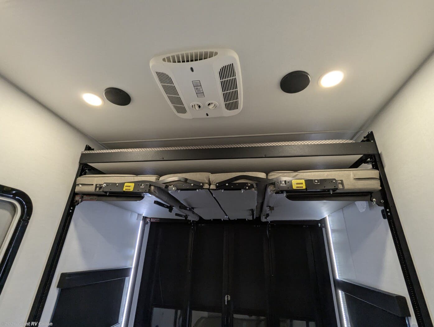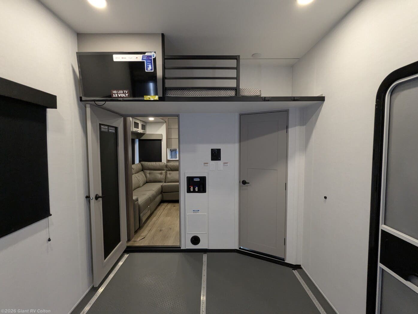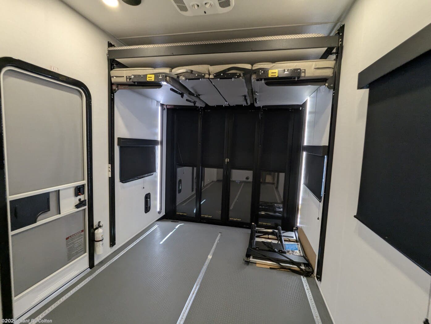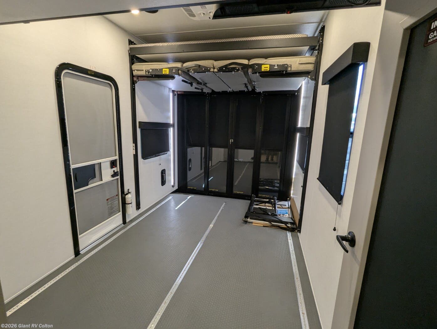 - 14-Foot Garage with HappiJac Sofas: Spacious storage for ATVs or gear, with roll-over sofas, a drop-down queen bed, and a loft for extra sleeping or storage.
