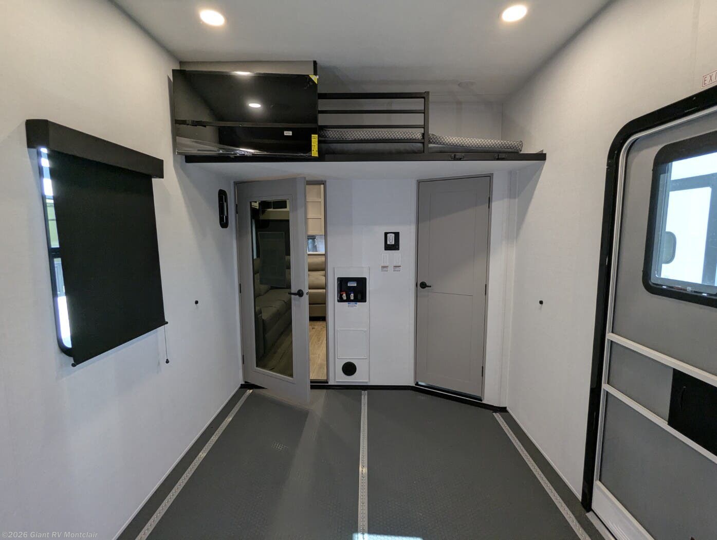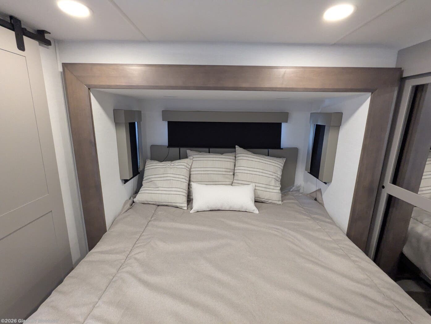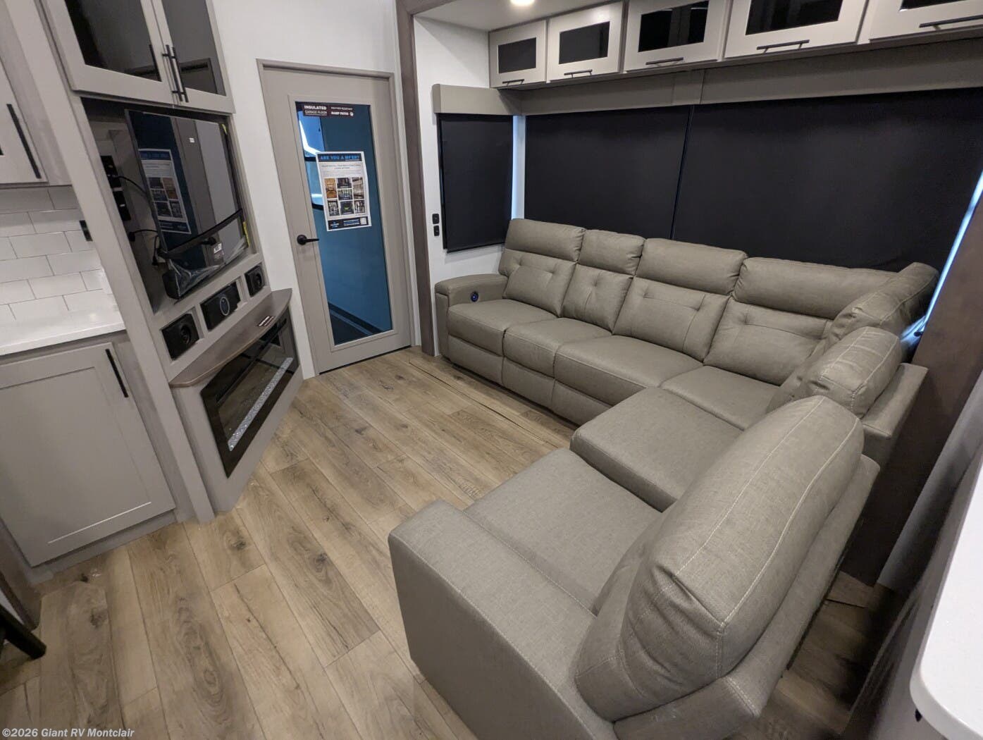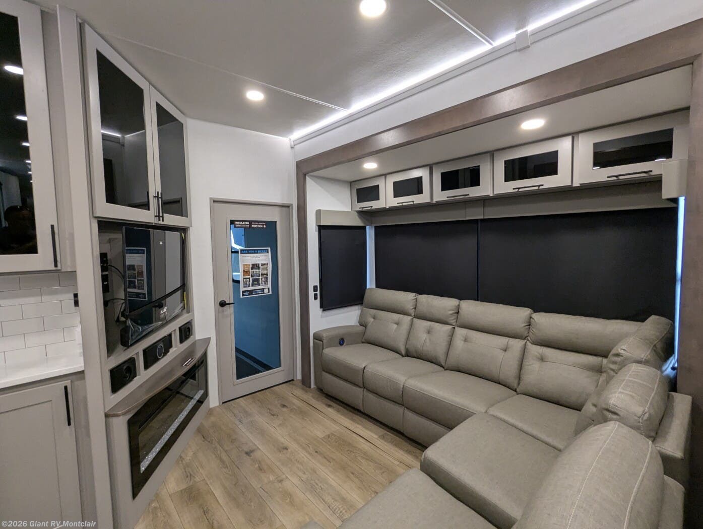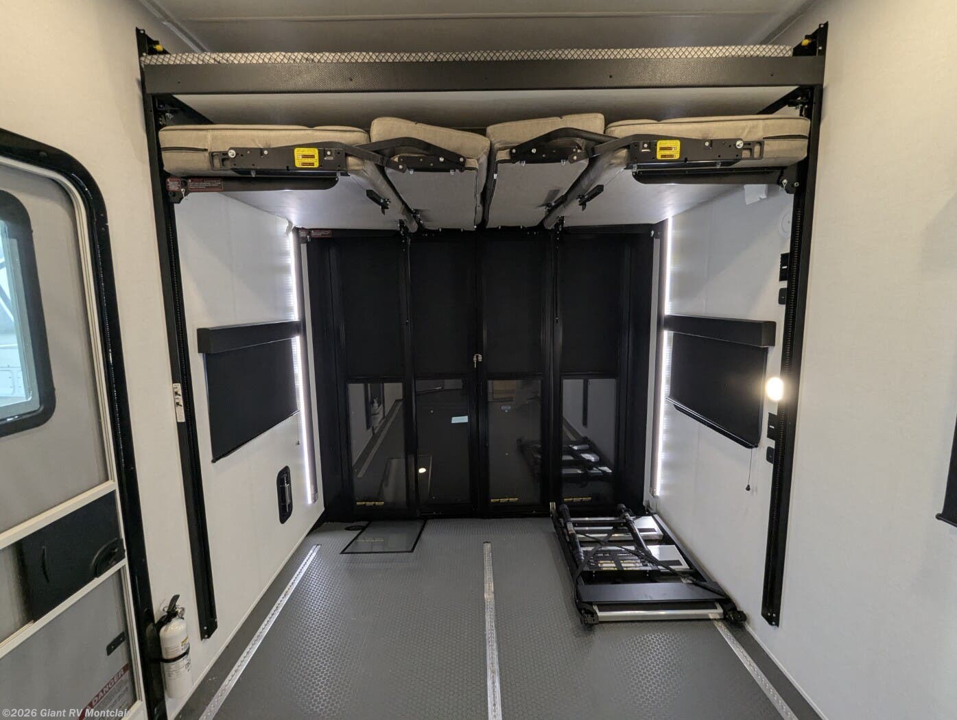Front Private King Bedroom: Includes a private front king bed with wardrobe storage and theater seating, creating a true master-suite escape separate from the garage area.