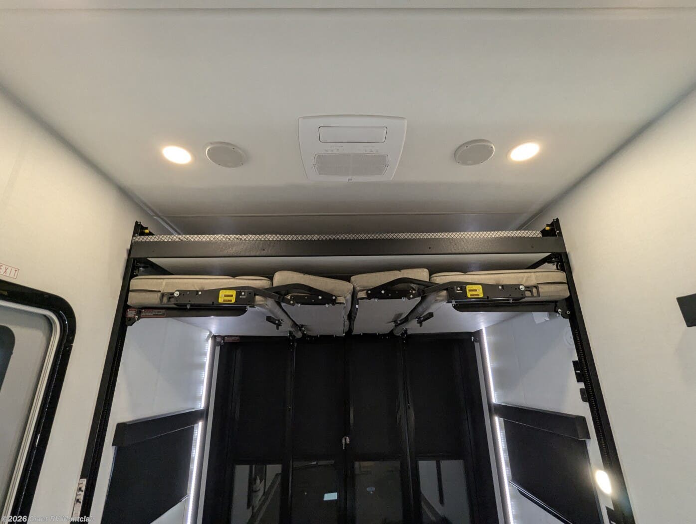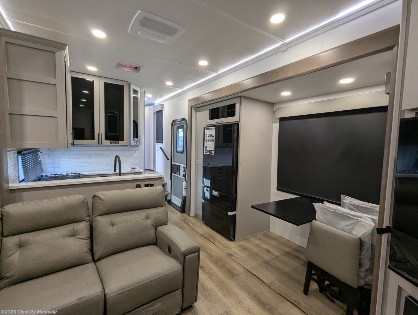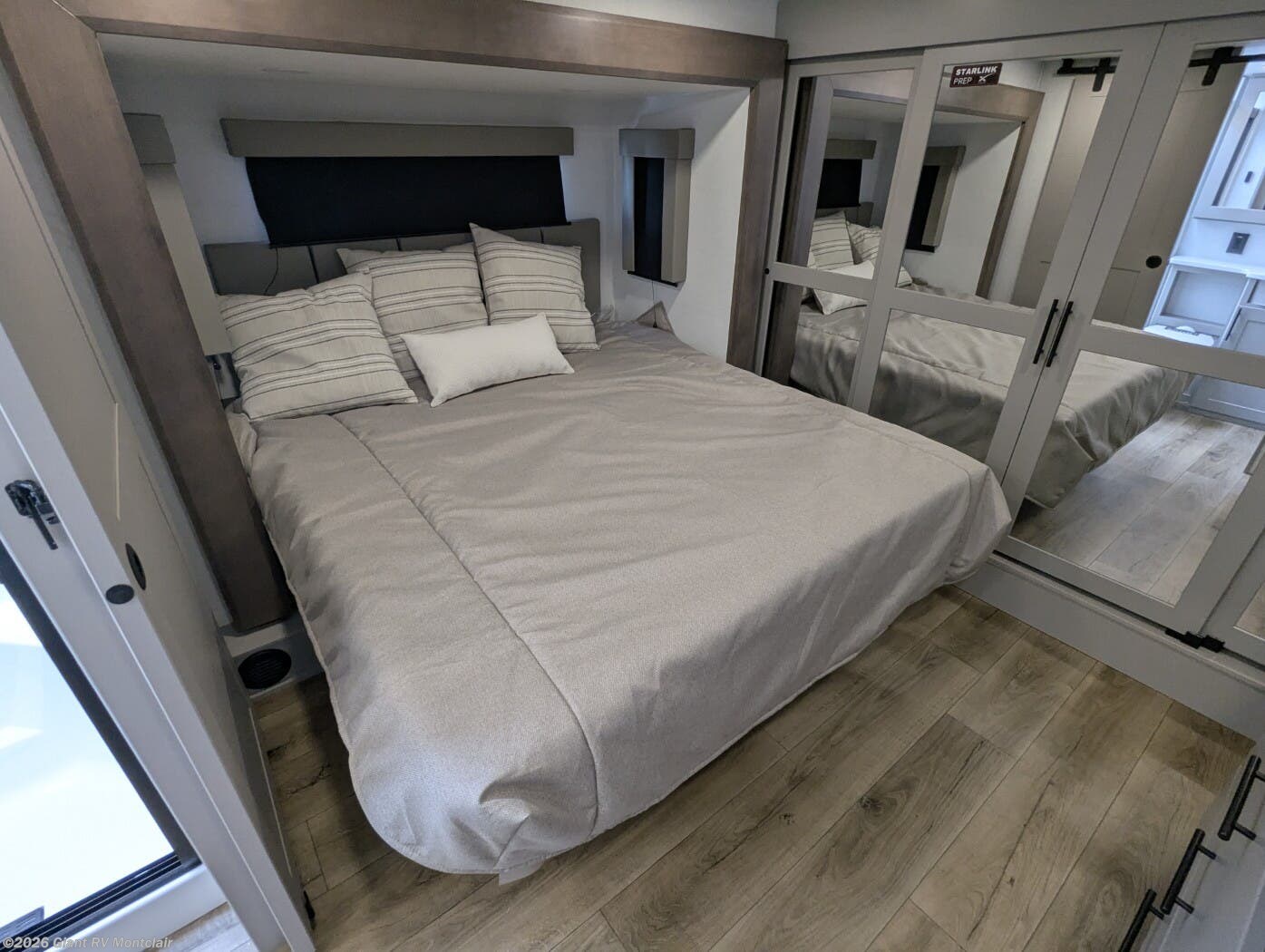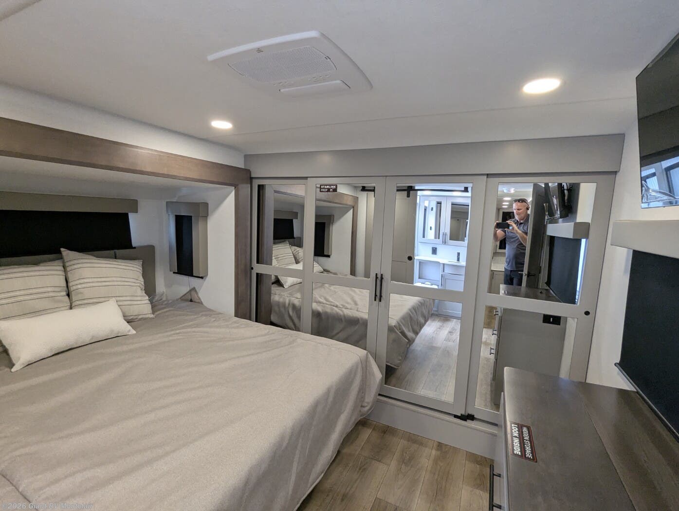 Front Private King Bedroom: Includes a private front king bed with wardrobe storage and theater seating, creating a true master-suite escape separate from the garage area.