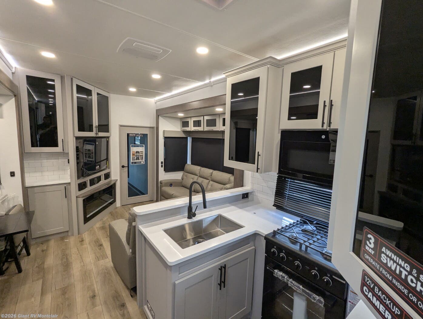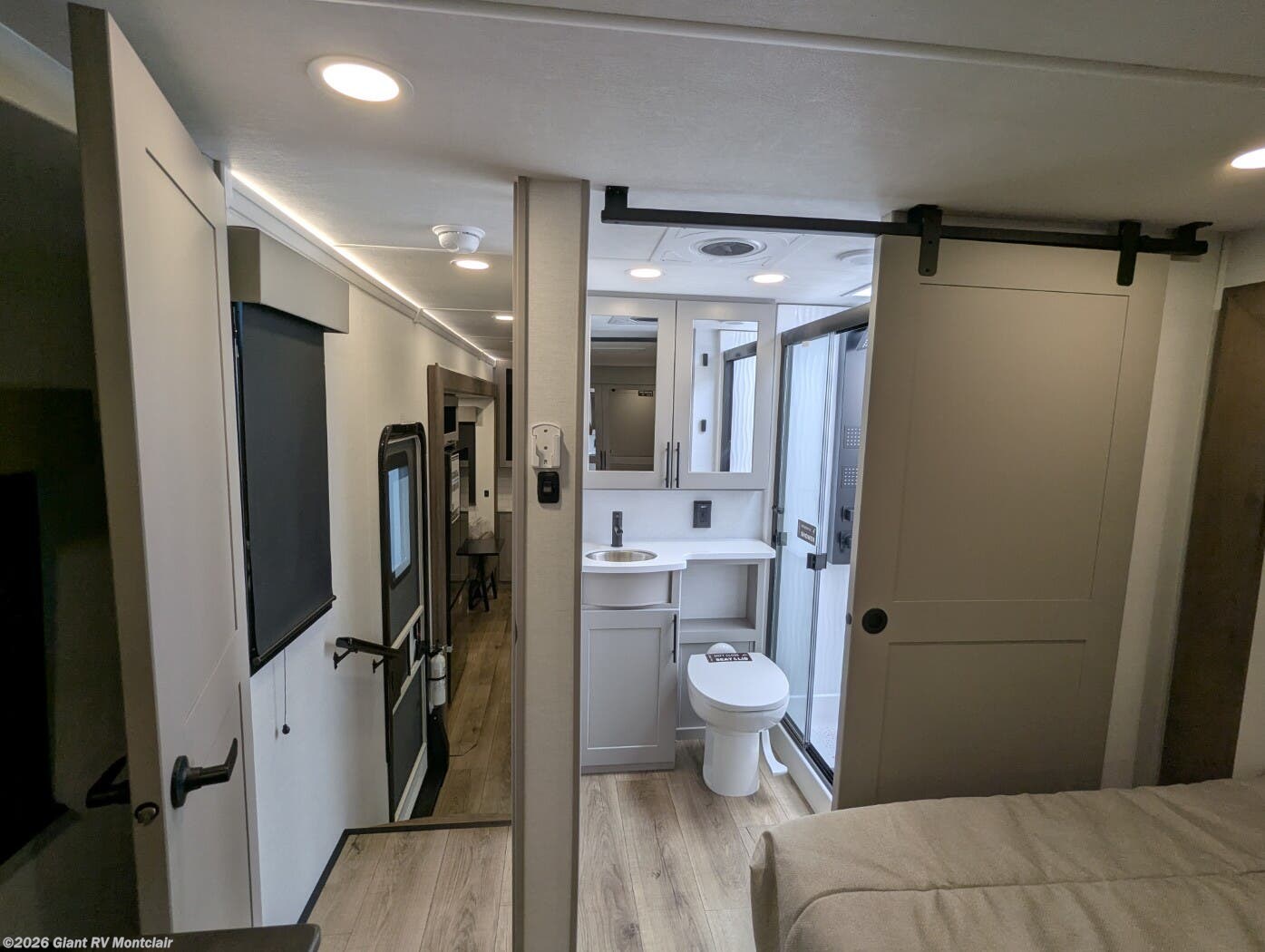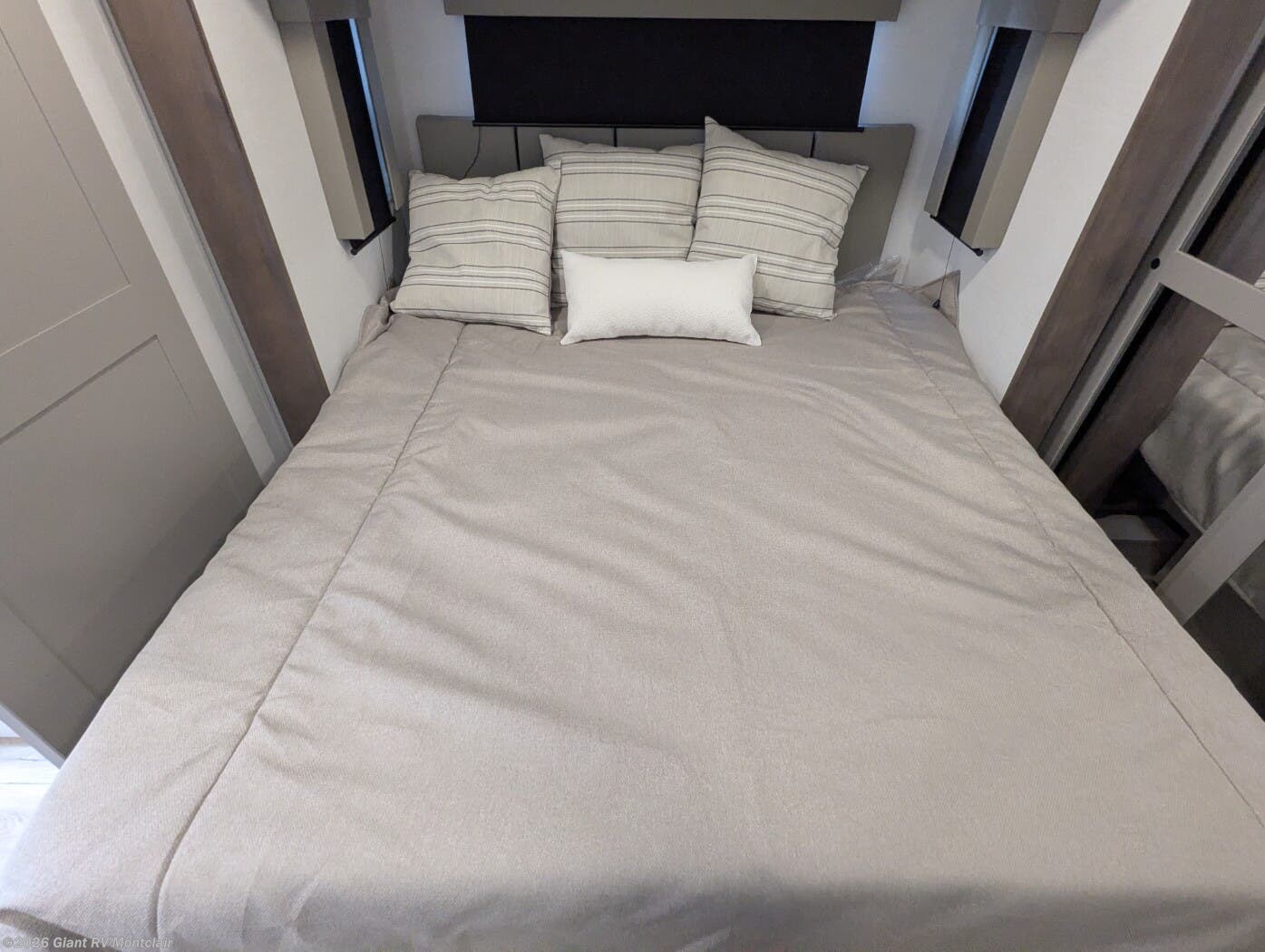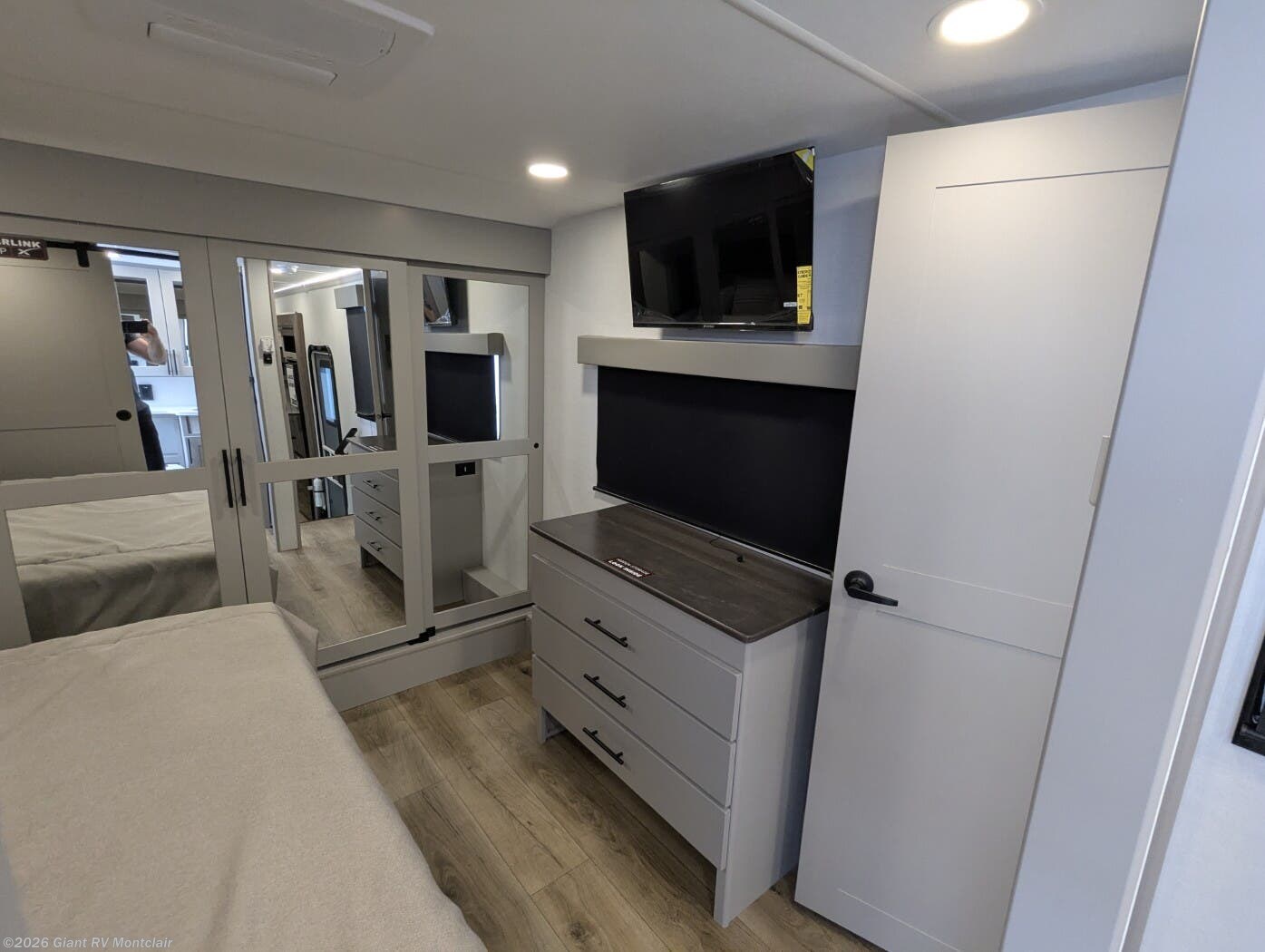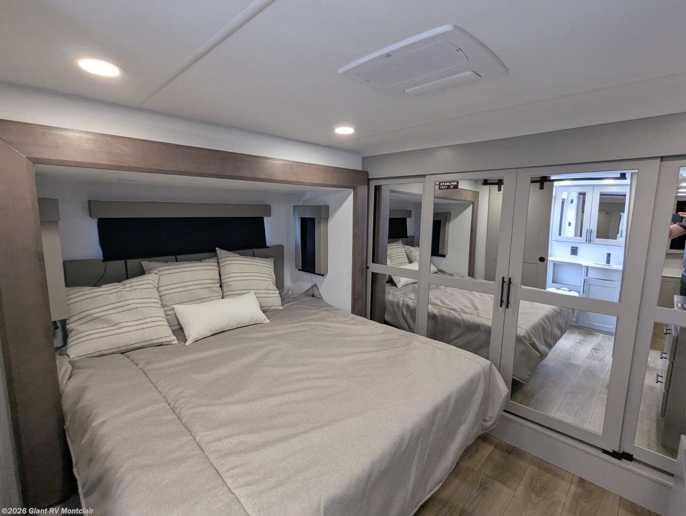 Front Private King Bedroom: Includes a private front king bed with wardrobe storage and theater seating, creating a true master-suite escape separate from the garage area.