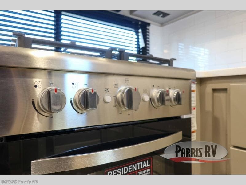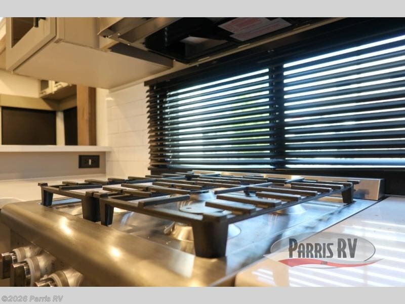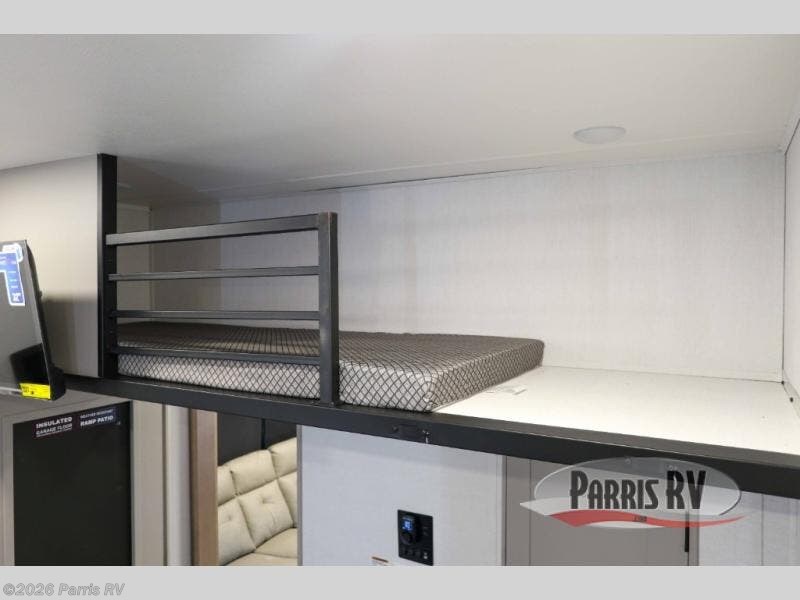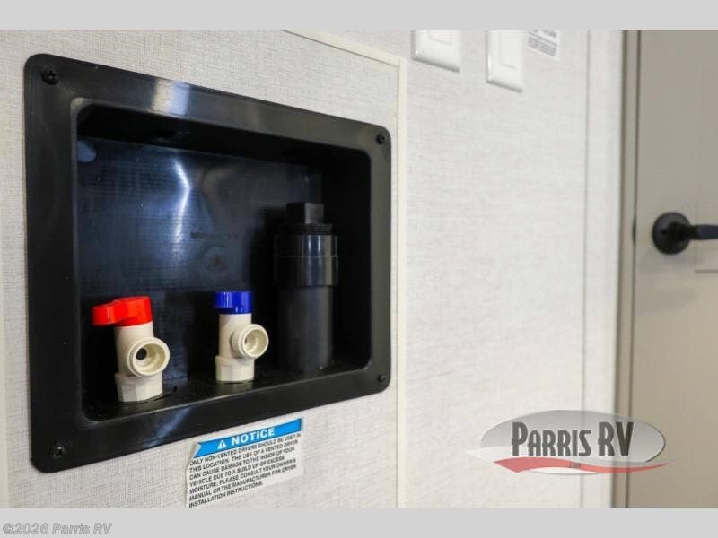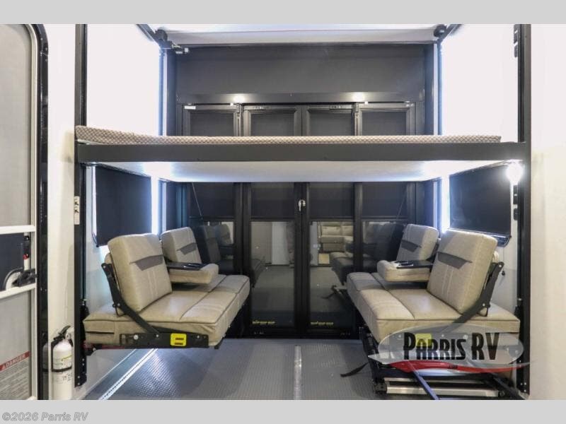The whole gang will love camping in this toy hauler with a 14' garage for your toys and gear. Once you have arrived at your destination, you can set up the HappiJac roll-over sofas with a queen bed above them, and also a loft which opens to the garage area as well. A half bath is also available off the garage which is an added convenience for those sleeping in this converted area, and for those coming in off the trail so that they do not have to track all through the main unit to use the bathroom. The chef can prepare great meals for their hungry crew with the fully equipped kitchen including a four burner cooktop, a stainless steel 12V refrigerator, large sink, and plenty of countertop prep space. The rest of the gang can be relaxing on the large L-shaped sofa slide watching the 50" HDTV and enjoying the fireplace, or playing a game of cards at the dining table with four chairs. The front private bedroom features a king bed slide for more interior space, a flip top dresser for all of your belongings, and a front wardrobe with washer and dryer prep, plus it has an entrance into the dual entry bathroom!