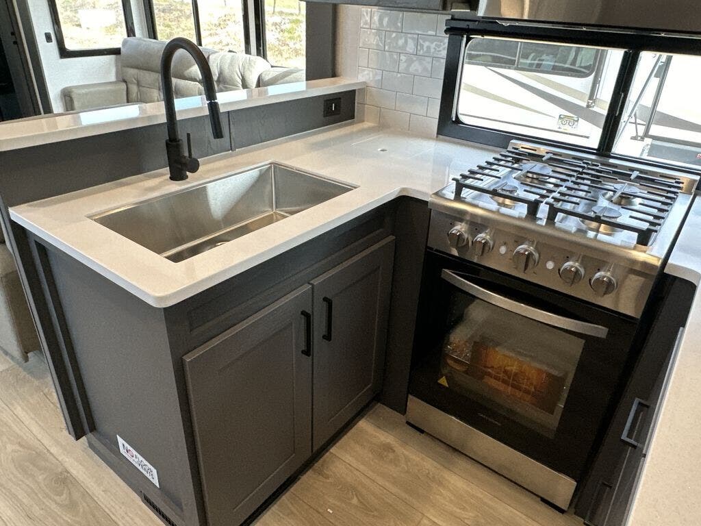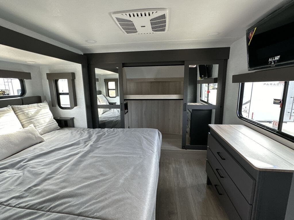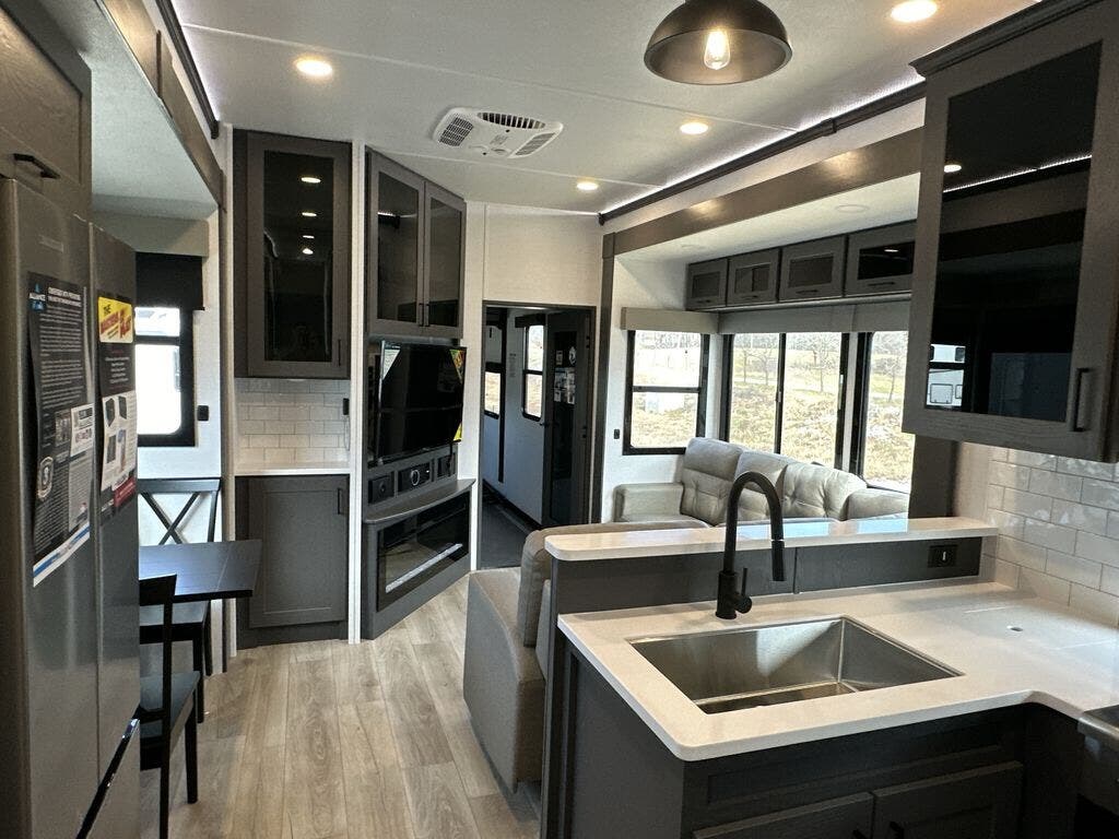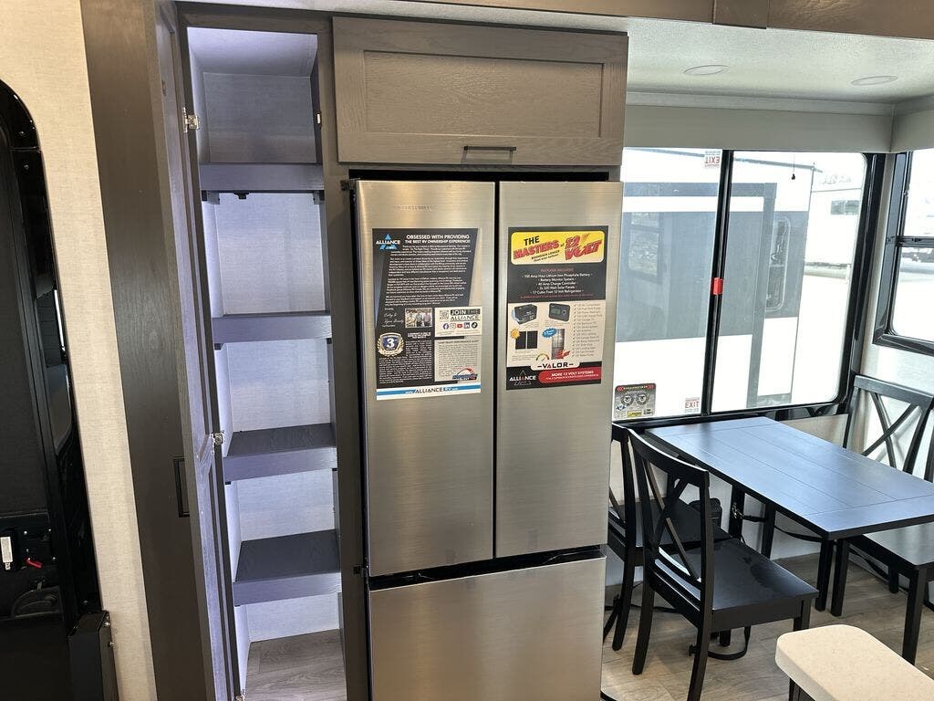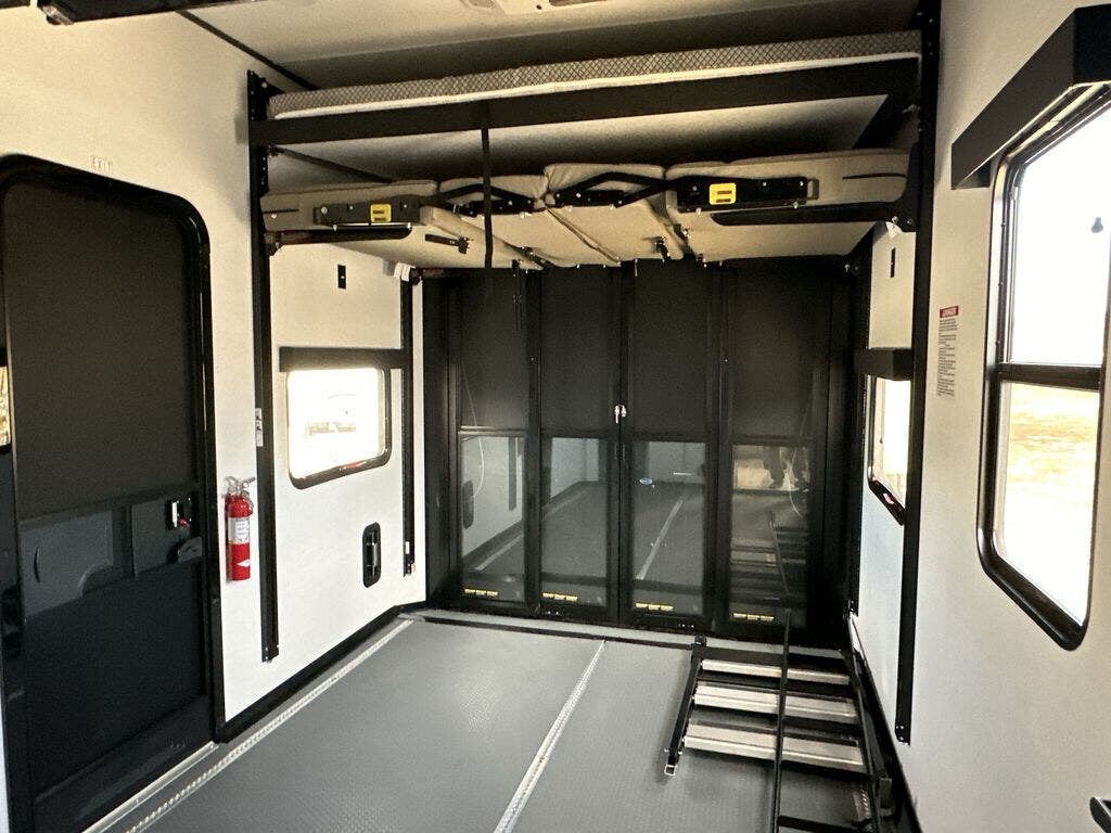 You can bring your toys with you wherever you go with any one of these Alliance RV Valor toy hauler fifth wheels! They are adventure-ready with a quality build from the walk on roof with seamless PVC roof covering to the commercial grade vinyl flooring and MorRyde CRE3000 suspension system. The Performance Running Gear package comes with a 101" wide-body benchmark chassis platform, 7,000 lb. Dexter axles, and a space enhancing drop frame storage compartment to pack in all your riding gear. You can even go off-gridding thanks to the Off the Grid Pack that has two 400-watt solar panels, generator prep, a 60-amp charge controller, and a 100-amp hour lithium iron phosphate battery. Some of the interior comforts you will enjoy are the hardwood cabinet doors and drawers, solid surface kitchen countertops, and commercial grade vinyl flooring with no carpet to make clean up a breeze. The Valor toy haulers are also the Master of 12 Volt with USB charging station throughout, a 12V refrigerator, and more 12-volt features to make camping hassle-free!