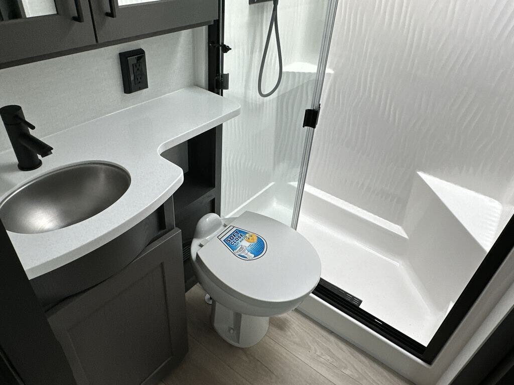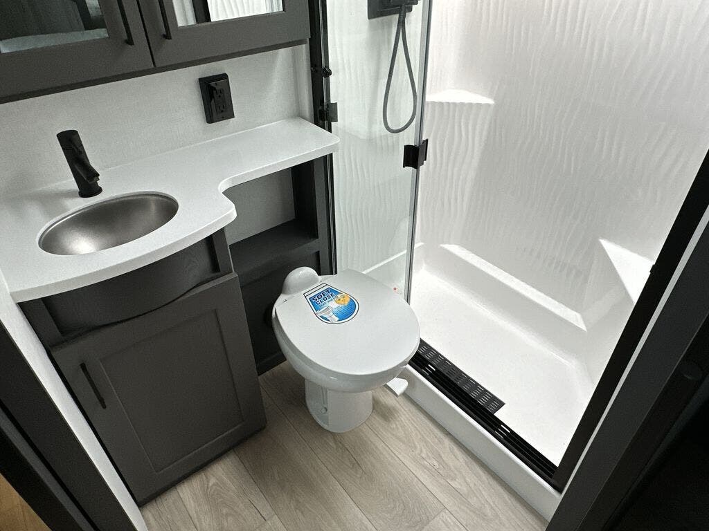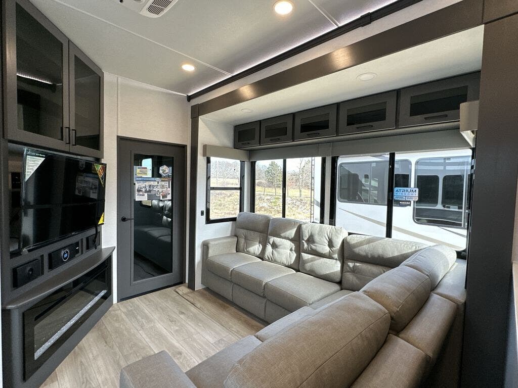 The whole gang will love camping in this toy hauler with a 14' garage for your toys and gear. Once you have arrived at your destination, you can set up the HappiJac roll-over sofas with a queen bed above them, and also a loft which opens to the garage area as well. A half bath is also available off the garage which is an added convenience for those sleeping in this converted area, and for those coming in off the trail so that they do not have to track all through the main unit to use the bathroom. The chef can prepare great meals for their hungry crew with the fully equipped kitchen including a four-burner cooktop, a 12V refrigerator, large sink, and plenty of countertop prep space. The rest of the gang can be relaxing on the large L-shaped sofa slide watching the 50" HDTV and enjoying the fireplace or playing a game of cards at the dining table with four chairs. The front private bedroom features a king bed slide for more interior space, a flip top dresser for all of your belongings, and a front wardrobe with washer and dryer prep, plus it has an entrance into the dual entry bathroom!