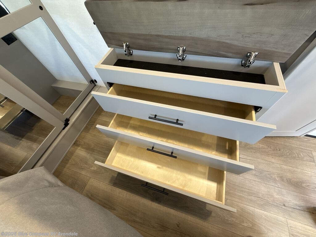 You can bring your toys with you wherever you go with any one of these Alliance RV Valor toy hauler fifth wheels! They are adventure-ready with a quality build from the walk on roof with seamless PVC roof covering to the commercial grade vinyl flooring and MorRyde CRE3000 suspension system. The Performance Running Gear package comes with a 101" wide-body benchmark chassis platform, 7,000 lb. Dexter axles, and a space enhancing drop frame storage compartment to pack in all your riding gear. You can even go off-gridding thanks to the Off the Grid Pack that has two 400-watt solar panels, generator prep, a 60-amp charge controller, and a 100-amp hour lithium iron phosphate battery. Some of the interior comforts you will enjoy are the hardwood cabinet doors and drawers, solid surface kitchen countertops, and commercial grade vinyl flooring with no carpet to make clean up a breeze. The Valor toy haulers are also the Master of 12 Volt with USB charging station throughout, a 12V refrigerator, and more 12-volt features to make camping hassle-free!