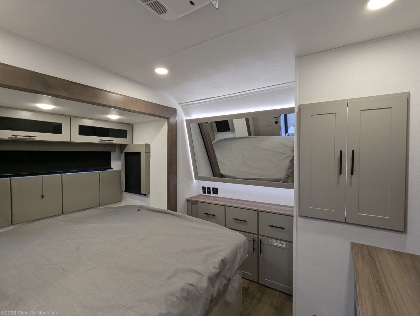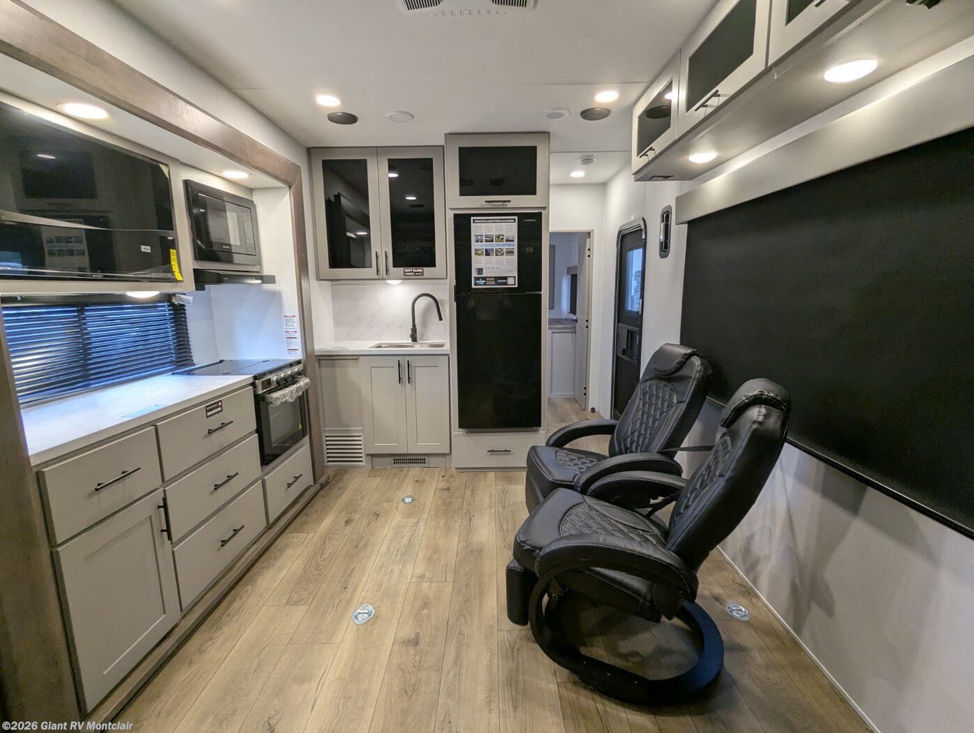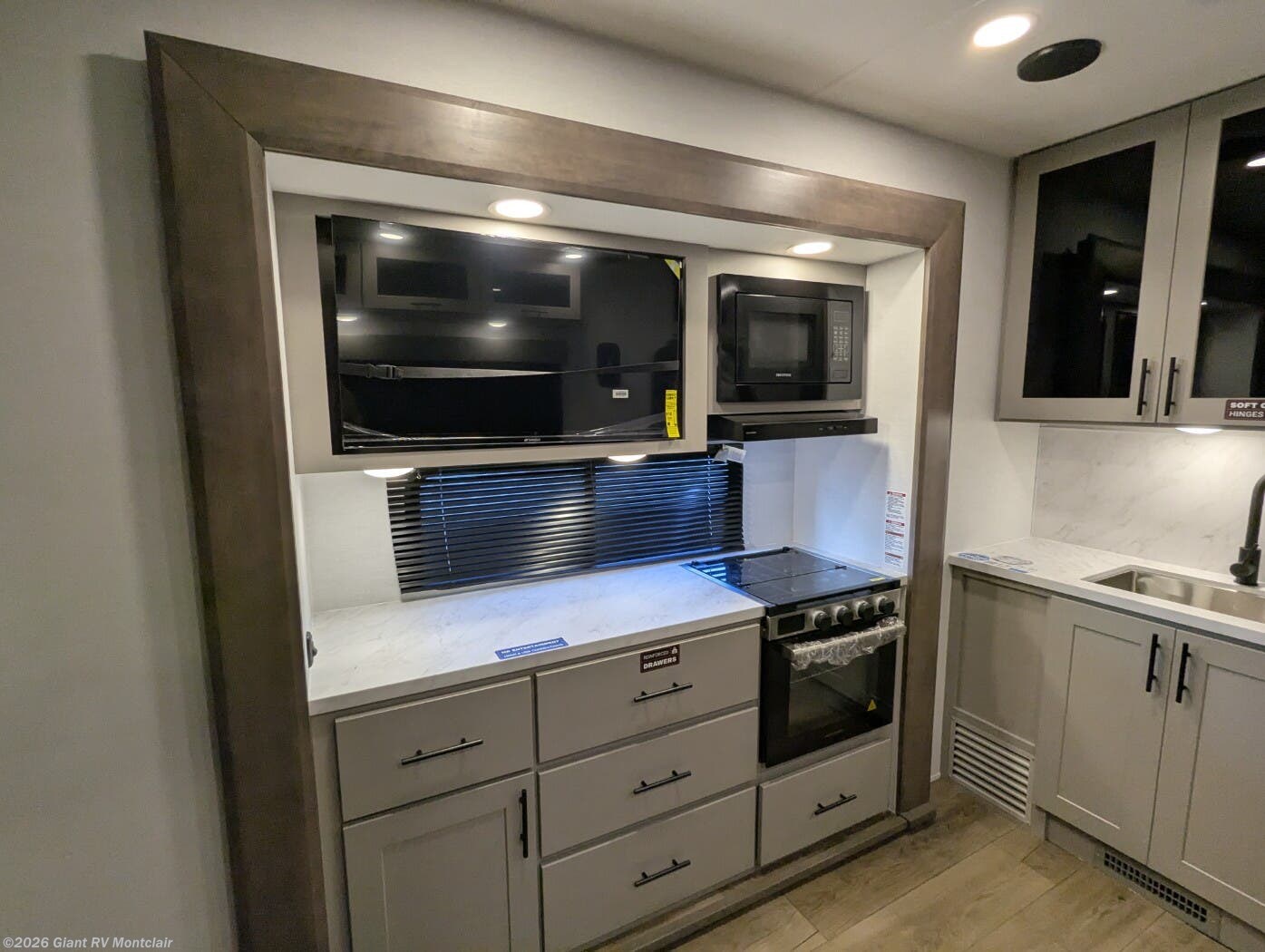 - Modern Amenities: Features 13.5K BTU air conditioning, 30,000 BTU furnace, built-in range with glass cover, microwave, and full bath with skylight for easy off-grid meals and routines.