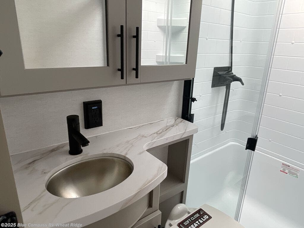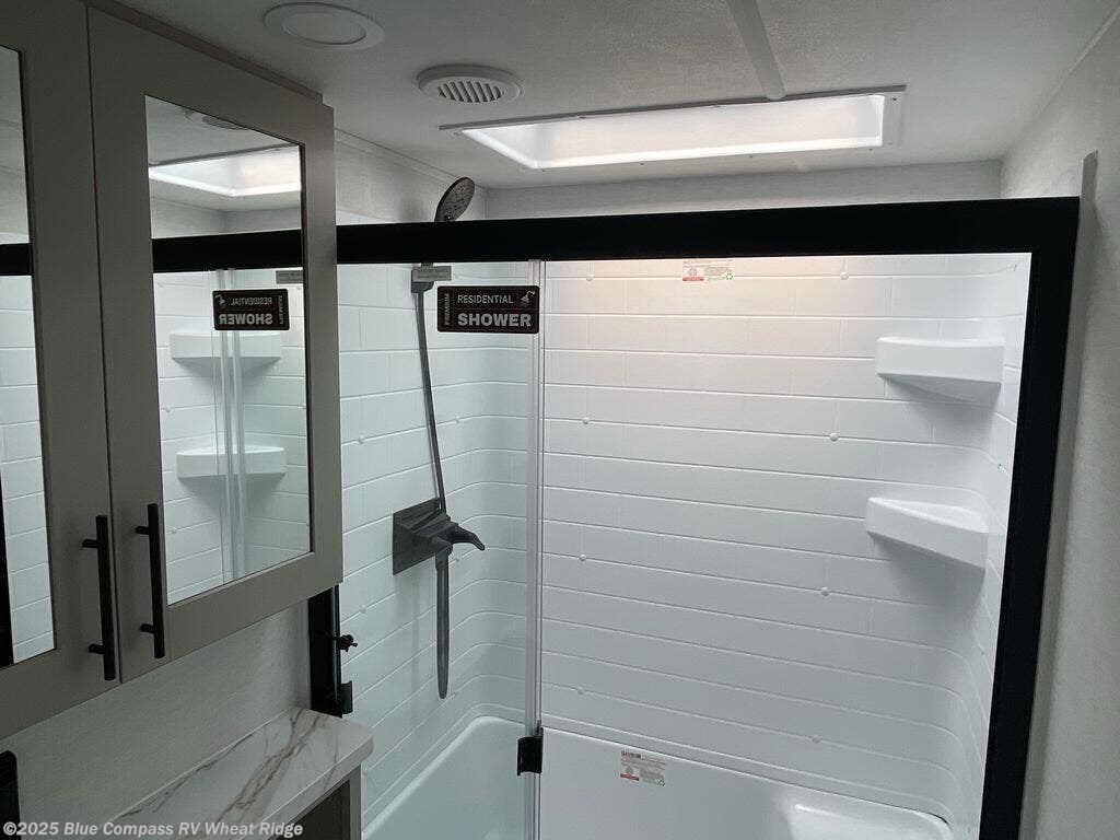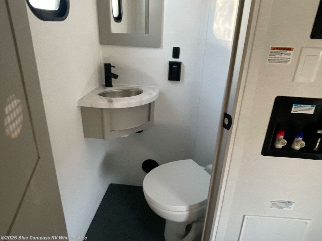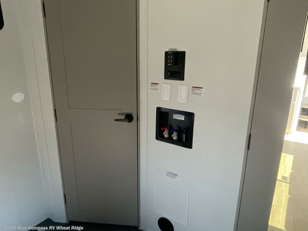 Built on a rugged 101" wide-body Benchmark chassis, the 32A10 includes the Masters of 12 Volt Package with a JBL sound system and USB charging stations, plus the Off The Grid Pack with 400W solar, generator prep, and a 40-amp charge controller. Exterior durability comes from Azdel-backed fiberglass, a painted front cap, and a seamless PVC roof, while the inside offers no carpet, commercial-grade flooring, and sleek black hardware throughout.