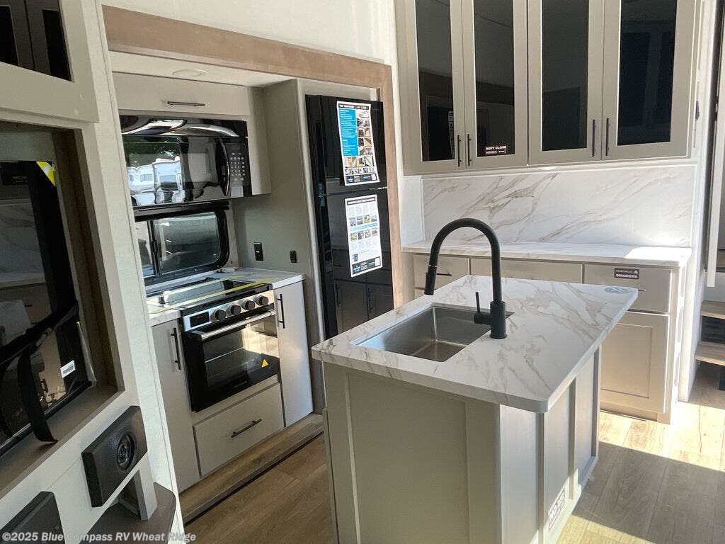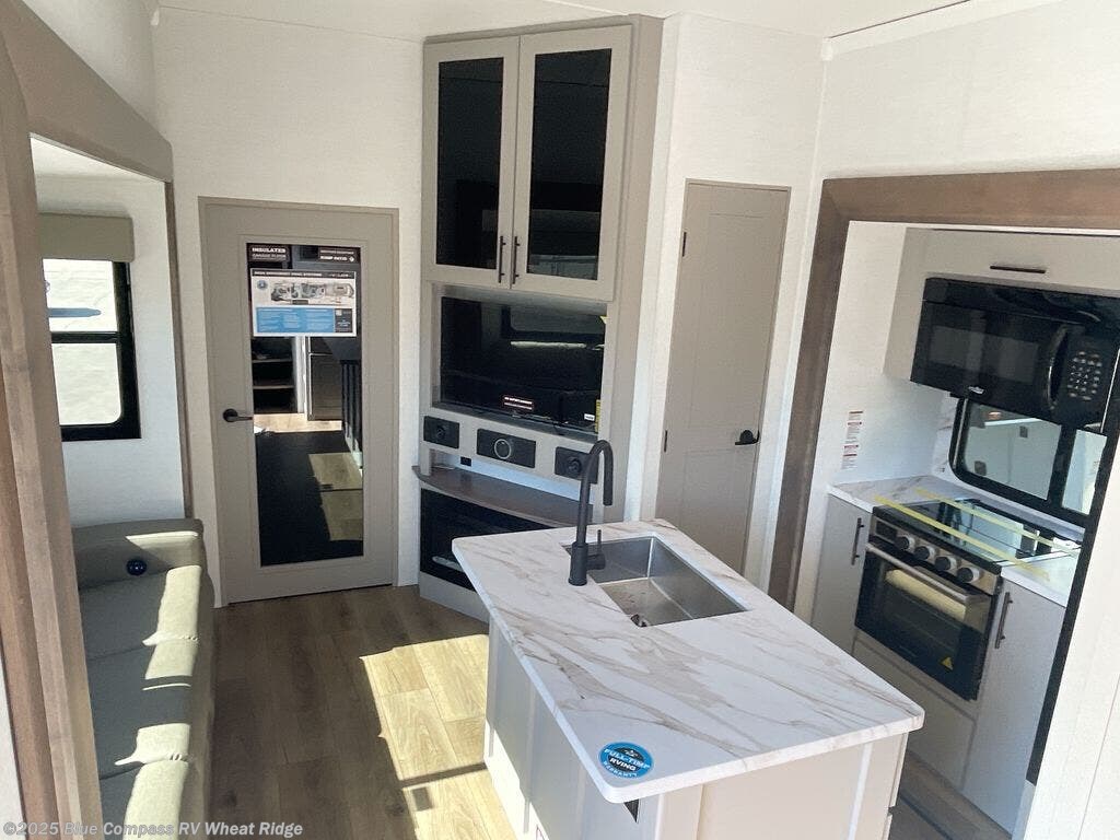 The main living area invites you to relax with a slide-out sofa and HDTV, while the chef of the crew will love the kitchen’s center island, large pantry, and three-burner cooktop. Up front, the private bedroom includes a king bed (queen optional) and wardrobe slide for added space.