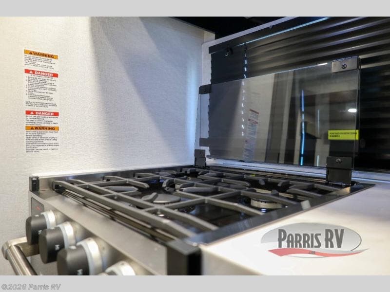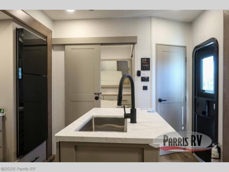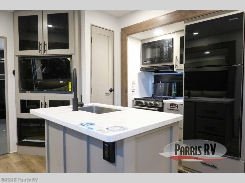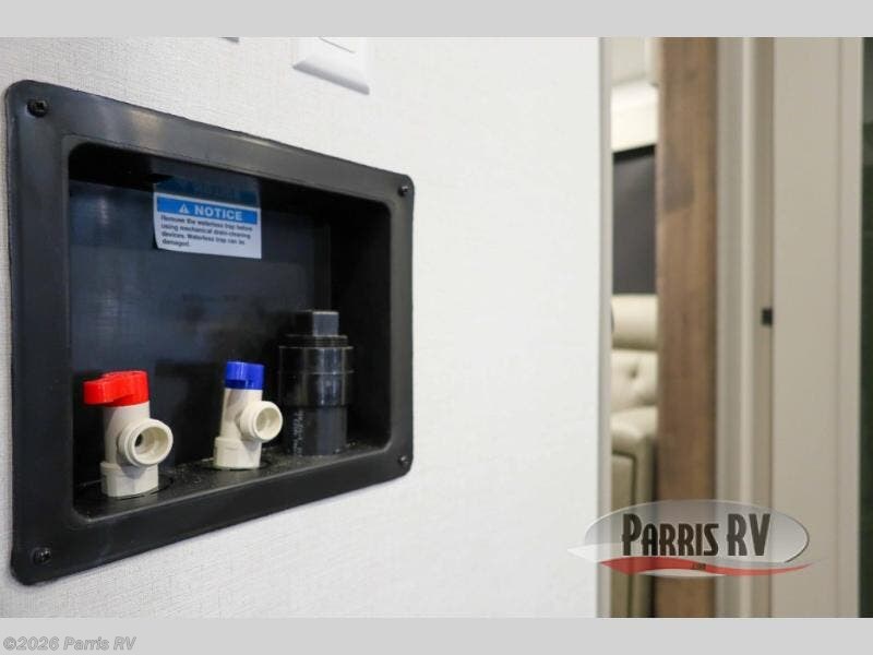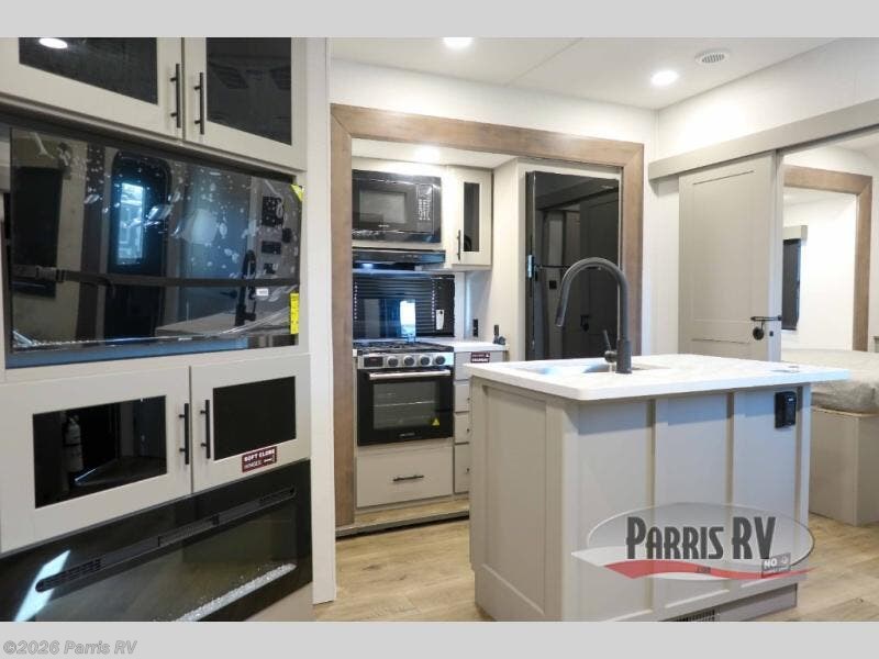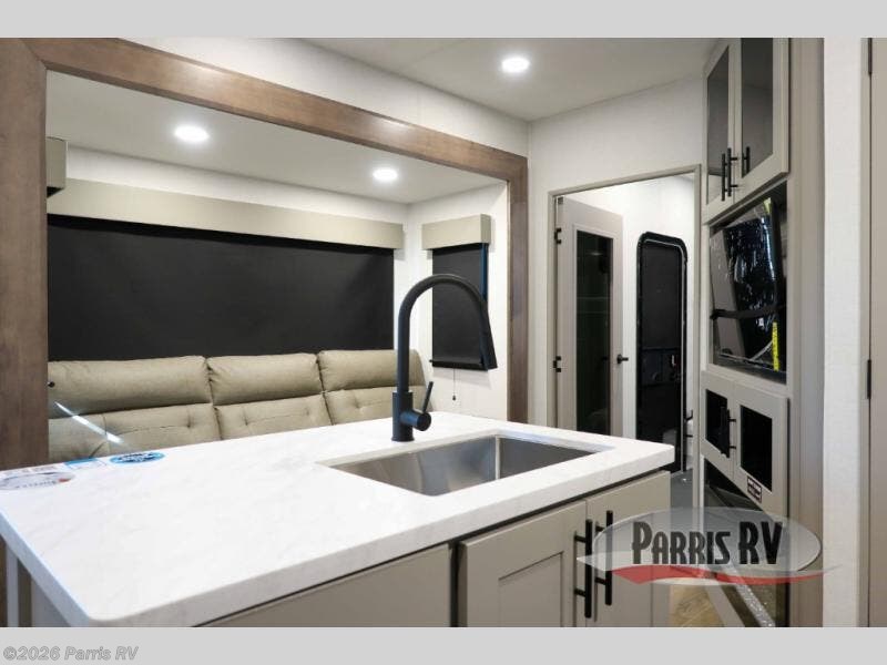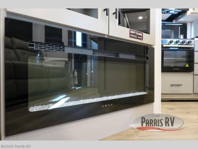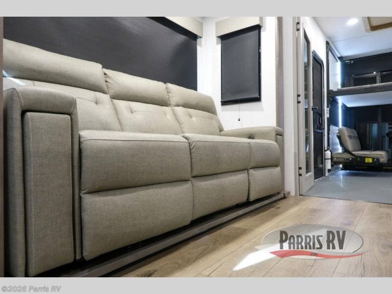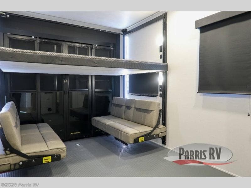 This spacious toy hauler will be perfect for a larger group since there are triple slides, creating more space, plus a bath and a half for added convenience! The full dual entry bath is found in the shared space up front with the master bedroom, and the half bath is in the garage, so you can easily get back outside where the fun is! There are also 60" sofas in the garage, along with a HappiJac queen bed, plus washer and dryer prep if you plan to add these appliances. Your crew will love to spend time in the combined kitchen and living area with its dual opposing slides, spacious sofa, kitchen island, and 40" HDTV with a fireplace!