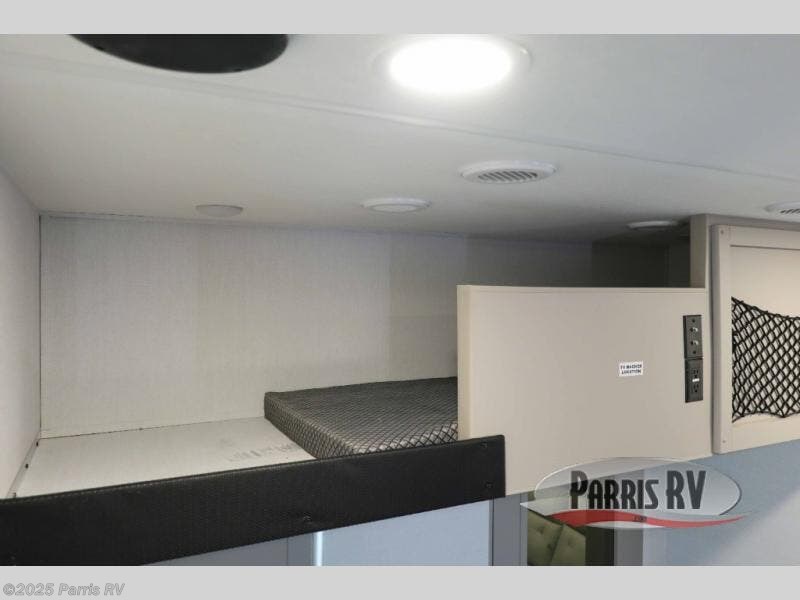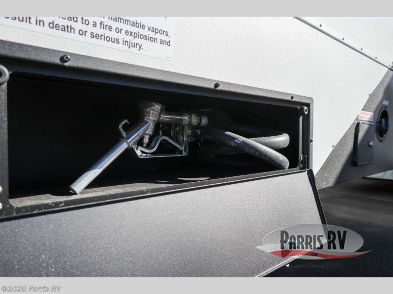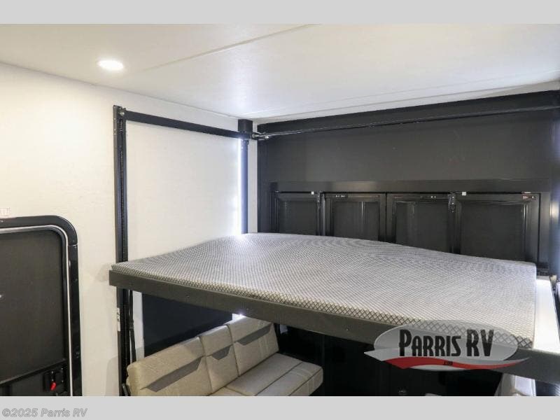 If you're needing more space for your toys, this toy hauler will meet your needs with a 14' separate garage! Once your toys are unloaded using the weather resistant ramp door, relax on the HappiJac roll-over sofas with a folding table in between, and this area can become your guests' bedroom at night since there is a drop-down queen bed, a half bath, plus an additional 30" x 72" bunk/loft bed. You will have the front bedroom all to yourselves that includes a king bed with an optional queen bed plus a wardrobe slide out to keep your space tidy. Everyone can meet in the main living area/kitchen for movie night with the HDTV and sofa slide out, while the chef of makes dinner on the three burner cooktop. There is also a hutch and pantry for storage and a kitchen island for more counter space!