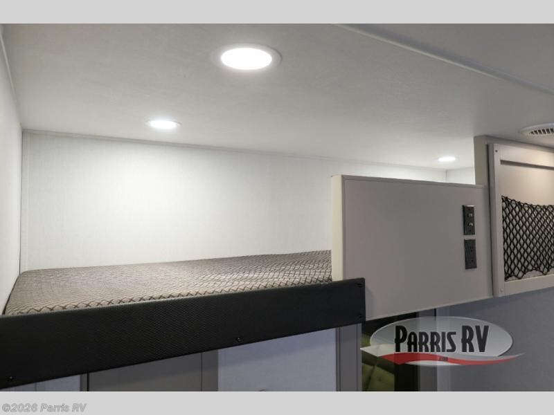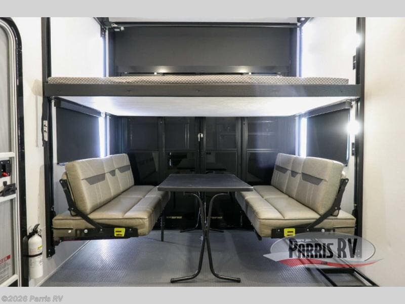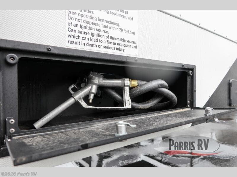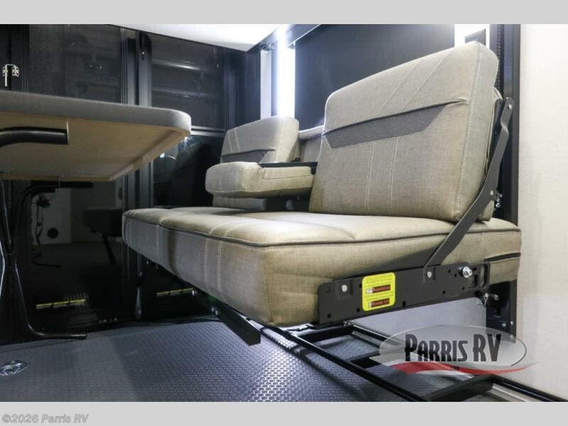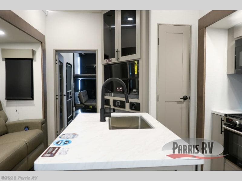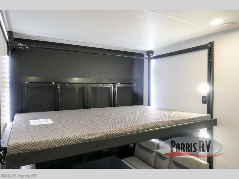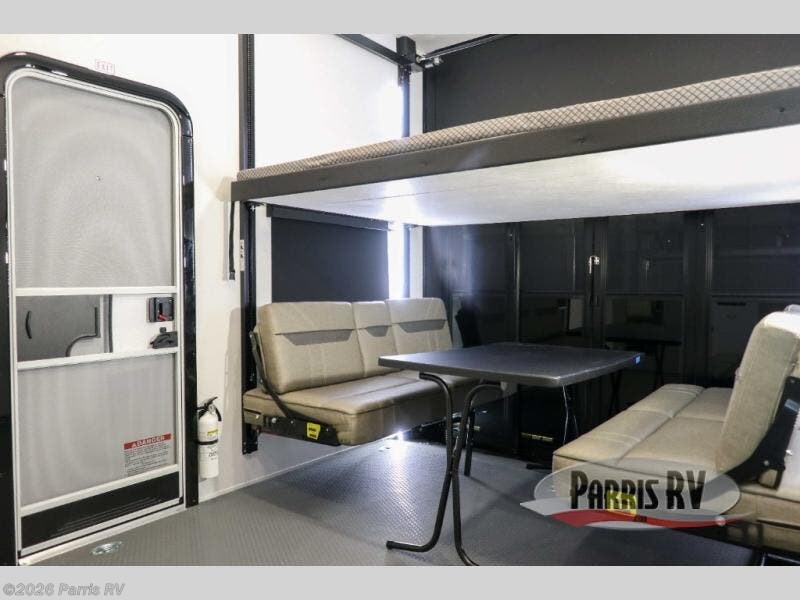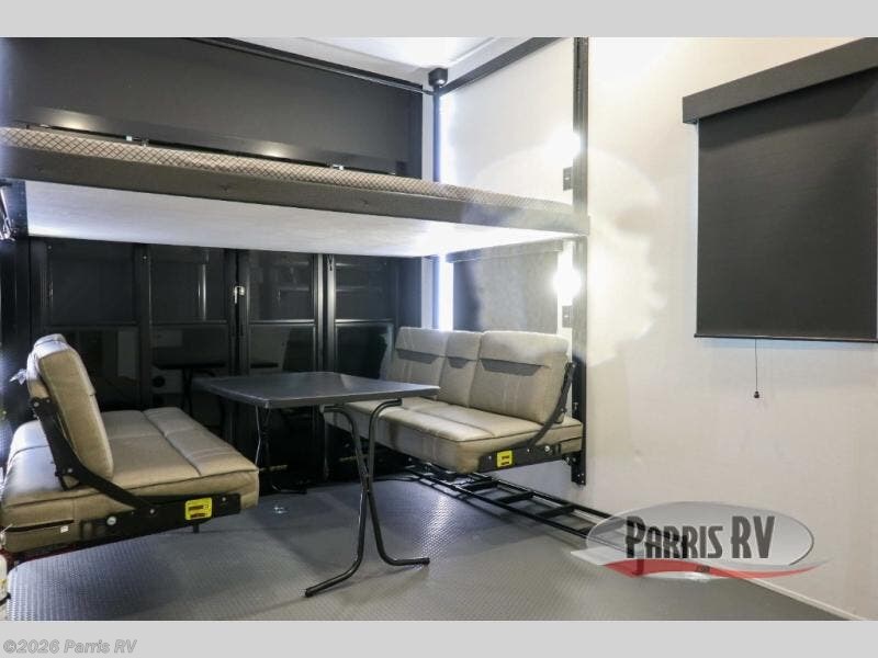 If you're needing more space for your toys, this toy hauler will meet your needs with a 14' separate garage! Once your toys are unloaded using the weather resistant ramp door, relax on the HappiJac roll-over sofas with a folding table in between, and this area can become your guests' bedroom at night since there is a drop-down queen bed, a half bath, plus an additional 30" x 72" bunk/loft bed. You will have the front bedroom all to yourselves that includes a king bed with an optional queen bed plus a wardrobe slide out to keep your space tidy. Everyone can meet in the main living area/kitchen for movie night with the HDTV and sofa slide out, while the chef of makes dinner on the three-burner cooktop. There is also a hutch and pantry for storage and a kitchen island for more counter space!