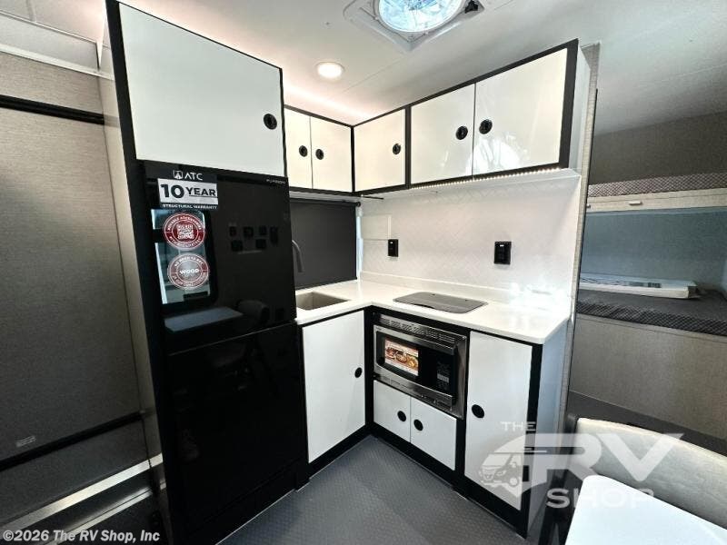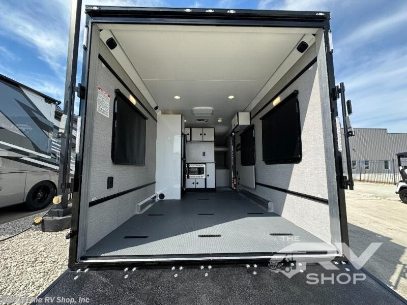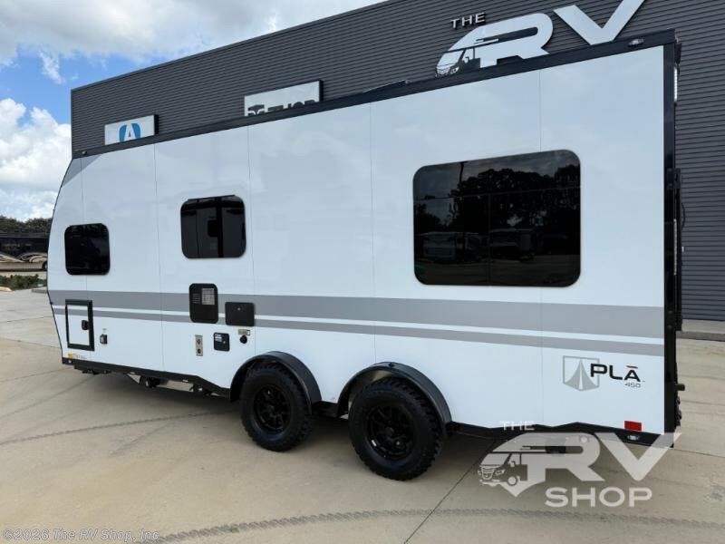 With any PLA 450 toy hauler travel trailer by ATC Trailers, you will enjoy lightweight towing and a configurable garage space for your toys, gear, and more! The all-aluminum and composite construction features no wood so you won't have to worry about rot, and the All-Weather Protection Package means you can extend your camping season. There is a 200-watt solar panel with a solar port, a heated lithium battery, plus 12V outlets to keep your adventures going. Outside, you'll find storage for your gear, a power awning with a light strip, sleek frameless dual pane tinted windows, and more convenient features. The interior is just as accommodating with decorative backsplash, configurable furniture track system, blackout roller shades, and residential solid surface countertops!
