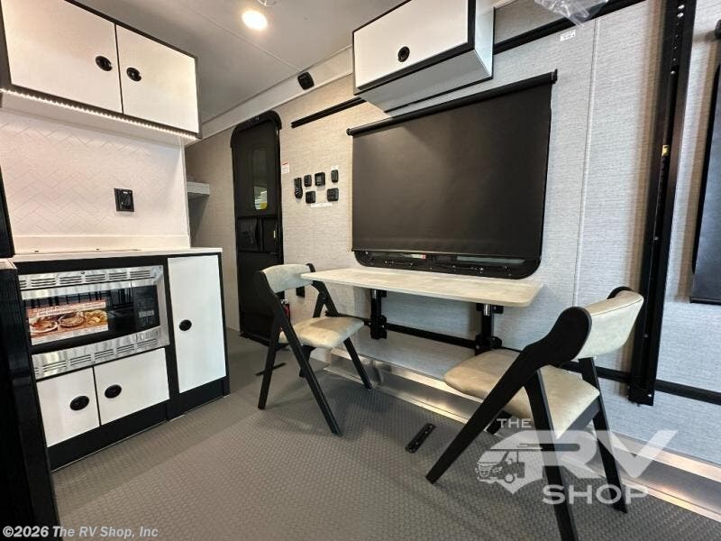 Grab your riding helmet and load up your bikes in this toy hauler! Once your toys are unloaded from the cable-less ramp door with non-slip tread, you can relax on the sofa here or make lunch in the kitchen. There is a flush mount two burner LP cooktop and a convection microwave, plus a 12V refrigerator to store leftovers. The wet bath includes a shower and porcelain toilet so you can freshen up after a trail ride, and the front bunk beds with reading lamps will let you stay up late with a good book!