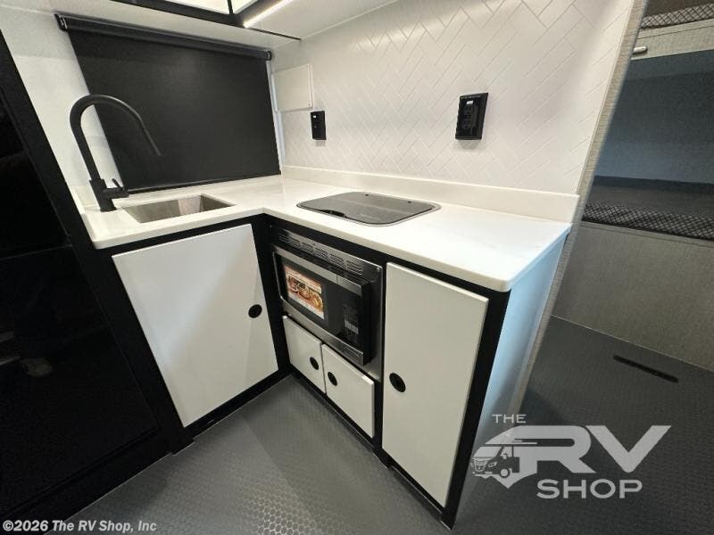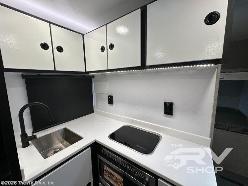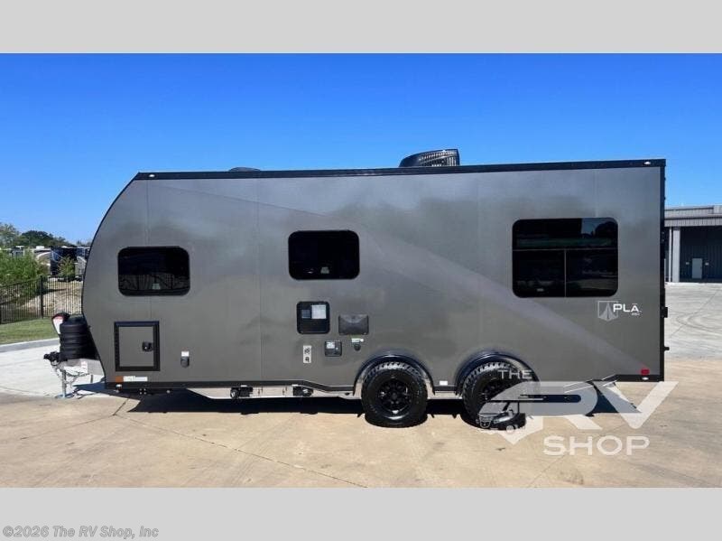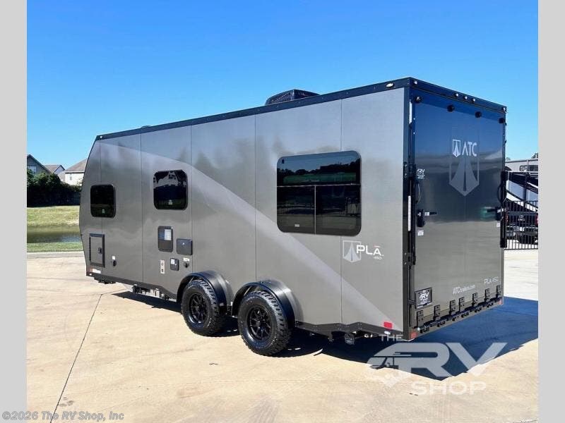 With any PLA 450 toy hauler travel trailer by ATC Trailers, you will enjoy lightweight towing and a configurable garage space for your toys, gear, and more! The all-aluminum and composite construction features no wood so you won't have to worry about rot, and the All-Weather Protection Package means you can extend your camping season. There is a 200-watt solar panel with a solar port, a heated lithium battery, plus 12V outlets to keep your adventures going. Outside, you'll find storage for your gear, a power awning with a light strip, sleek frameless dual pane tinted windows, and more convenient features. The interior is just as accommodating with decorative backsplash, configurable furniture track system, blackout roller shades, and residential solid surface countertops!