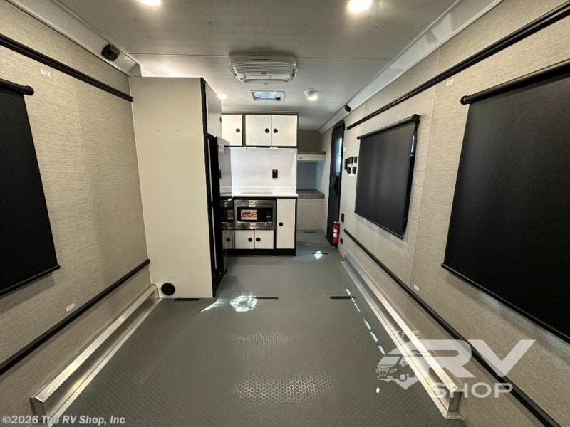 Grab your riding helmet and load up your bikes in this toy hauler! Once your toys are unloaded from the cable-less ramp door with non-slip tread, you can relax on the sofa here or make lunch in the kitchen. There is a flush mount two burner LP cooktop and a convection microwave, plus a 12V refrigerator to store leftovers. The wet bath includes a shower and porcelain toilet so you can freshen up after a trail ride, and the front bunk beds with reading lamps will let you stay up late with a good book!