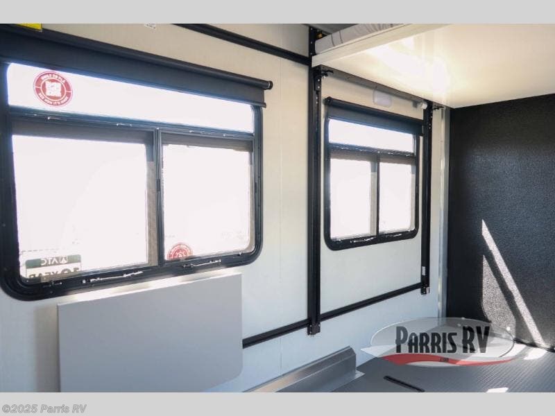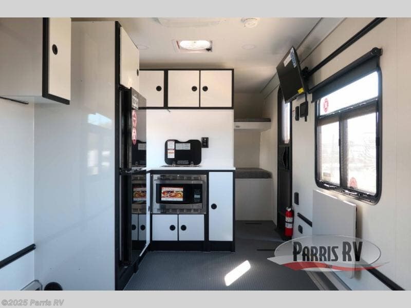 Grab your riding helmet and load up your bikes in this toy hauler! Once your toys are unloaded from the cable-less ramp door with non-slip tread, you can add an optional sleeper sofa to relax, then make lunch in the kitchen. There is a flush mount two burner LP cooktop and a convection microwave, plus a 12V refrigerator to store leftovers. The wet bath includes a shower and porcelain toilet so you can freshen up after a trail ride, and the front bunk beds will provide a great night's rest. And an optional Happijac queen bed can be added in the garage for even more sleeping space if needed!