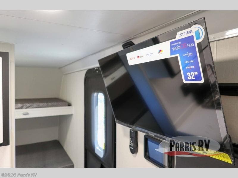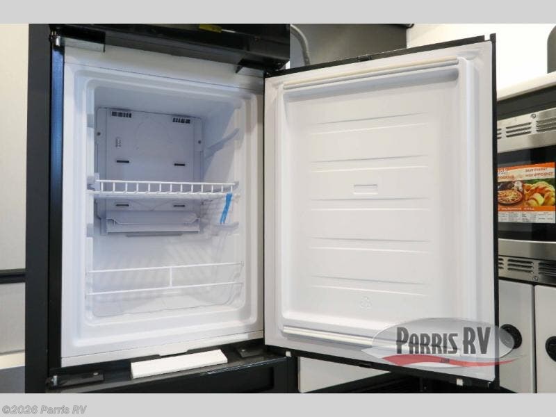 Grab your riding helmet and load up your bikes in this toy hauler! Once your toys are unloaded from the cable-less ramp door with non-slip tread, you can add an optional sleeper sofa to relax, then make lunch in the kitchen. There is a flush mount two burner LP cooktop and a convection microwave, plus a 12V refrigerator to store leftovers. The wet bath includes a shower and porcelain toilet so you can freshen up after a trail ride, and the front bunk beds will provide a great night's rest. And an optional Happijac queen bed can be added in the garage for even more sleeping space if needed!