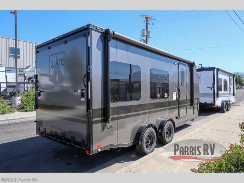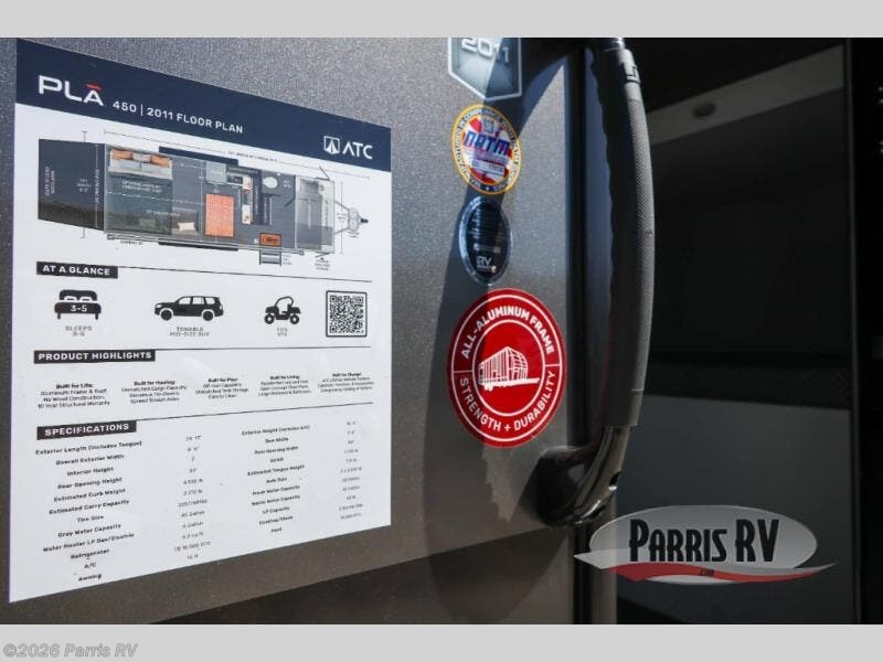 With any PLA 450 toy hauler travel trailer by ATC Trailers, you will enjoy lightweight towing and a configurable garage space for your toys, gear, and more! The all-aluminum and composite construction features no wood so you won't have to worry about rot, and the All-Weather Protection Package means you can extend your camping season. There is a 200-watt solar panel, a 100-watt inverter, and 120V/USB outlets to keep your adventures going. Outside, you'll find storage for your gear, a power awning with a light strip, sleek frameless dual pane windows, and more convenient features. The interior is just as accommodating with aluminum cabinets, dimmable can ceiling lights, configurable furniture track system, and solid surface countertops!