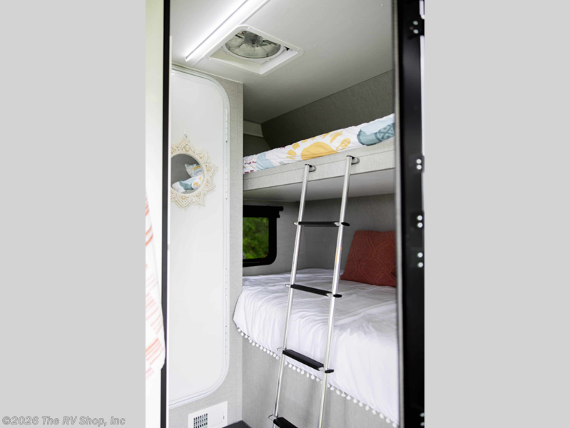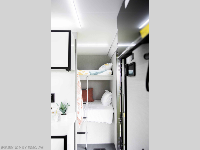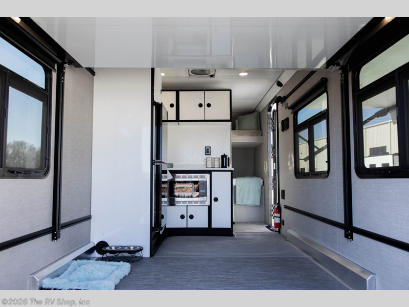 Grab your riding helmet and load up your bikes in this toy hauler! Once your toys are unloaded from the cable-less ramp door with non-slip tread, you can add an optional sleeper sofa to relax, then make lunch in the kitchen. There is a flush mount two burner LP cooktop and a convection microwave, plus a 12V refrigerator to store leftovers. The wet bath includes a shower and porcelain toilet so you can freshen up after a trail ride, and the front bunk beds will provide a great night's rest. And an optional Happijac queen bed can be added in the garage for even more sleeping space if needed!