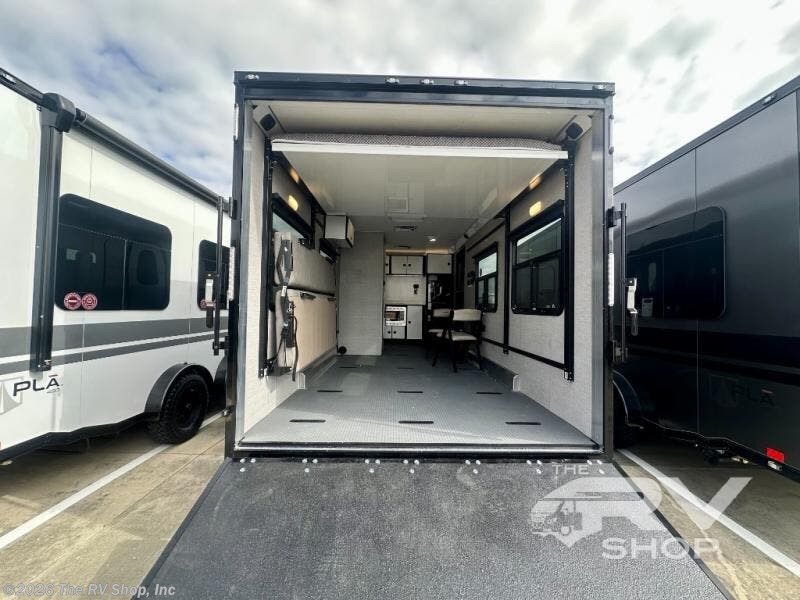 With any PLA 450 toy hauler travel trailer by ATC Trailers, you will enjoy lightweight towing and a configurable garage space for your toys, gear, and more! The all-aluminum and composite construction features no wood so you won't have to worry about rot, and the All-Weather Protection Package means you can extend your camping season. There is a 200-watt solar panel, a 100-watt inverter, and 120V/USB outlets to keep your adventures going. Outside, you'll find storage for your gear, a power awning with a light strip, sleek frameless dual pane windows, and more convenient features. The interior is just as accommodating with aluminum cabinets, dimmable can ceiling lights, configurable furniture track system, and solid surface countertops!