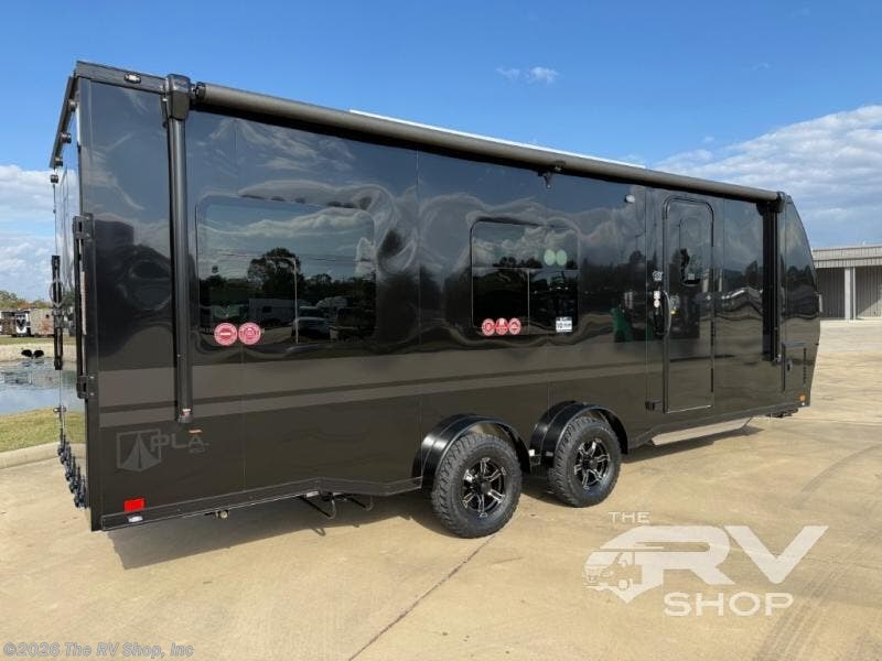 With any PLA 450 toy hauler travel trailer by ATC Trailers, you will enjoy lightweight towing and a configurable garage space for your toys, gear, and more! The all-aluminum and composite construction features no wood so you won't have to worry about rot, and the All-Weather Protection Package means you can extend your camping season. There is a 200-watt solar panel, a 100-watt inverter, and 120V/USB outlets to keep your adventures going. Outside, you'll find storage for your gear, a power awning with a light strip, sleek frameless dual pane windows, and more convenient features. The interior is just as accommodating with aluminum cabinets, dimmable can ceiling lights, configurable furniture track system, and solid surface countertops!