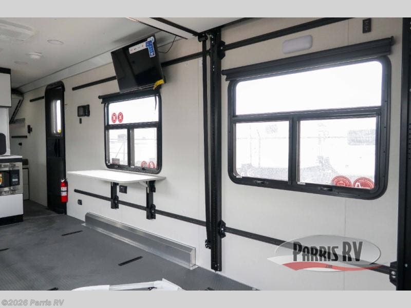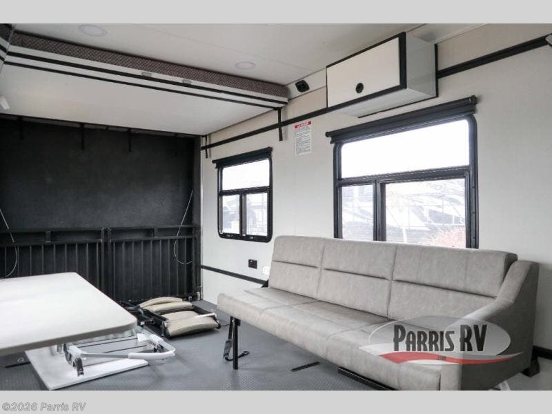 This toy hauler travel trailer is perfect for outdoor enthusiasts and thrill-seekers. The 15' garage is the ideal space for hauling your favorite toys, whether it's ATVs, dirt bikes, or kayaks. With plenty of room to store your gear, you'll be ready for whatever adventure comes your way. Enjoy cooking up a storm with the cooktop, microwave, and fridge. The sink provides a convenient spot for cleaning up after a long day of play. The wet bath is a practical and efficient space for getting cleaned up, and the bunk beds provide a comfortable spot to rest and relax after a long day of play.