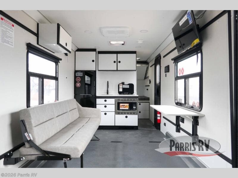With any PLA 450 toy hauler travel trailer by ATC Trailers, you will enjoy lightweight towing and a configurable garage space for your toys, gear, and more! The all-aluminum and composite construction features no wood so you won't have to worry about rot, and the All-Weather Protection Package means you can extend your camping season. There is a 200-watt solar panel, a 100-watt inverter, and 120V/USB outlets to keep your adventures going. Outside, you'll find storage for your gear, a power awning with a light strip, sleek frameless dual pane windows, and more convenient features. The interior is just as accommodating with aluminum cabinets, dimmable can ceiling lights, configurable furniture track system, and solid surface countertops!