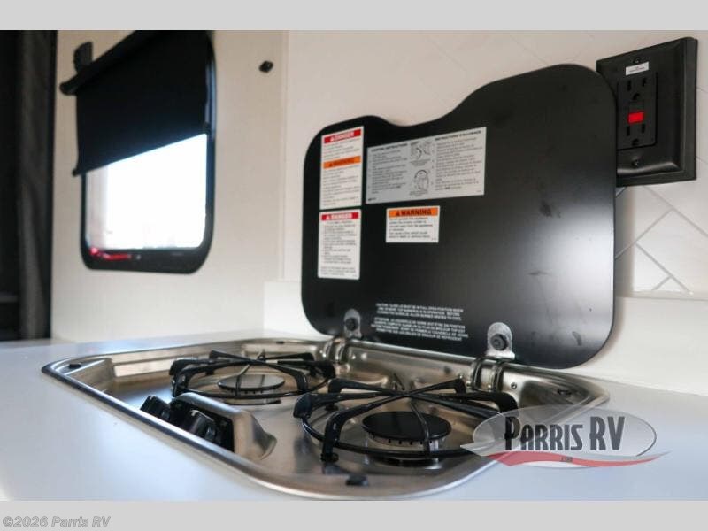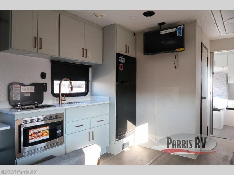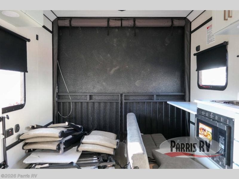 Time spent in this toy hauler will be time well spent! There is 11' 7" total garage space for your toys plus a cableless rear ramp door for easy unloading. You can whip up a meal on the LP two burner cooktop or in the convection microwave when you get back from trail riding, and the 10-cu. ft. 12V refrigerator will keep your food fresh. There is also a dinette table with four folding chairs where you can dine together. A full bath lets you clean up before bed, and you'll find a front private bedroom with a queen bed for all-around comfort!