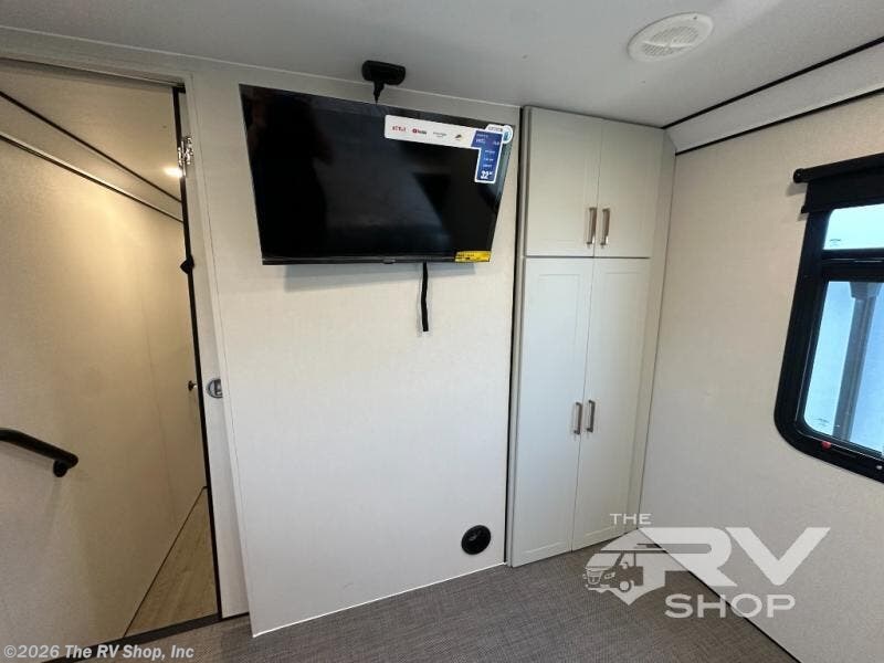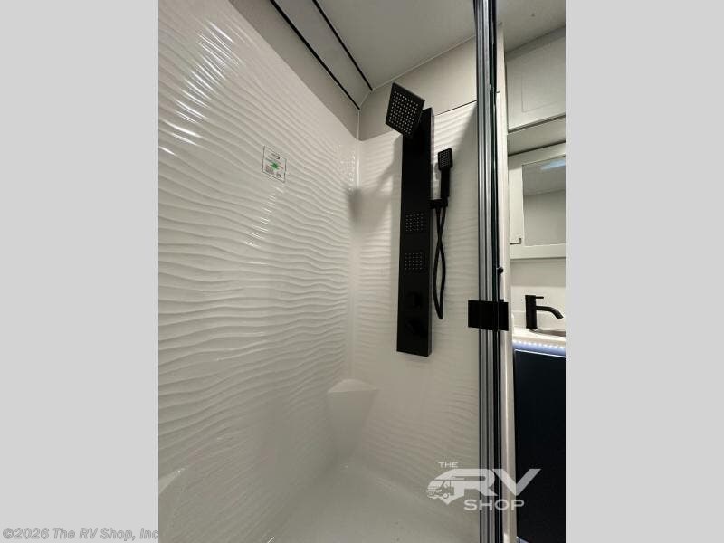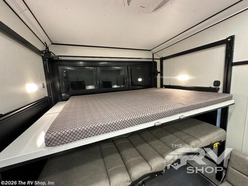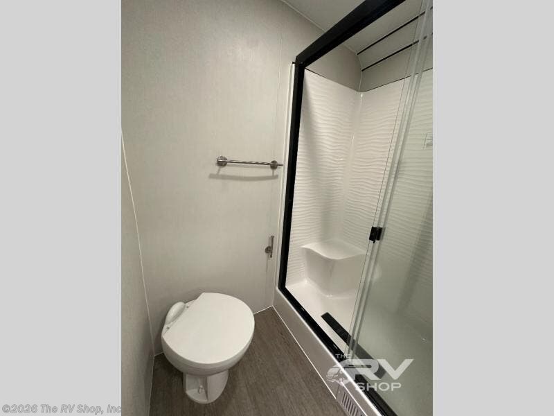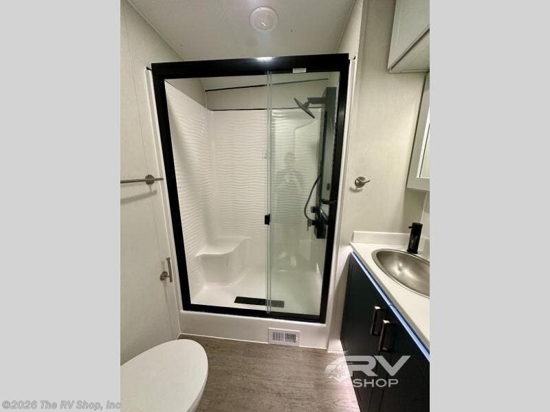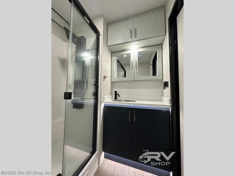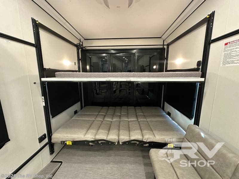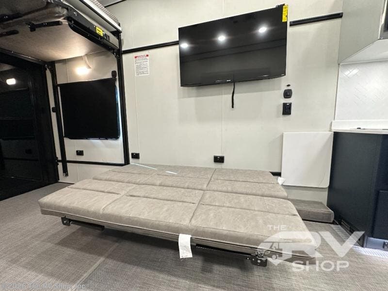 Start a new adventure in this spacious toy hauler that can sleep 2-10 depending on the options you choose to add! Once your toys are unloaded using the cableless rear ramp door, you can head out on a trail or two. You'll find a residential queen bed with storage in the front bedroom, along with storage space for your things and TV prep if you want to add a television. The full bath includes a spa/jet shower fixture that is sure to be nice after a day of riding the trails, and there is a glass shower door for added luxury. Head to the kitchen where you can whip up a meal for your crew on the LP three burner cooktop or in the convection microwave, and you can dine at the dinette with four chairs. If you'd like to get some fresh air, take your plate outdoors to sit under the power awning with a light strip!