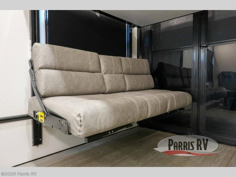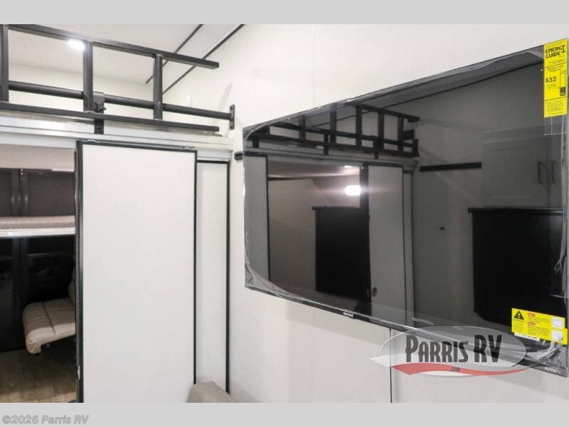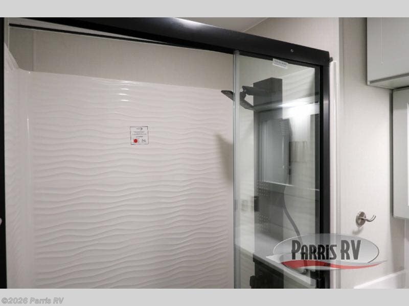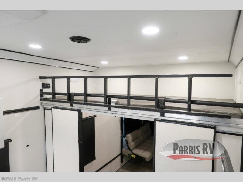 Start a new adventure in this spacious toy hauler that can sleep 2-16 depending on the options you choose to add! Once your toys are unloaded using the cableless rear ramp door, you can head out on a trail or two. You'll find a residential queen bed with storage in the front bedroom, along with a large front closet and TV prep if you want to add a television. The full bath includes a spa/jet shower fixture that is sure to be nice after a day of riding the trails, and there is a glass shower door for added luxury. Head to the kitchen where you can whip up a meal for your crew on the LP three burner cooktop or in the convection microwave, and you can dine at the dinette with four chairs. If you'd like to get some fresh air, take your plate outdoors to sit under the power awning with a light strip!