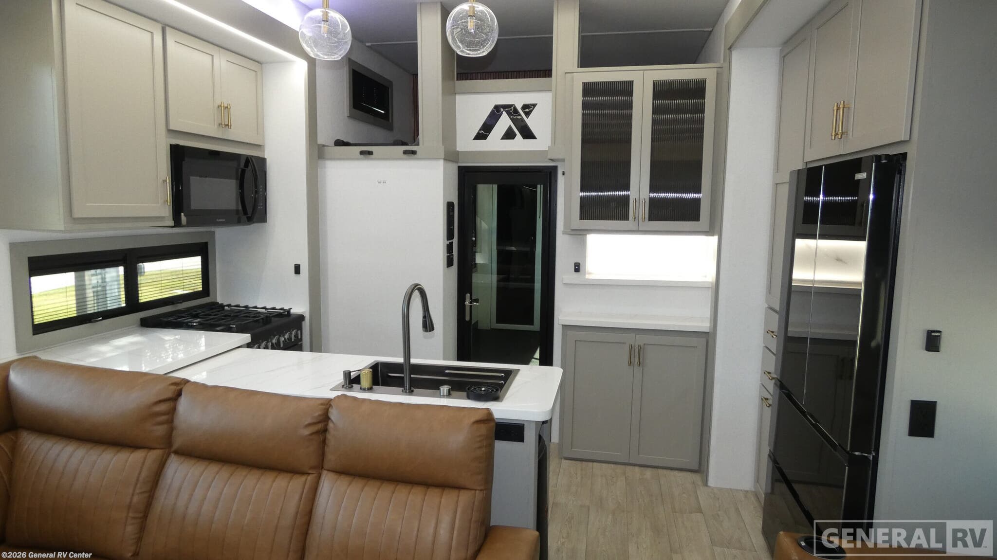 Axiom RV Vendetta toy hauler V4250 highlights: Four Slide Outs L-Shaped Sofa King Bed Tilt Bath and a Half 14' 6" Garage Load up your motorcycles or side-by-side for fun adventures at the campground! There is a 14' 6" garage with one of the dual entry doors to the unit, along with a 60" x 100" mega bed, half bath, fold-down garage sink, plus a loft for even more sleeping space. As you head into the kitchen and living room, you'll find an island peninsula for ample counter space, a large sofa within the slide out, plus an L-shaped sofa with a patent-pending AX ottoman/table. The full bath is right next to the front private bedroom, complete with a king bed tilt and large slide out with generous storage space! With any Vendetta toy hauler fifth wheel by Axiom RV, you will find innovation and comfort at every turn! The Curt Touring Coil Suspension System with a Curt pin box will provide smooth towing from home to campground, and the deluxe graphics with marine grade fiberglass exterior is sure to be eye-catching. These features are found within the Lux Package, along with a Pathfinder lighting system with integrated turn signals, Lippert solid step triple entry steps, and a low alloy steel construction that is stronger than the competition! The Essential Package features a Lippert 6-point hydraulic leveling system to have you set up at camp in no-time, and the 200-watt solar panel with a 2000-watt inverter provides off-grid capabilities. Solid surface kitchen countertops are included with the AX Comfort Package, along with a Fogotti on-demand water heater, a freedom pass-through storage, Starlink internet prep, and hardwood cabinet doors with slow close hidden hinges.