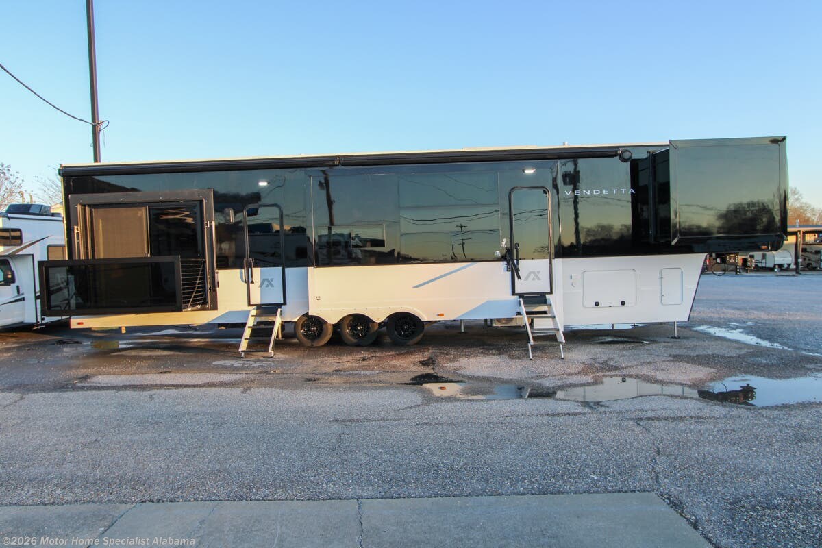 - 12V Heat Pads on All Tanks Shop hundreds of fifth wheels at MHSRV! Choose from top brands including Alliance Paradigm – Avenue – Grand Design Solitude – Reflection – Keystone Montana – Alpine – Cougar – Forest River Cedar Creek – Riverstone – Cardinal – Jayco North Point – Pinnacle and more. We also buy and sell quality pre-owned models such as Vanleigh Vilano – Beacon – DRV Mobile Suites – KZ Durango Gold – Highland Ridge Open Range – Redwood RV – Coachmen Chaparral – Arctic Wolf – Sabre and many more. Visit for our complete line-up and the sale prices that have made us the #1 volume-selling motor home dealership in the world 12 years in a row! About This RV This luxury 5th Wheel RV measures approximately 47 feet 2 inches in length with the Vendetta LUX package, Vendetta Essential package, AX Comfort package & much more About Us For more details on this unit, our full inventory, brochures, window stickers, videos, photos, and customer reviews, visit or call 800-335-6054 for the Texas location or 334-288-0331 for our Alabama location. At Motor Home Specialist, we never charge prep or orientation fees. Every new RV sale includes a multi-point inspection, full interior and exterior detail. At our Texas location we also offer a high-pressure rain booth test—an exclusive service in the industry. You'll also receive a comprehensive coach orientation with an MHSRV technician and a complimentary night in our delivery park with full hook-ups at our Texas Location. --Why Pay More? Why Settle for Less?—