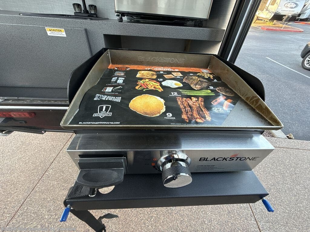 Pack your bags and head for the hills in this easy-to-tow trailer for two! The full outside kitchen includes everything you need to prepare meals each day, and there is an outside shower to fill the dogs water bowl or wash off your hiking boots. Head inside to rest on the mattress with storage below, or maybe just relax by the fireplace! This model also includes a countertop with storage below, a 110V floor mounted A/C and a furnace to help extend your camping season, and a vent to keep fresh air moving inside.