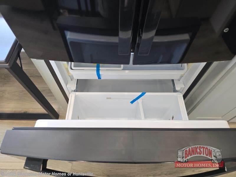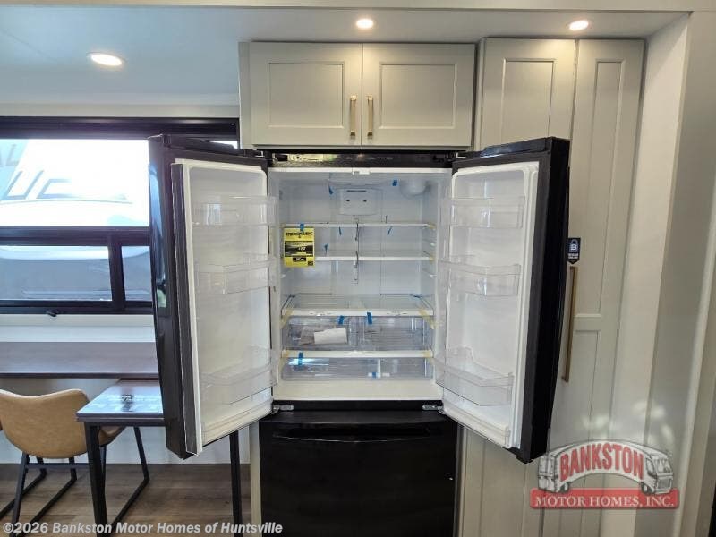You can't imagine how much this toy hauler has to offer! The garage/outdoor kitchen/office space will allow you to utilize the garage how you need it, plus there is an adjustable tie-down system, as well as a loft for storage and a twin bed to sleep more campers! The garage patio with a 1,500 lb. capacity is another feature you are sure to love, especially with its own awning to keep you protected from the elements. Head to the kitchen to prepare meals with a 24" GE oven with a four burner range, a GE microwave with an air fryer, plus a spacious GE Energy Star 19 cu. ft. refrigerator. The island with two stools will let others visit with you while you cook, and there are even dog bowls to easily feed Frodo. You'll find the convertible dining table/L-desk will be accommodating since it can be use to dine at, and to get some work done. You may just find yourselves spending most of your time on the L-sofa in front of the entertainment center with a TV, fireplace and storage. A full bath is up front by the bedroom, and here you'll find a 30" x 42" shower and and pull-out linen storage with a trash bin to keep towels ready to use. After a day outdoors you'll love nothing more than coming back to your own bedroom with a king bed slide out, TV, a walk-in closet, and many more storage spaces. And we haven't even touched on the exterior features, like the 3-way pass-through storage, three power awnings, an air compressor to fill up tires, and the list goes on and on! This is a pre-production preview, all features and layout placement subject to change.