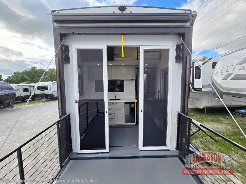 With any Model G toy hauler fifth wheel by Brinkley you will enjoy luxurious amenities, tons of storage space, and innovative features that have been developed and tested in the real world. Durable construction includes an industry leading PDI process, an industry best insulation package, and reinforced and walkable slide roofs. Some of the exterior features you'll find are a 3-way pass-through with a multi-functional flip-up bulkhead wall, under I-beam storage, a MAX-Vision reverse lighting system, and a low-maintenance roof to name a few. A Rockford Fosgate audio system comes standard, along with a Full app-based coach control system (iOS & Android) that lets you control your fifth wheel's functions right from your mobile device. You will find the solar system with a designated storage area to be ultra convenient, plus there is a FlexPower 5500 with a dual fuel inverter generator for all your power needs. Head inside to find a residential interior with Brinkley's CraftSense wood trim construction, floating entrance steps, integrated window screens and insulated blackout blinds, and residential solid surface countertops plus backsplash. You will also enjoy the neon shower lighting and recessed medicine cabinets in the bath, plus motion activated LED bed lights and dual bedside outlets in the bedroom. Choose a Model G toy hauler fifth wheel to experience all the luxury it has to offer!