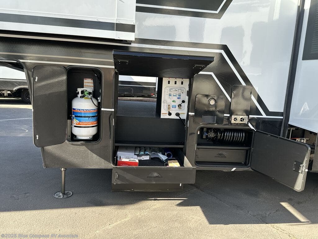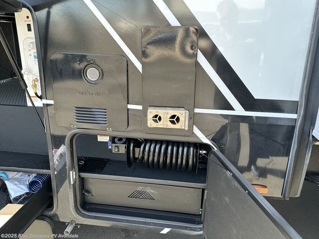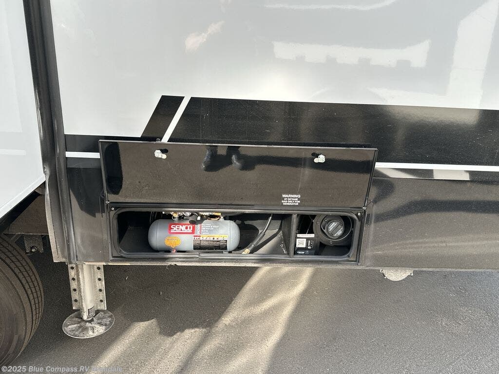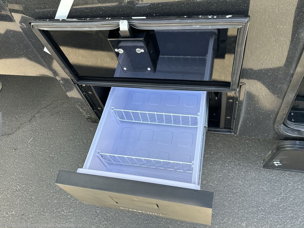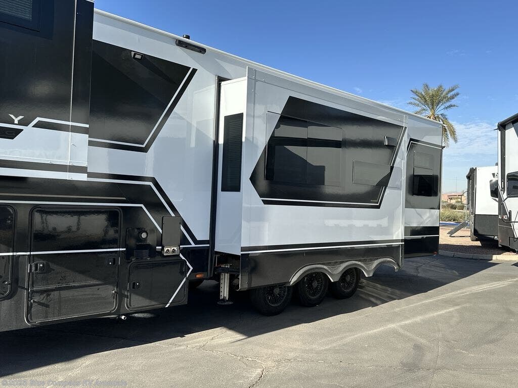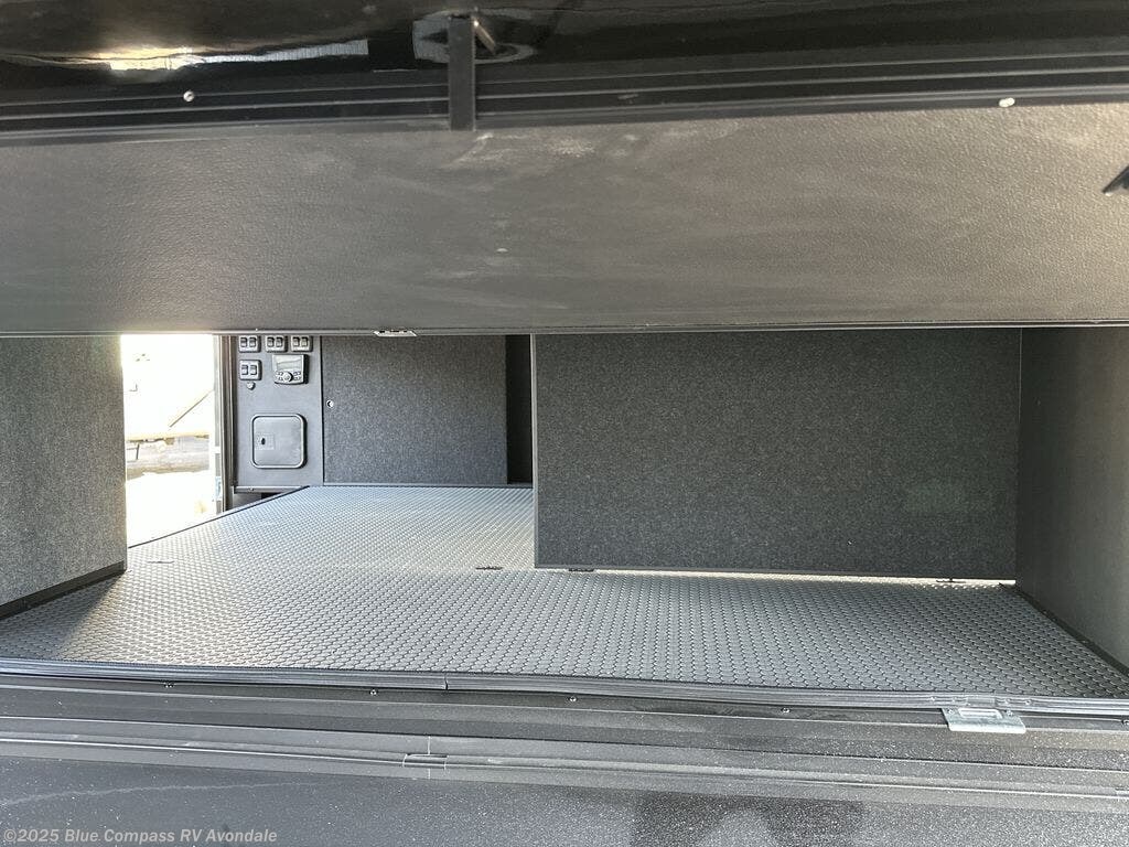 You can't imagine how much this toy hauler has to offer! The garage/outdoor kitchen/office space will allow you to utilize the garage how you need it, plus there is an adjustable tie-down system, as well as a loft for storage and a twin bed to sleep more campers! The garage patio with a 1,500 lb. capacity is another feature you are sure to love, especially with its own awning to keep you protected from the elements. Head to the kitchen to prepare meals with a 24" GE oven with a four burner range, a GE microwave with an air fryer, plus a spacious GE Energy Star 19 cu. ft. refrigerator. The island with two stools will let others visit with you while you cook, and there are even dog bowls to easily feed Frodo. You'll find the convertible dining table/L-desk will be accommodating since it can be use to dine at, and to get some work done. You may just find yourselves spending most of your time on the L-sofa in front of the entertainment center with a TV, fireplace and storage. A full bath is up front by the bedroom, and here you'll find a 30" x 42" shower and and pull-out linen storage with a trash bin to keep towels ready to use. After a day outdoors you'll love nothing more than coming back to your own bedroom with a king bed slide out, TV, a walk-in closet, and many more storage spaces. And we haven't even touched on the exterior features, like the 3-way pass-through storage, three power awnings, an air compressor to fill up tires, and the list goes on and on! This is a pre-production preview, all features and layout placement subject to change.