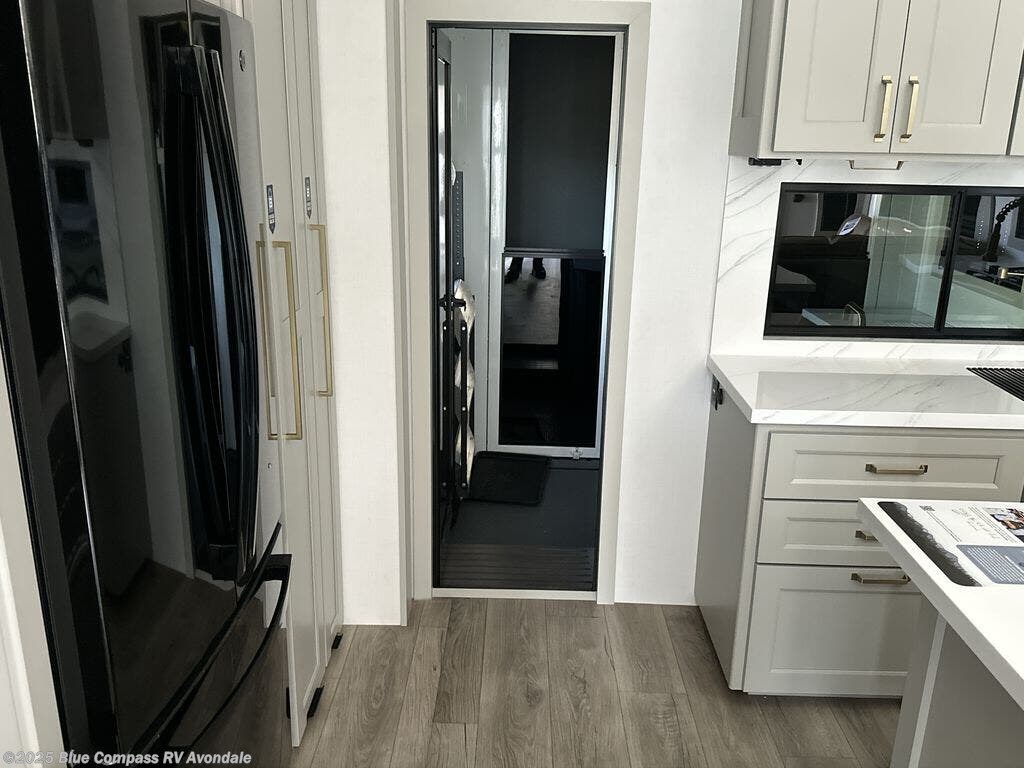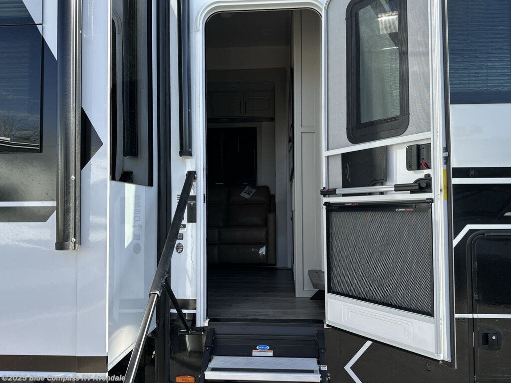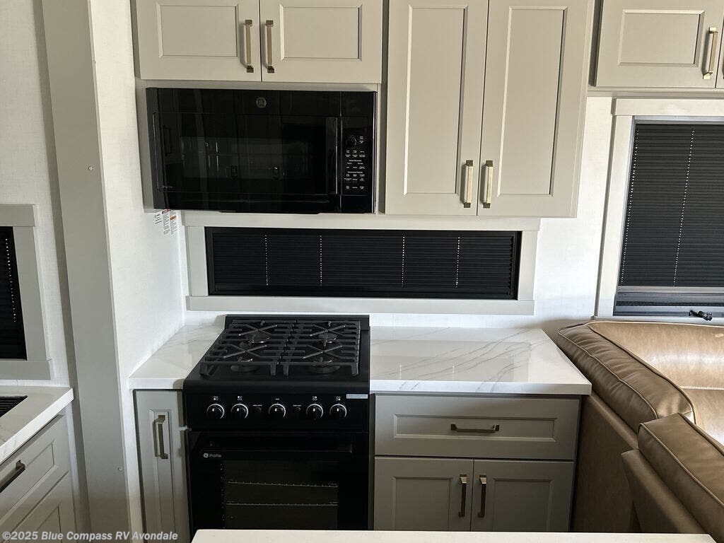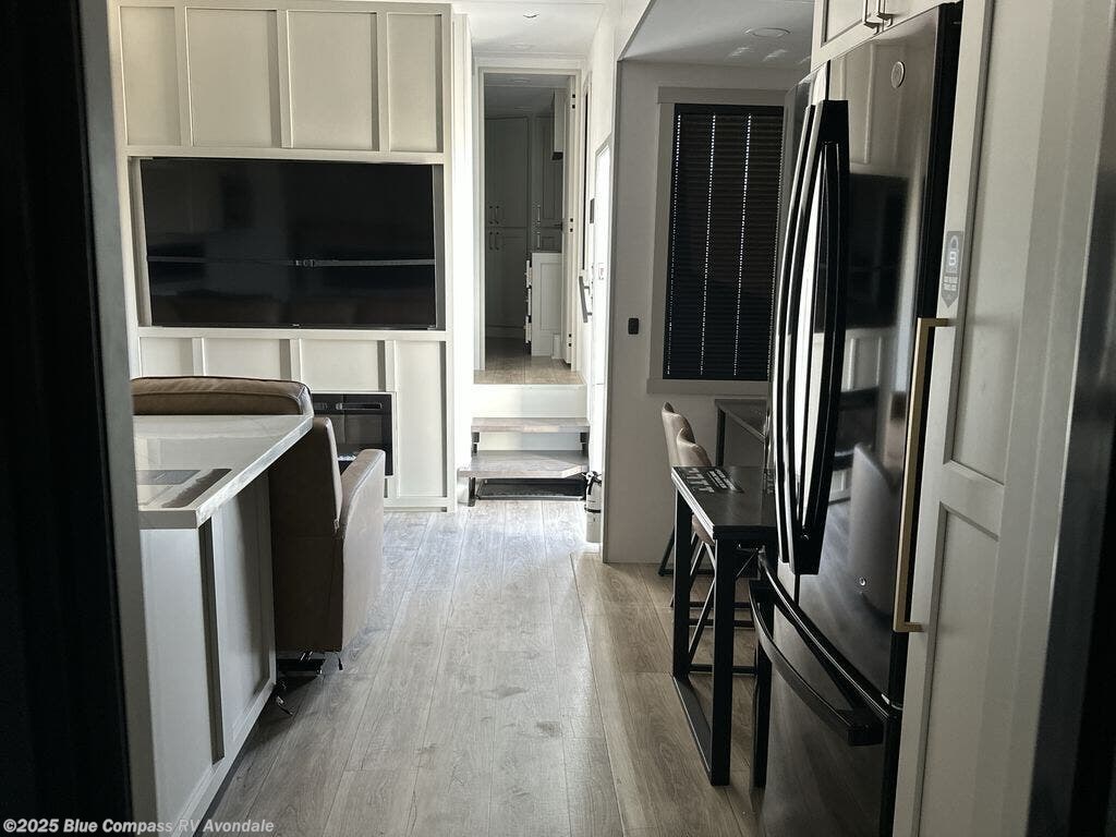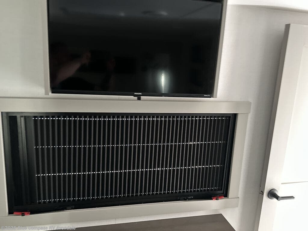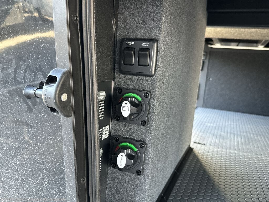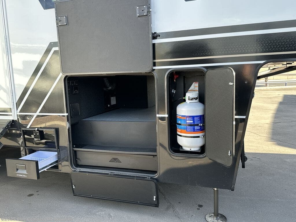 You can't imagine how much this toy hauler has to offer! The garage/outdoor kitchen/office space will allow you to utilize the garage how you need it, plus there is an adjustable tie-down system, as well as a loft for storage and a twin bed to sleep more campers! The garage patio with a 1,500 lb. capacity is another feature you are sure to love, especially with its own awning to keep you protected from the elements. Head to the kitchen to prepare meals with a 24" GE oven with a four burner range, a GE microwave with an air fryer, plus a spacious GE Energy Star 19 cu. ft. refrigerator. The island with two stools will let others visit with you while you cook, and there are even dog bowls to easily feed Frodo. You'll find the convertible dining table/L-desk will be accommodating since it can be use to dine at, and to get some work done. You may just find yourselves spending most of your time on the L-sofa in front of the entertainment center with a TV, fireplace and storage. A full bath is up front by the bedroom, and here you'll find a 30" x 42" shower and and pull-out linen storage with a trash bin to keep towels ready to use. After a day outdoors you'll love nothing more than coming back to your own bedroom with a king bed slide out, TV, a walk-in closet, and many more storage spaces. And we haven't even touched on the exterior features, like the 3-way pass-through storage, three power awnings, an air compressor to fill up tires, and the list goes on and on! This is a pre-production preview, all features and layout placement subject to change.