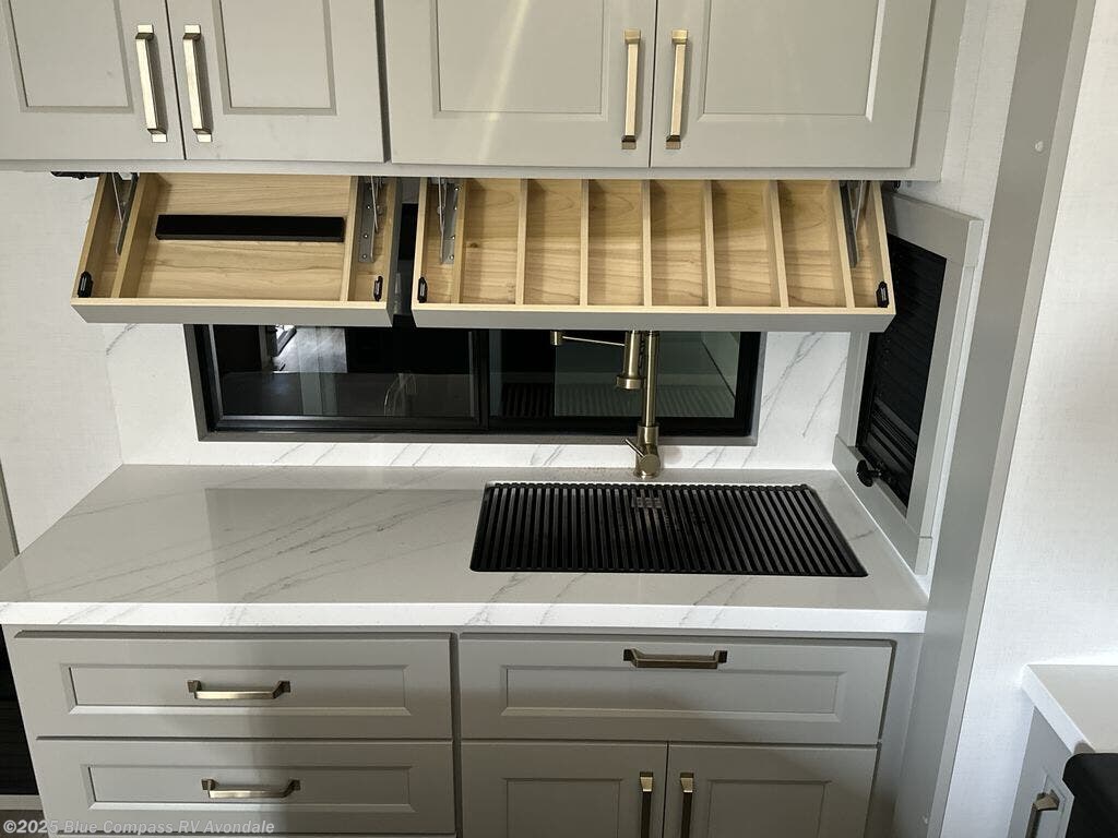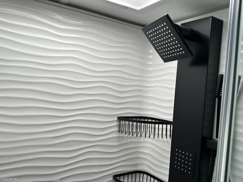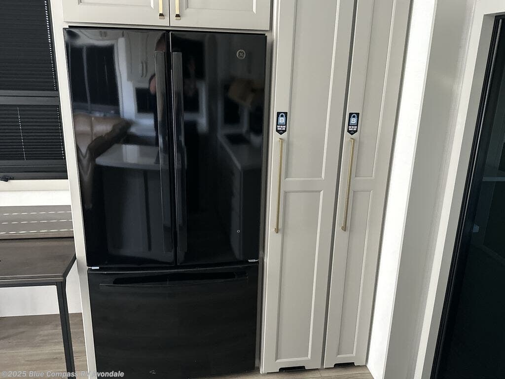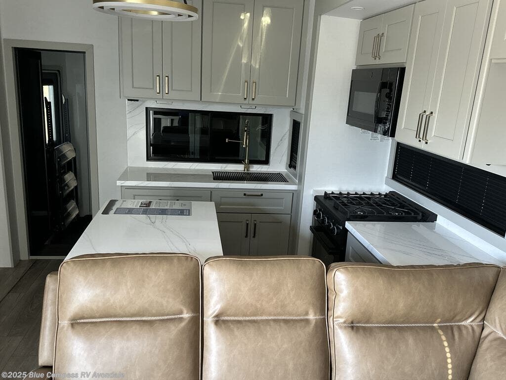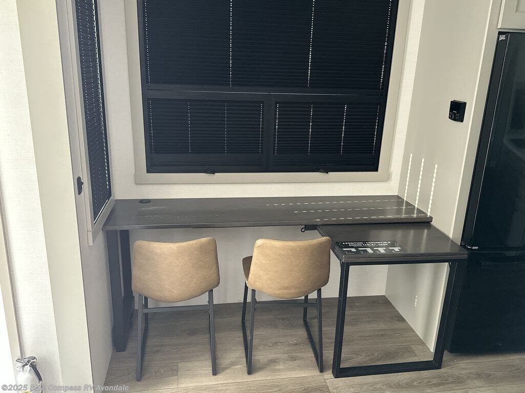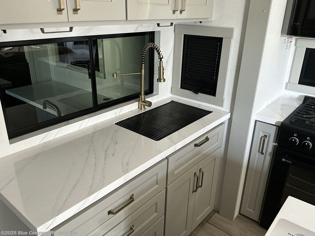 You can't imagine how much this toy hauler has to offer! The garage/outdoor kitchen/office space will allow you to utilize the garage how you need it, plus there is an adjustable tie-down system, as well as a loft for storage and a twin bed to sleep more campers! The garage patio with a 1,500 lb. capacity is another feature you are sure to love, especially with its own awning to keep you protected from the elements. Head to the kitchen to prepare meals with a 24" GE oven with a four burner range, a GE microwave with an air fryer, plus a spacious GE Energy Star 19 cu. ft. refrigerator. The island with two stools will let others visit with you while you cook, and there are even dog bowls to easily feed Frodo. You'll find the convertible dining table/L-desk will be accommodating since it can be use to dine at, and to get some work done. You may just find yourselves spending most of your time on the L-sofa in front of the entertainment center with a TV, fireplace and storage. A full bath is up front by the bedroom, and here you'll find a 30" x 42" shower and and pull-out linen storage with a trash bin to keep towels ready to use. After a day outdoors you'll love nothing more than coming back to your own bedroom with a king bed slide out, TV, a walk-in closet, and many more storage spaces. And we haven't even touched on the exterior features, like the 3-way pass-through storage, three power awnings, an air compressor to fill up tires, and the list goes on and on! This is a pre-production preview, all features and layout placement subject to change.